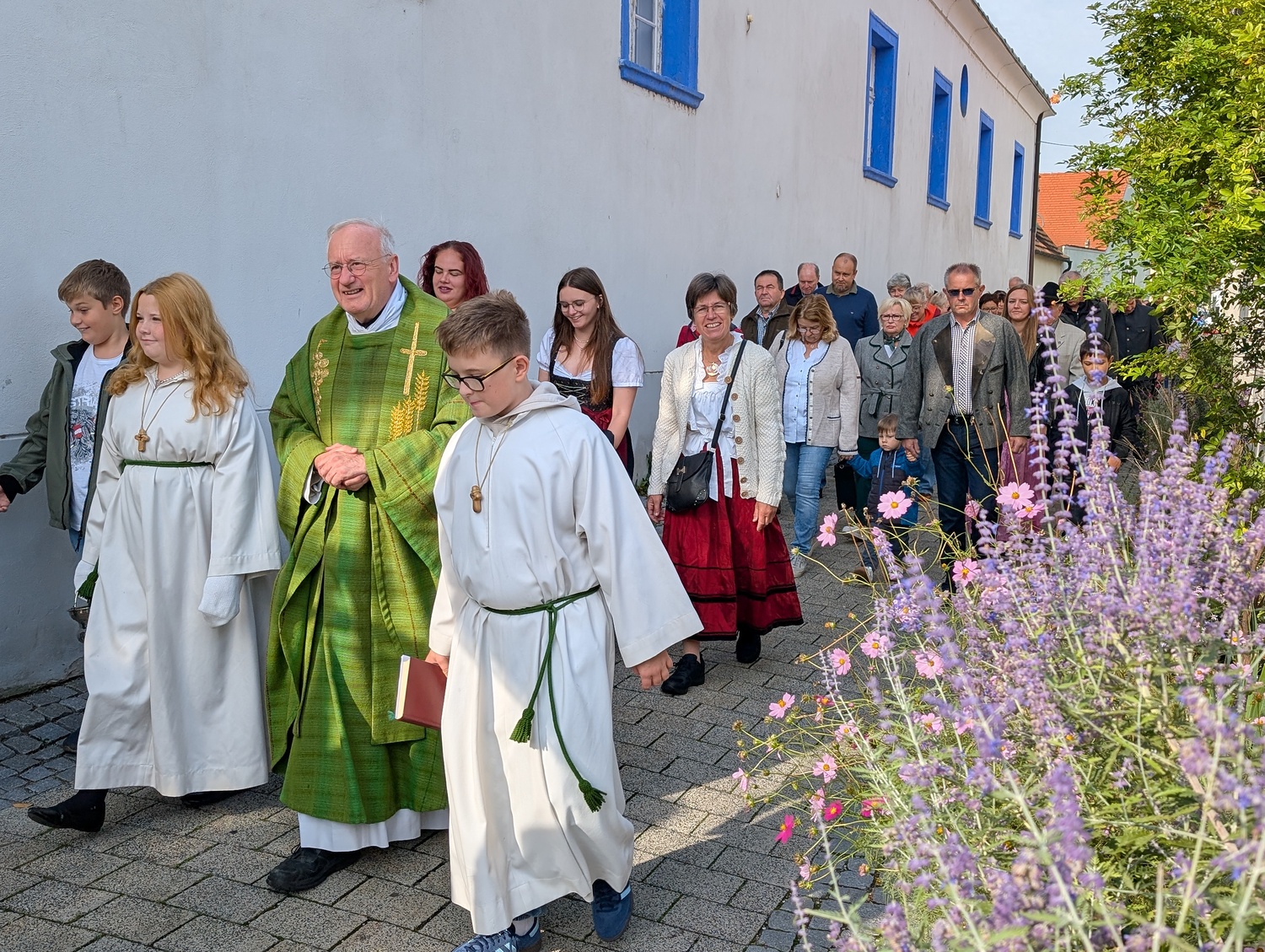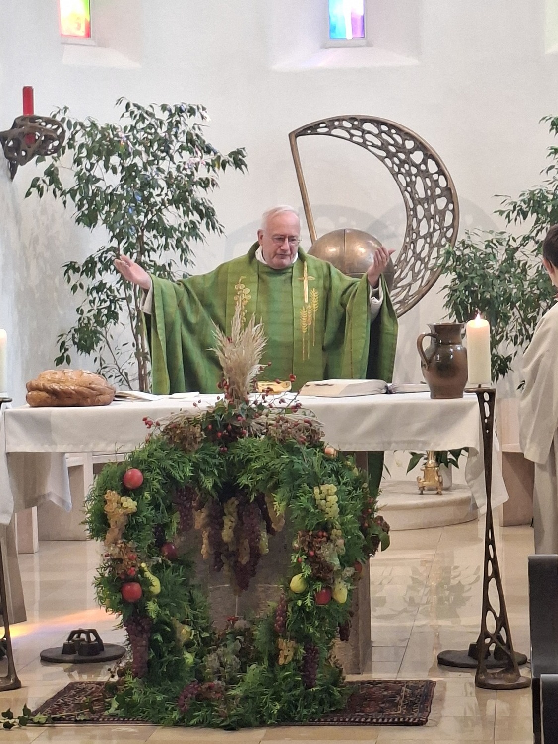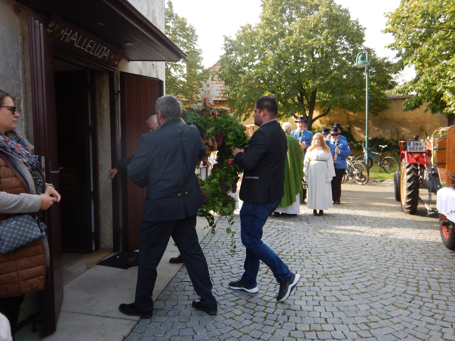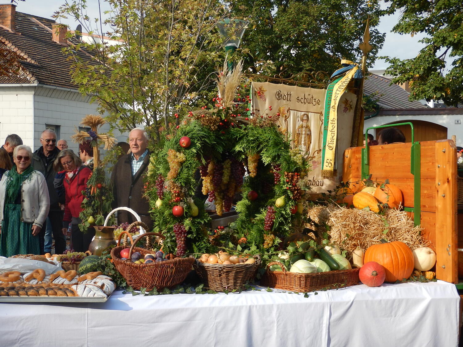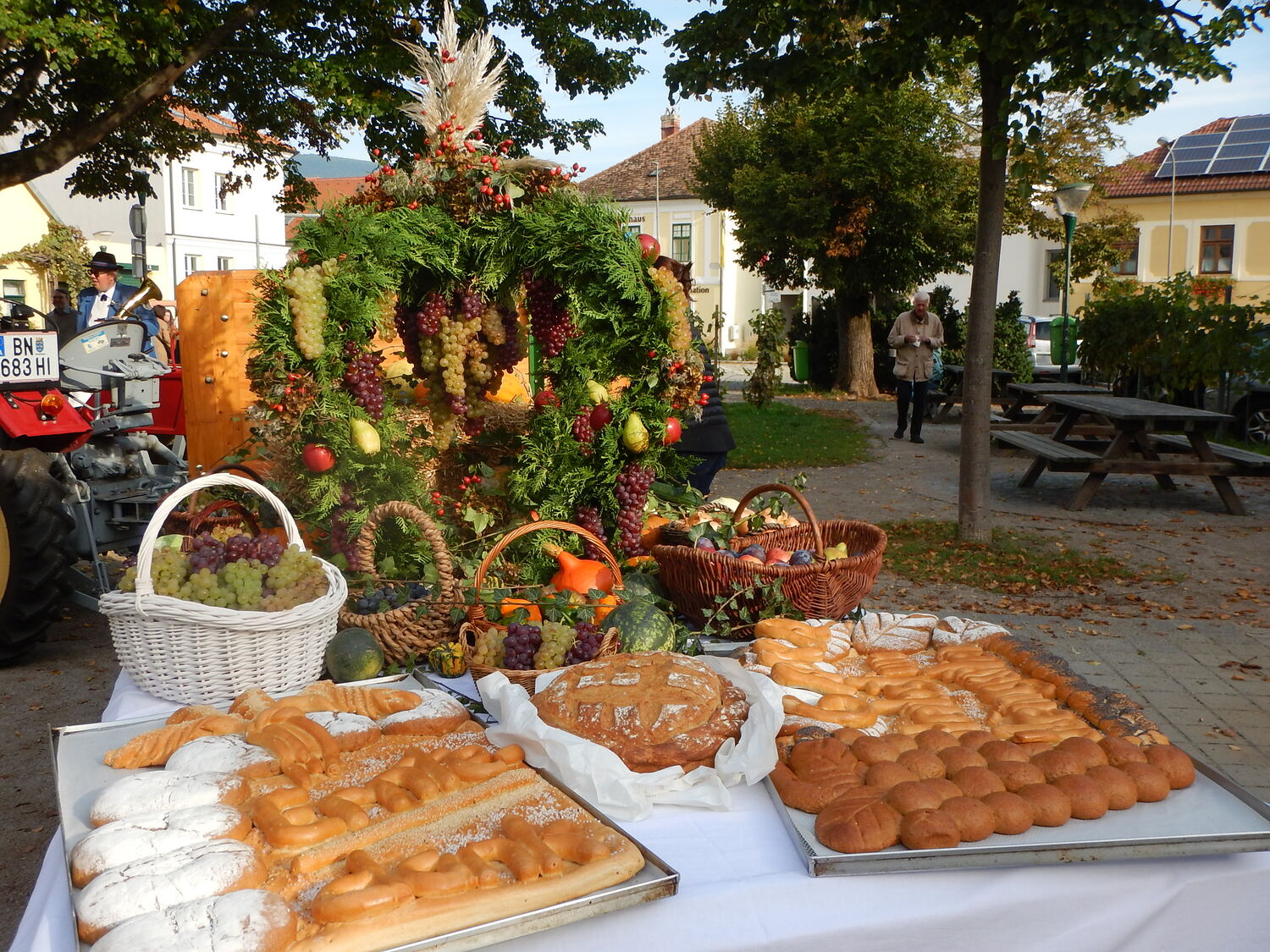 Die Winzerinnen unseres Ortes schmückten die Erntekrone und den Wagen wunderschön mit Obst, Gemüse, Brot und Wein. Am Hauptplatz wurde die Krone feierlich gesegnet und in Prozession zur Kirche gebracht, musikalisch begleitet vom Musikverein. In der Kirche wurde der Dankgottesdienst gefeiert, mit musikalische Unterstützung vom Kirchenchor und der Kinderband. In seiner Predigt dankte Pater Walter alle Mitglieder unserer Pfarre für ihre große Unterstützung bei allen pfarrlichen Sammelaktionen für Caritas, Missio, Mary´s Meals,... Neben dem materiellen Bedürfnisse unserer Mitmenschen nah und fern sollten wir aber auch nicht die Not an Liebe, Anerkennung, Aufmerksamkeit, Trost,... übersehen. Wir können danken für die reiche Ernte in der Natur, aber dürfen auch danken für die Liebe die uns geschenkt wird.
