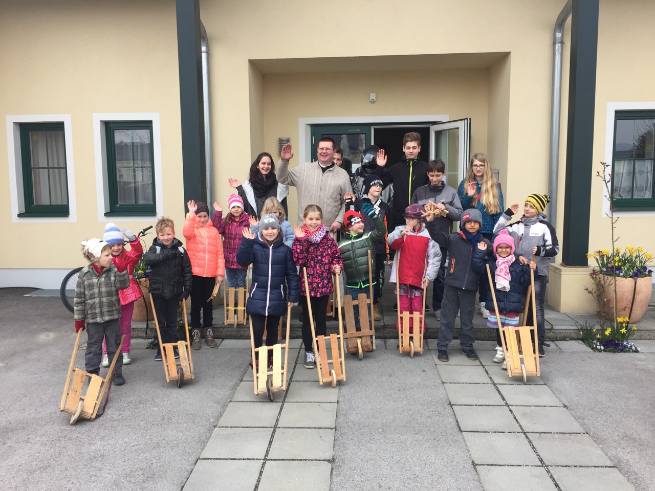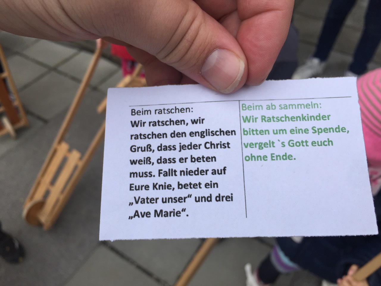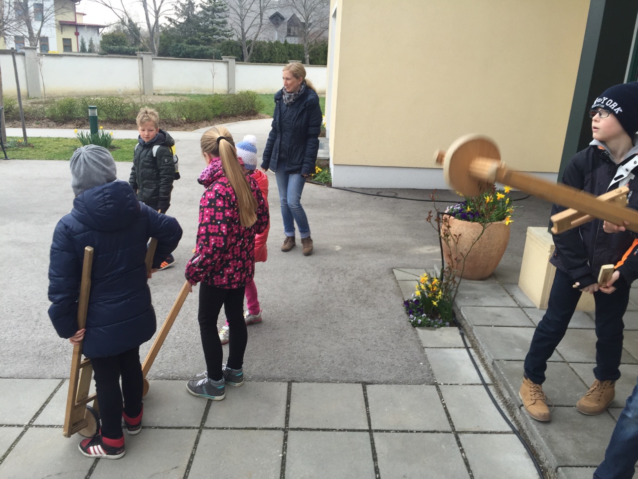 Wenn Gründonnerstag „die Glocken nach Rom fliegen“, heißt es kräftig ratschen. Karfreitag in der Früh (um 8 Uhr) geht der Spaß los, die Kinder und Jugendlichen machen mit den Ratschen viel Lärm, dazu wird gerufen: „Wir ratschen, wir ratschen den Englischen Gruß, den jeder Christ jeden Tag beten muss.“