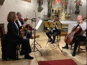 Das Streichquartett aus Mödling (Bärbel und Gerhard Koch, Raphael Pruckner und Ursula Neuwirth) begeisterte das Publikum mit Werke von Wolfgang Amadeus Mozart, Joseph Haydn und Franz Schubert. Wetterbedingt konnte das Buffet in der Pause heuer nicht im Garten aufgebaut werden und war im Leopoldisaal gerichtet.