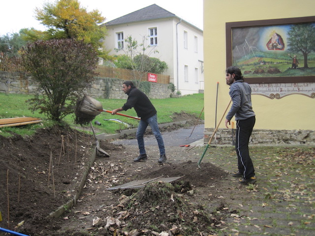 In der 46. Jahreswoche wurde von den “Gästen” aus Syrien unter Anleitung von Herrn Heinz Alt entlang der Begrenzungssteine am Sakristeiweg geeignete Sträucher gesetzt. Sie decken ab, wo ein Rasenmähen kaum möglich wäre und verhindern auch ein Abrutschen an den steilen Böschungsteilen. Wenig später wurde auch das Weglein hergerichtet. Herzlichen Dank den Helfern und der Gemeinde.