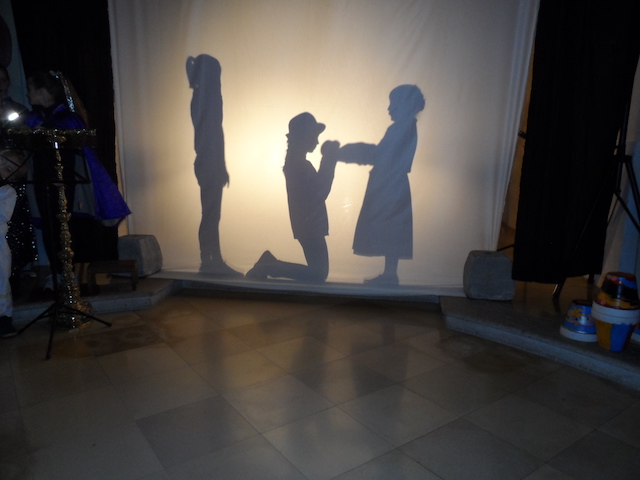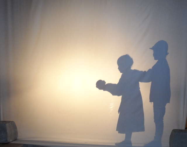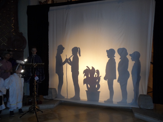 Aber wozu die große Leinwand über die ganze Breite des Altarraumes?  Andrea PIeler und Sara Hotop wagten, das Krippenspiel als Schattenspiel  mit Kinderchor einzustudieren. Ganz gesammelt schauten alle auf die  Mimik und die Gesten der Kinder als Schattenbild.