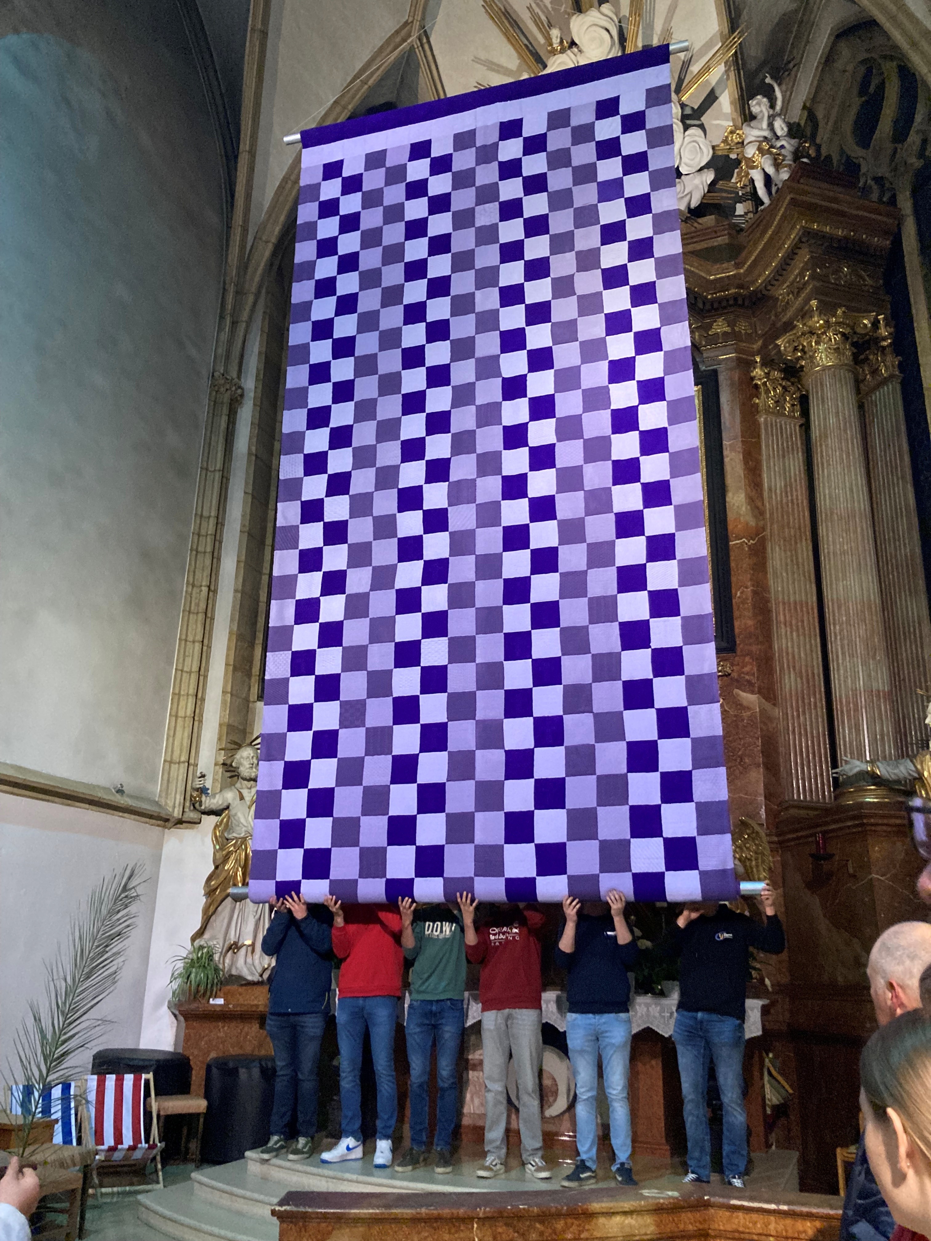 Im Herbst 2022 startete durch das gemeinsame Stricken ein ganz besonderes Projekt: Aus 688 einzelnen Wollfleckerl entstand ein 8,3 x 3,5 m großes Fastentuch für die Pfarrkirche.