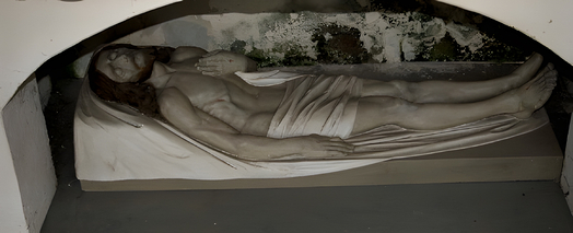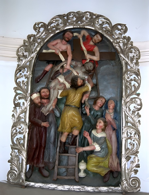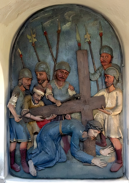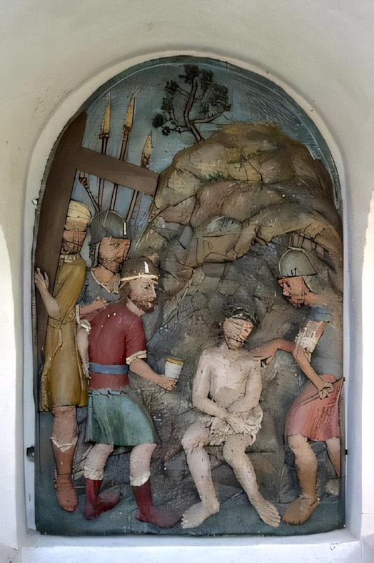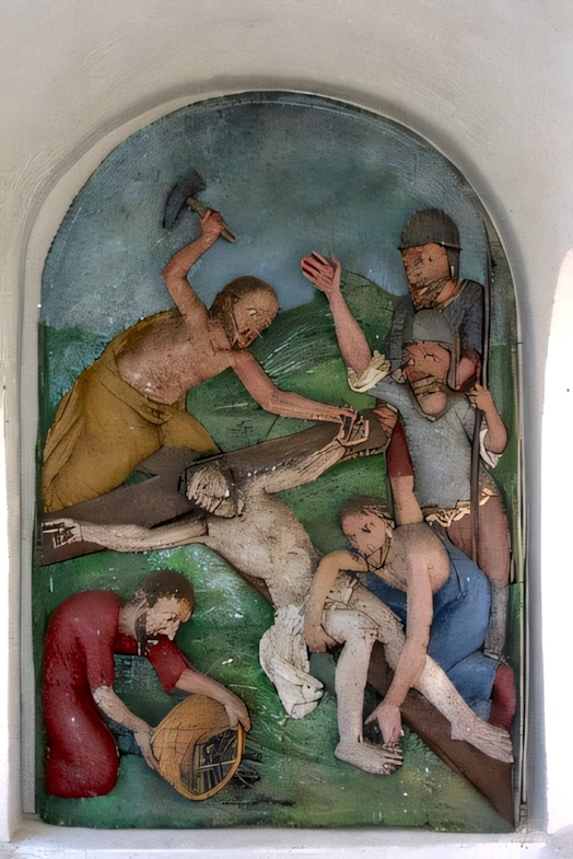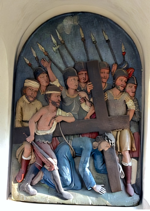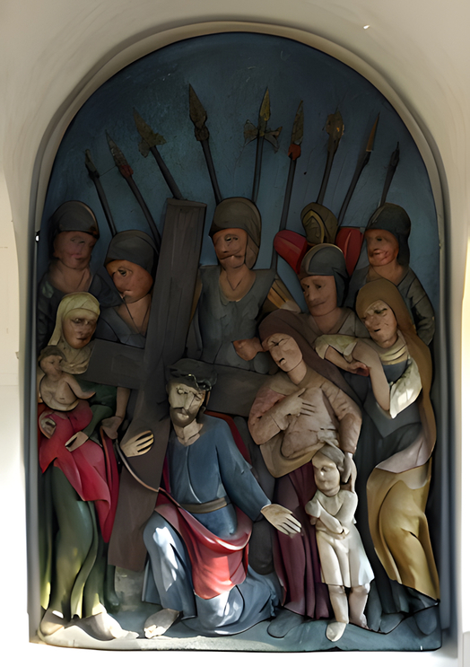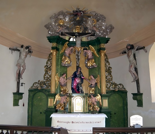 Ein unbekannter Schnitzer zeichnet für die bemalten Holzreliefs verantwortlich. Die Kreuzwegkirche beherbergt die 12. Station mit einer Kreuzigungsgruppe und den ausdrucksvollen Gestalten der beiden Schächer.