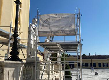 Nach der Renovierung der Aussenfassade ist nun Zeit auch die 4 Evangelisten auf der Balustrade einem "Facelift" zu unterziehen! Nach Abschluss der Arbeiten werden sie wieder mit gütigem Blick und weiß leuchtend auf den Schlossplatz blicken!