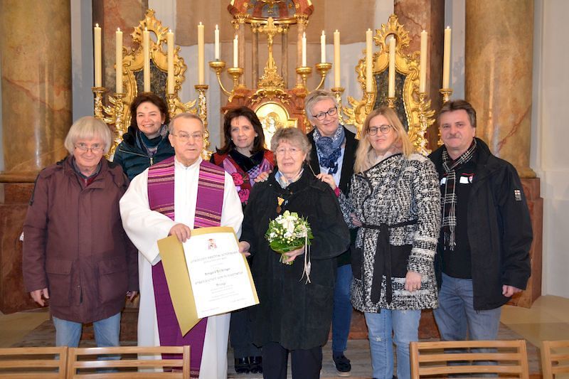 Seit Ihrer Kindheit ist Irmgard Feichtinger mit der Pfarre eng verbunden und seit Jugendtagen spielt sie die Orgel. Zum runden Geburtstag gratulierten Pater Dietmar Klose, Mitglieder des Pfarrgemeinderates und die Pfarrgemeinde. Als Dank für den jahrzehntelangen Einsatz wurde ihr der Stephanusorden in Broze überreicht.