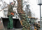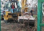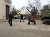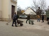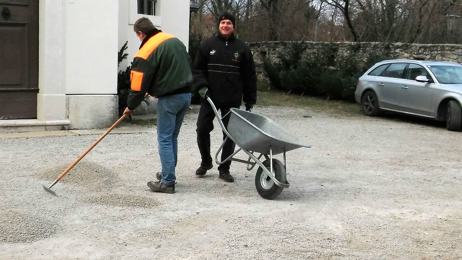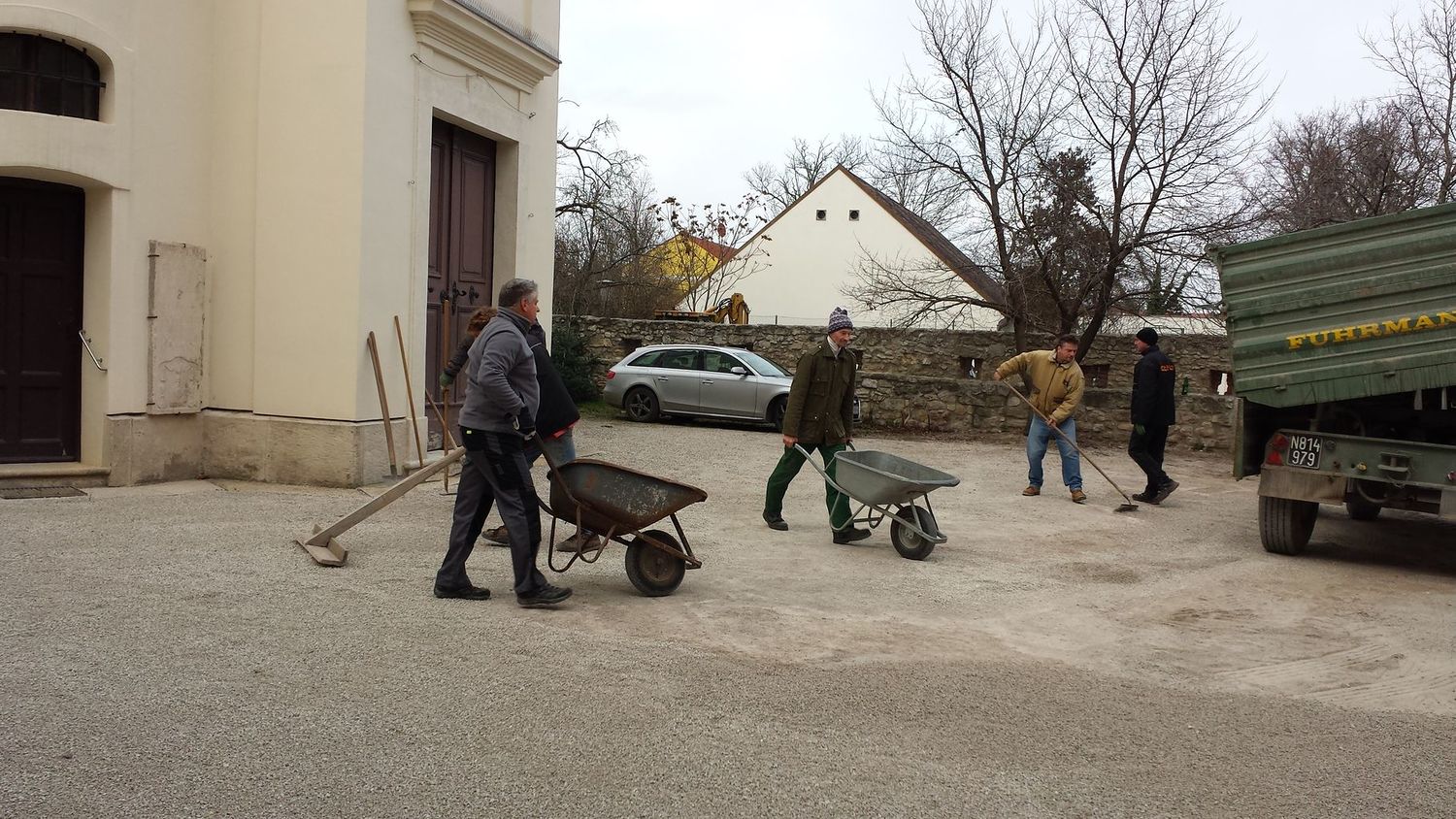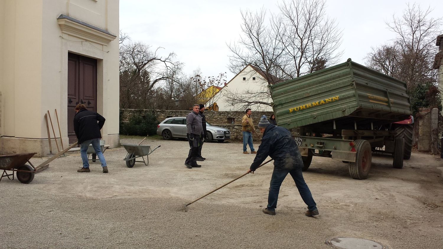 Zuerst musste der unebene Platz abgezogen und ausgeglichen werden. Daraufhin wurde neuer Kies aufgebracht und mit einer großen Straßenwalze gefestigt. Danach wurde der Parkplatz abgegraben und überschüssiges Material vom Kirchenplatz eingearbeitet und abgezogen. Gleichzeitig mussten die Bäume, welche in den Zaun eingewachsen waren entfernt werden.