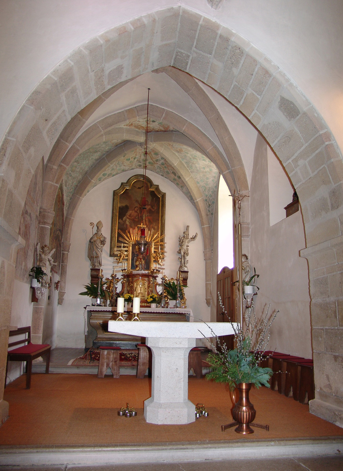 Die Kirche besteht seit mehr als 800 Jahren. Der Altarraum stammt noch aus dieser Zeit. Hier befinden sich gotische Fresken, wie die Darstellung eines "lebenden Kreuzes" aus 1420. Die älteste Jahreszahl (1270) findet sich an der Südwand. Das gotische Kreuzrippengewölbe mit den Wappenschildern stammt aus dem 16. Jh.