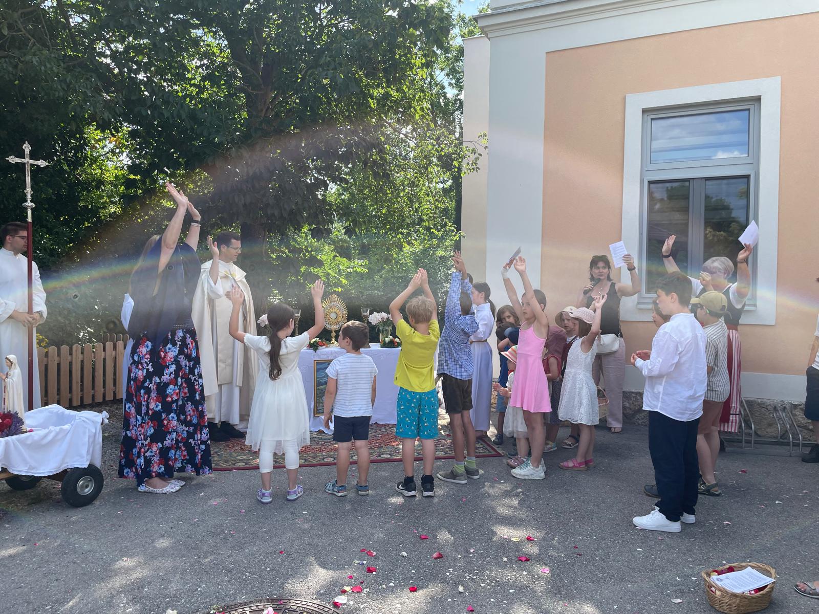 Bei idealem Wetter durften wir Jesus in der Eucharistie auf einem neuen Prozessionsweg durch unseren Ort tragen.