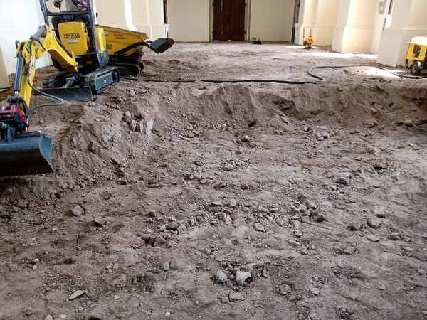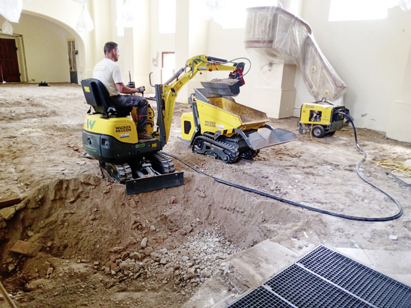 In der Woche nach Pfingsten wurde von der Baufirma begonnen, mittels Elektrobagger und Elektrodumper die Kirche bis 45 cm unter das bisherige Niveau abzutragen.