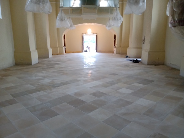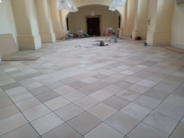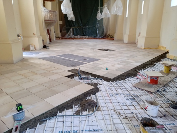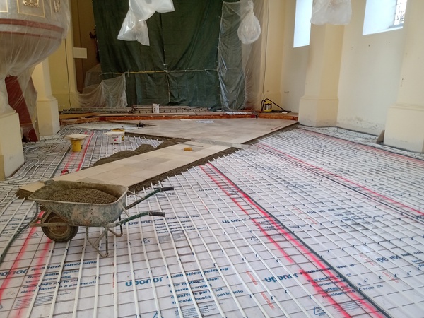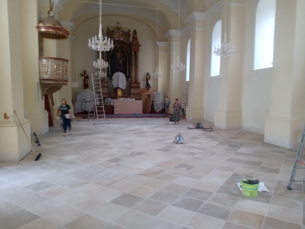 Die Steinmetzfirma war sehr fleißig und hat in gut 2 Wochen den neuen Fußboden fertig verlegt. Anschließend wurde von freiwilligen Helfern eine erste Reinigung der Kirche durchgeführt.