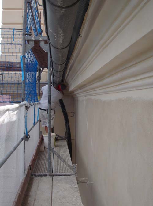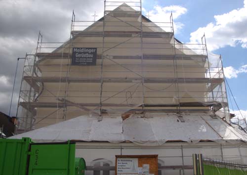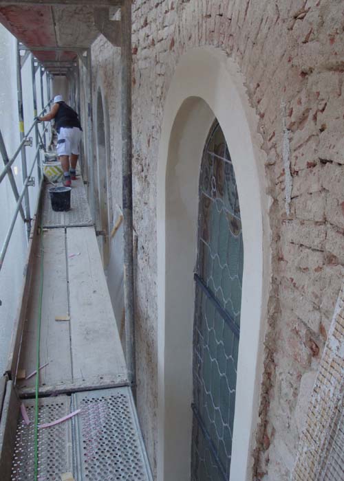 Diese Woche wurde die Nordseite fertig verputzt. Nachdem in der Vorwoche bereits die Fensterfaschen und Gesimse hergerichtet worden waren, wurde nun der Grob- und Feindputz aufgetragen, insgesamt rund 200 m². Die Maler konnten bereits die Gesimse im oberen Teil grundieren. Die Westseite ist fertig gestellt.