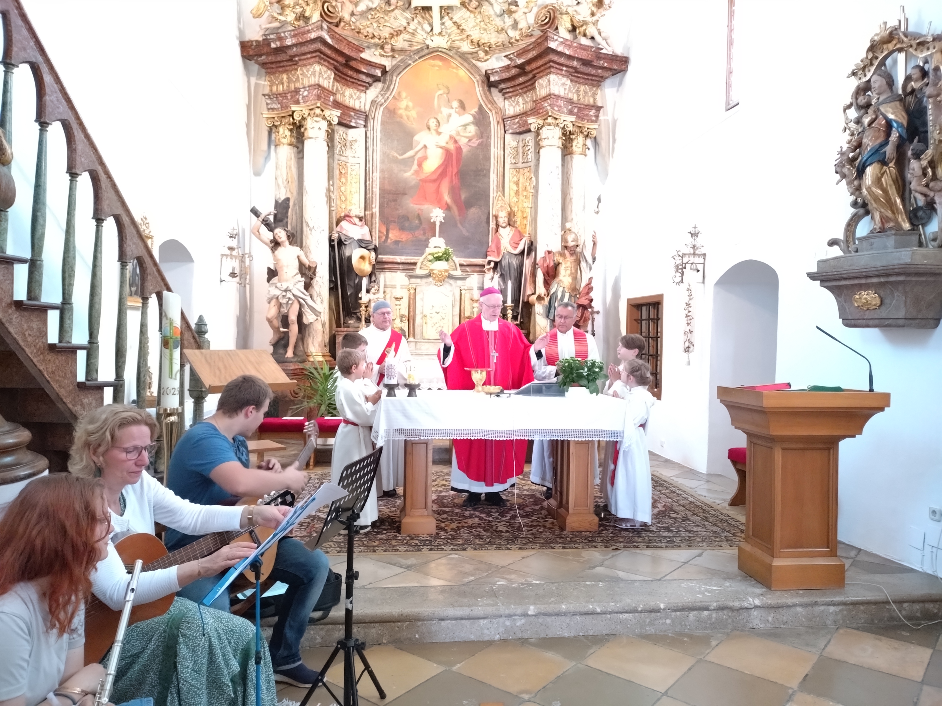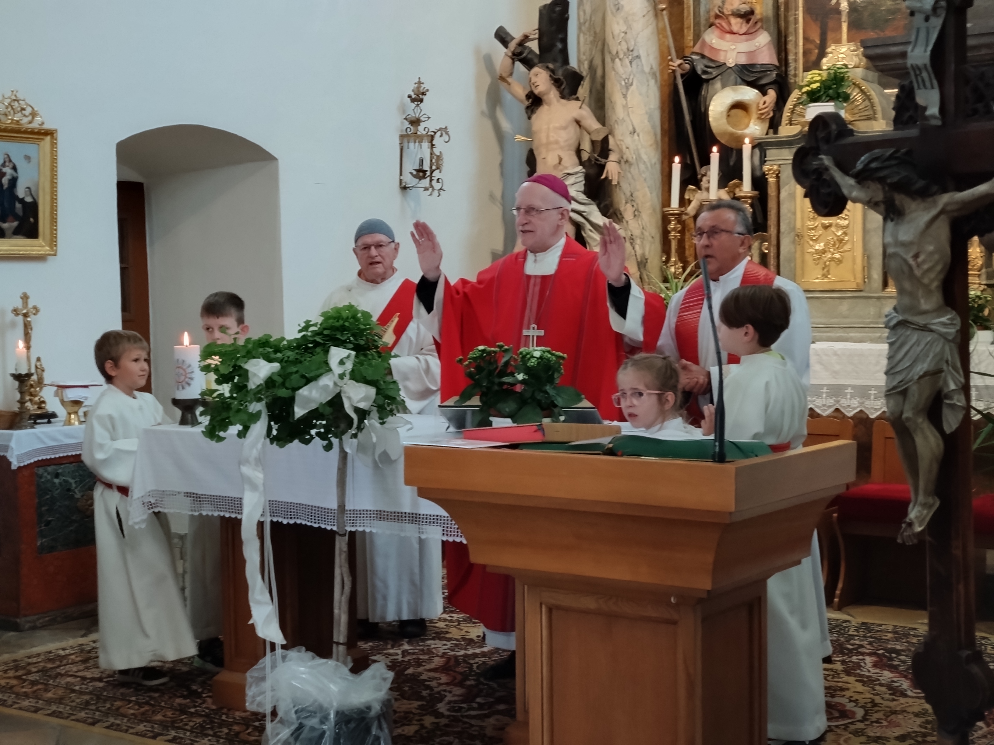 Weihbischof Franz Scharl, der mit der Bahn angereist ist, hat die Heilige Messe gemeinsam mit unserem Pfarrer Tomo und unserem Diakon Otmar stimmungsvoll gestaltet. Auch die Ministranten waren eifrig bei der Sache. Für die musikalische Umrahmung hat wieder einmal Martina Stangl, wunderbar unterstützt von Julia und Max, gesorgt.