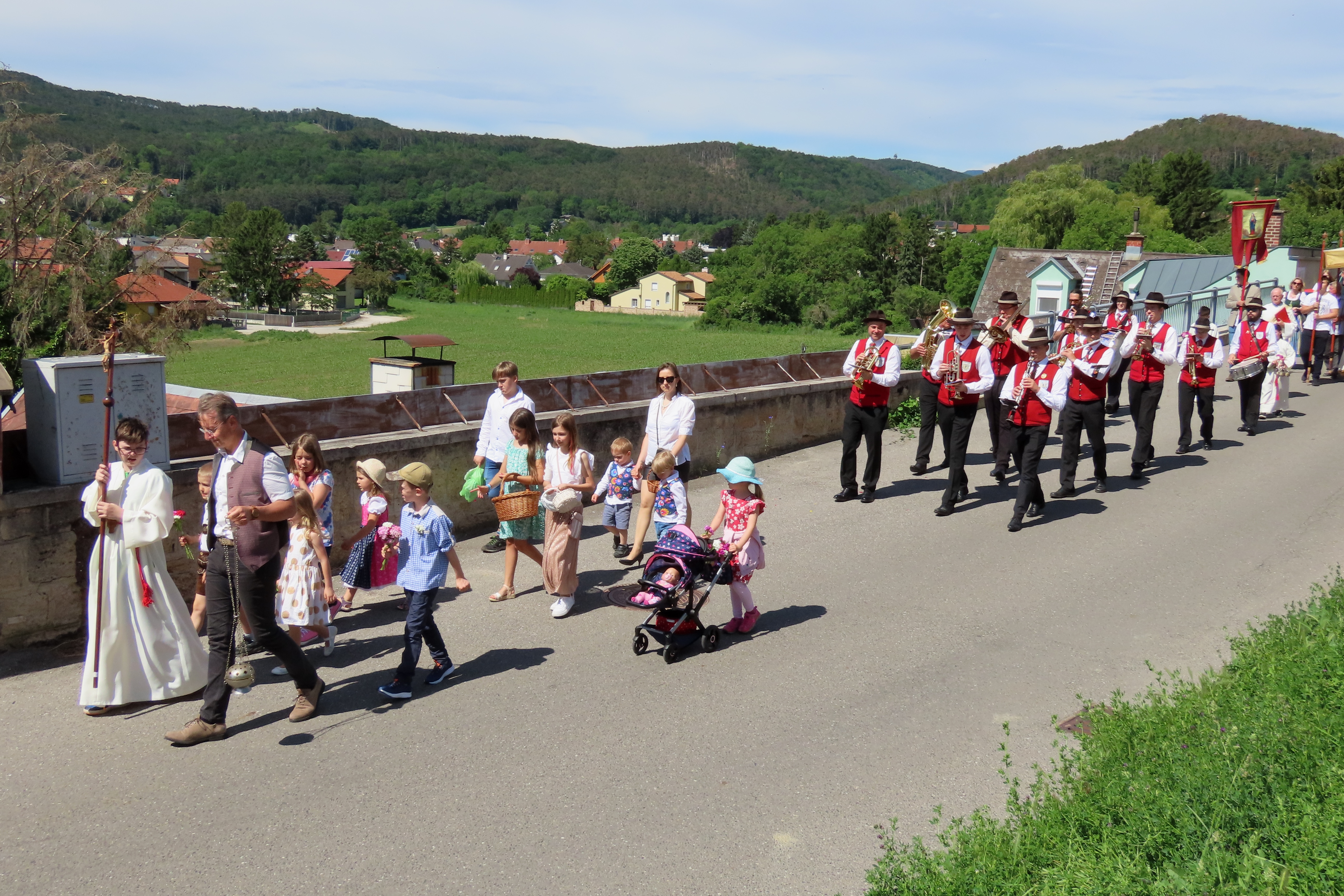 Pfarrer Dr. Čubela feierte zeitgleich mit der Hirtenberger Pfarrgemeinde. Nach dem Gottesdienst zog die Prozession unter den Klängen des Musikvereins St.Veit zu den vier Altären (1.Altar Fam. Schneider, 2.Altar Fam. Artner, 3.Altar(Johanneskapelle) Fam. Rumpler und 4. Altar bei Kirche.