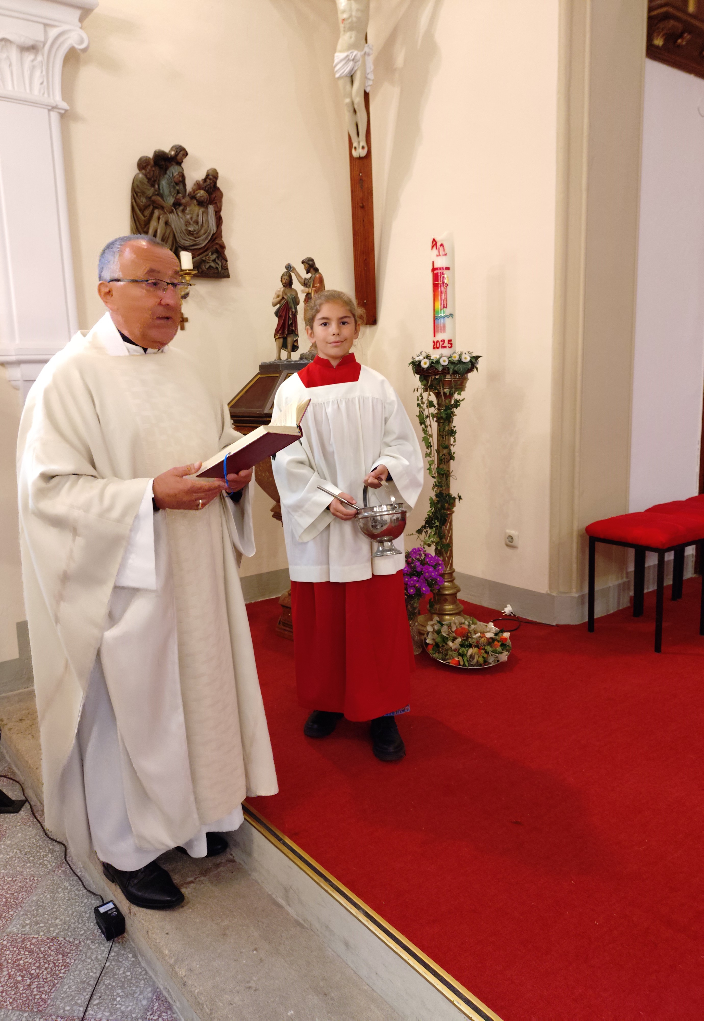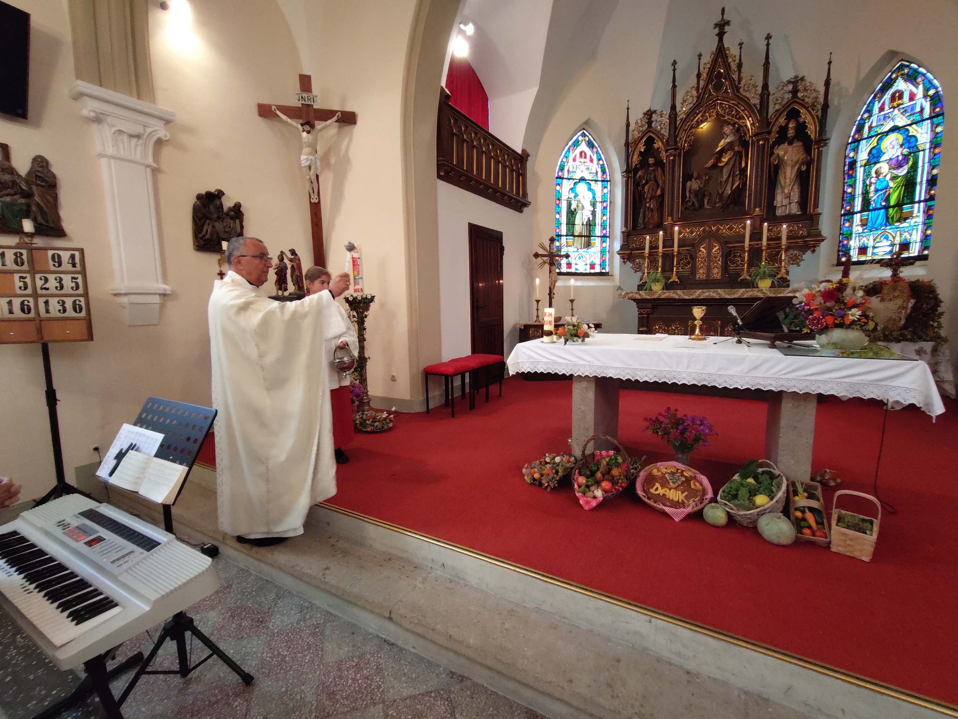 Wir feierten die Heilige Messe mit unserem Hr. Pfarrer Dr. Tomo Čubela, dieser wurde musikalisch von Fr. Dietlinde Dorigoni begleitet. Im Anschluss gab es eine Agape vor der Kirche, die von unseren lieben Helfern vorbereitet wurde. Das gespendete Erntedankbrot, von der Bäckerei Dworzak, wurde bei dieser Agape gleich verköstigt. Vergelt‘s Gott, für die Spenden! Zum Schluss segnete der Hr. Pfarrer all unsere Tiere und besonders diejenigen, die vor der Kirche anwesend waren.