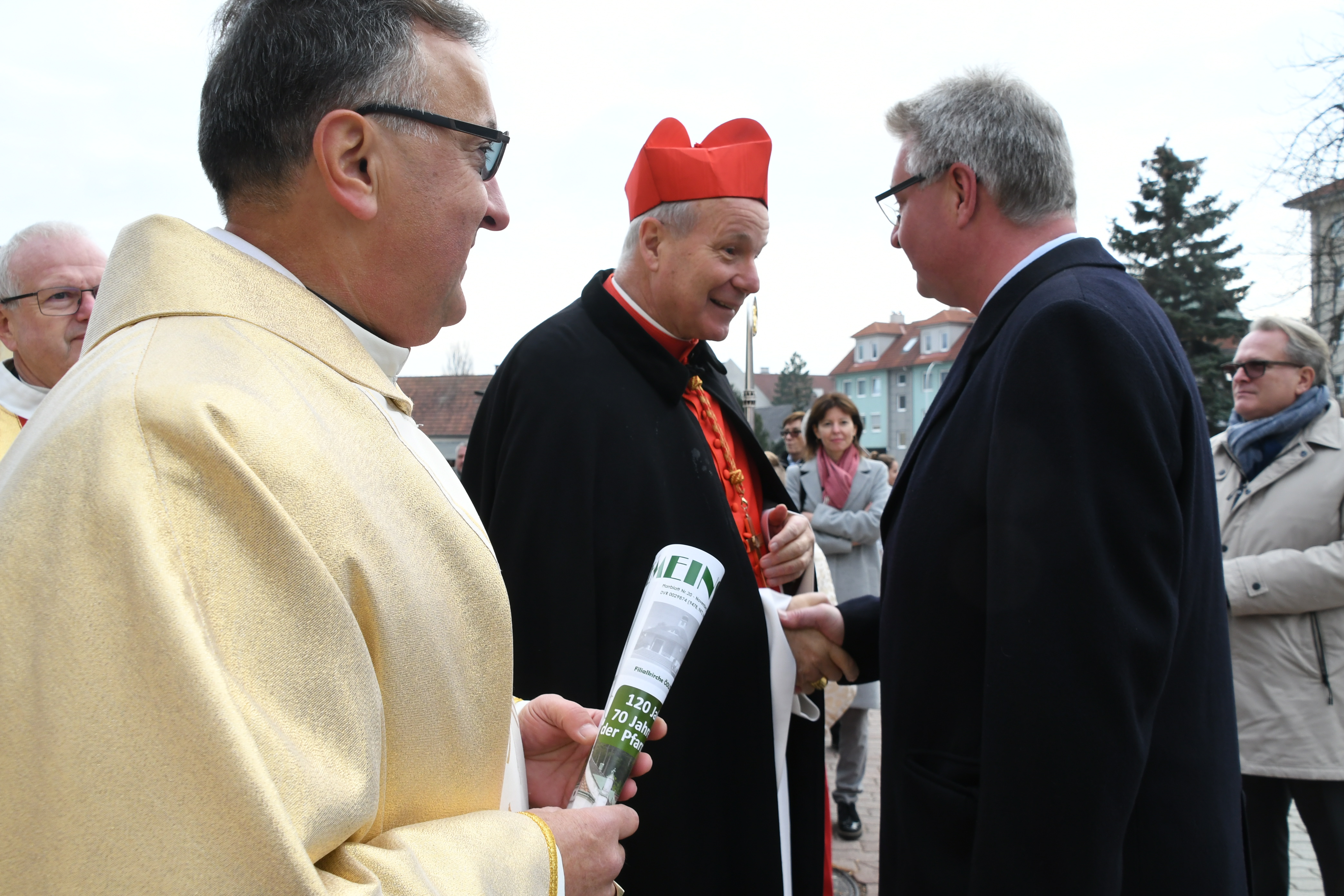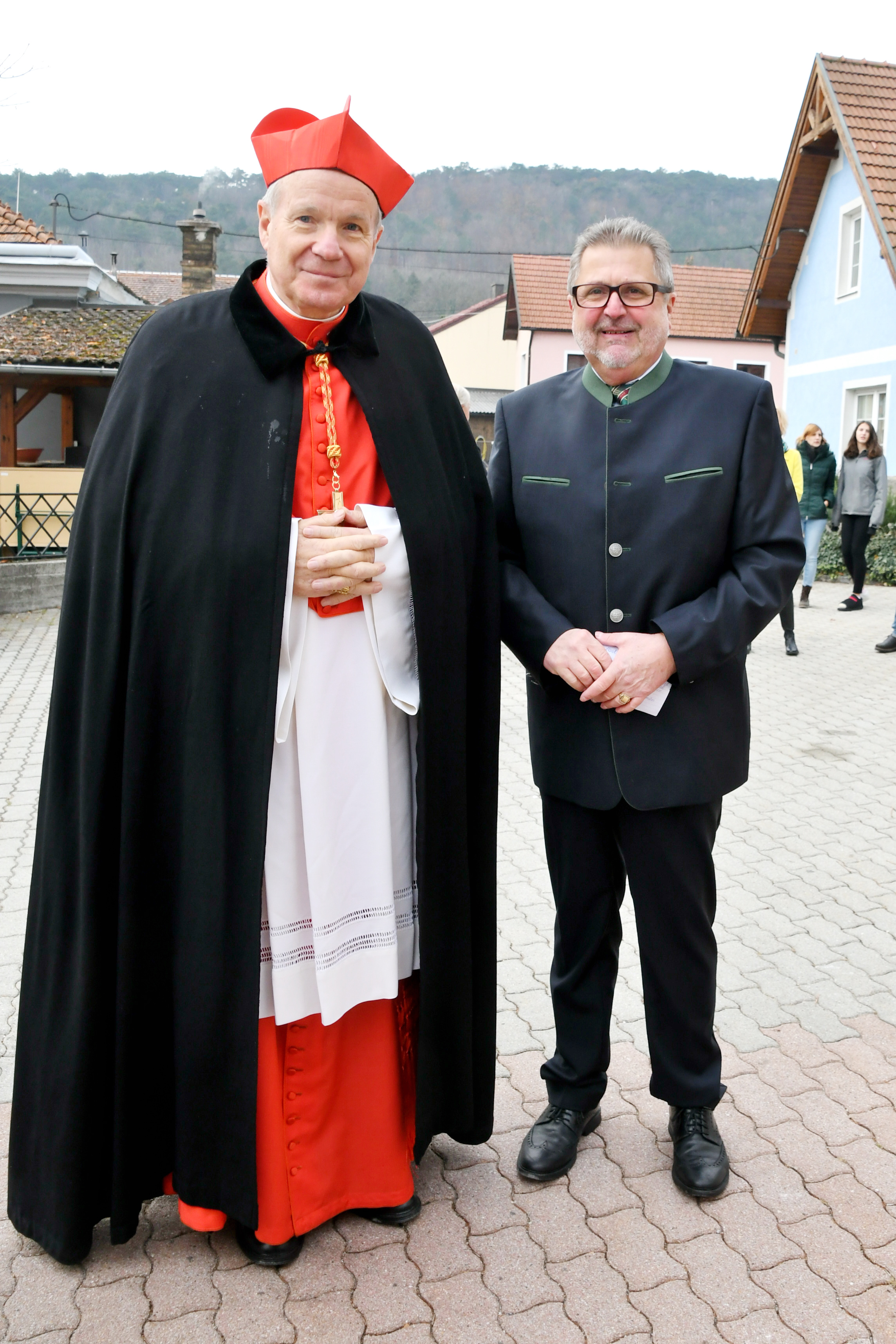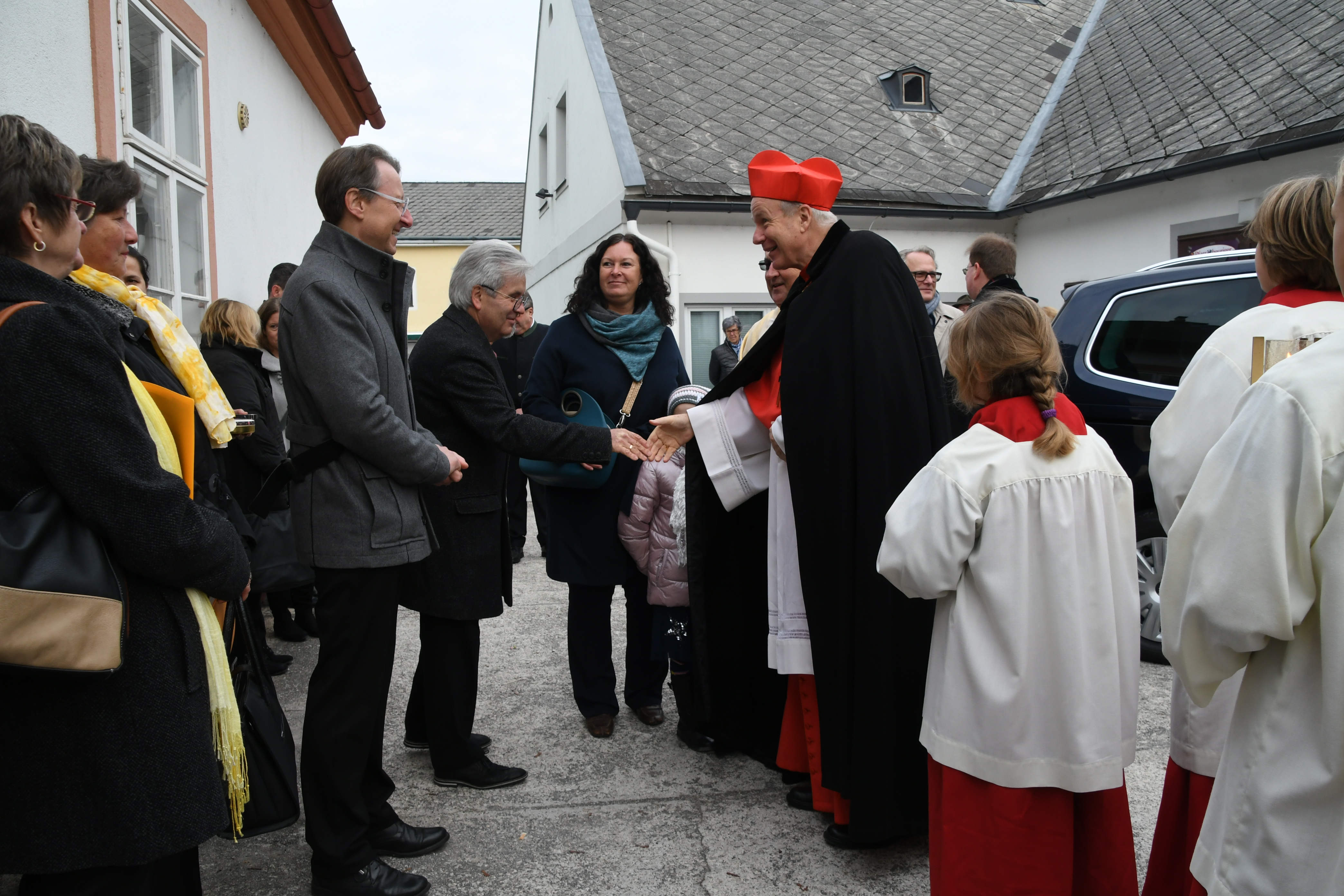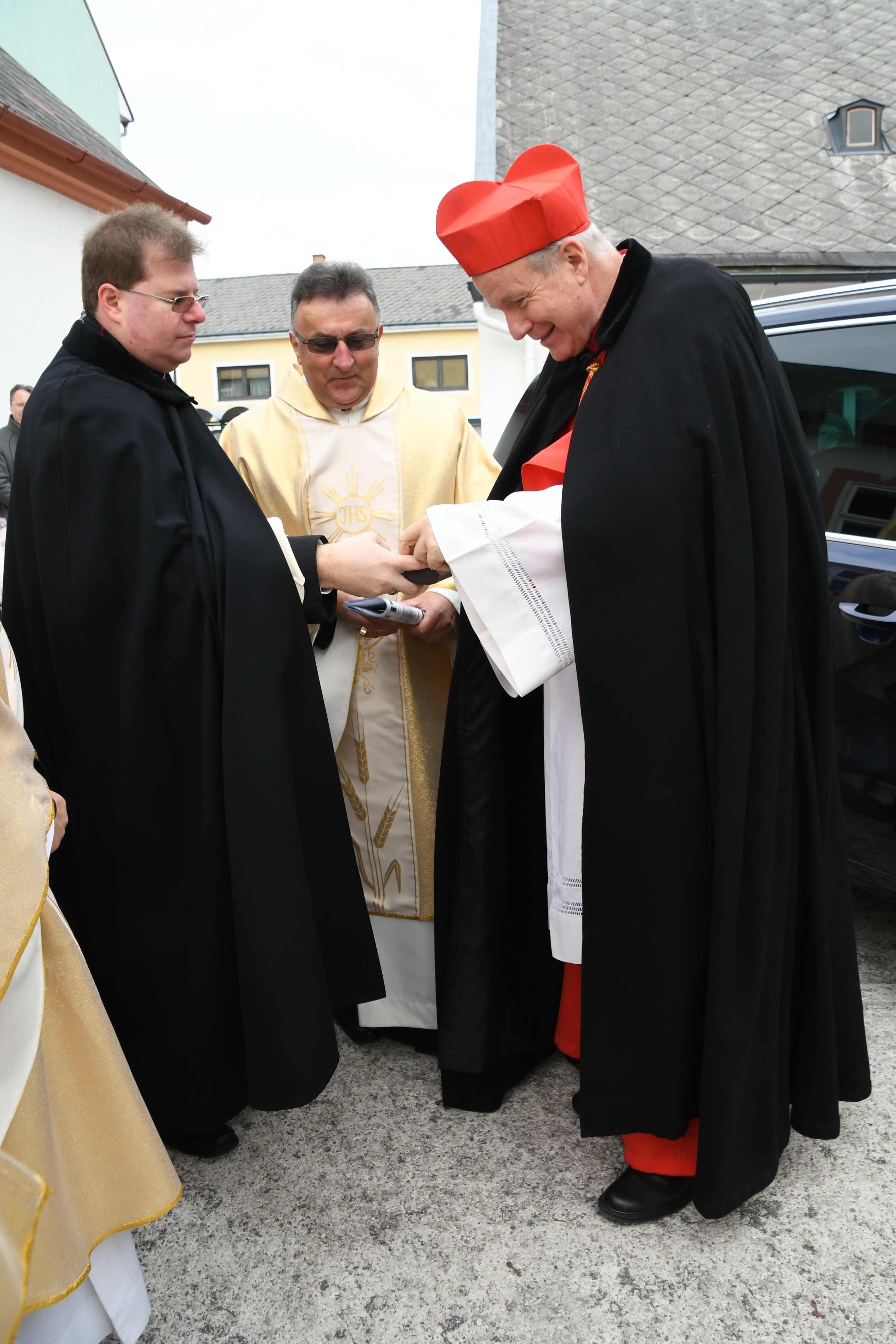 Frau Claudia Windbichler, Pfarrgemeinderätin aus Hirtenberg durfte im Namen der PGR-e aus Hirtenberg und St. Veit seine Eminenz Kardinal Schönborn begrüßen. Danach wurde der Kardinal vom Musikverein Hirtenberg feierlich zur Kirche geleitet und dort von Herrn Bürgermeister Karl Brandtner im Namen der Marktgemeinde Hirtenberg begrüßt.