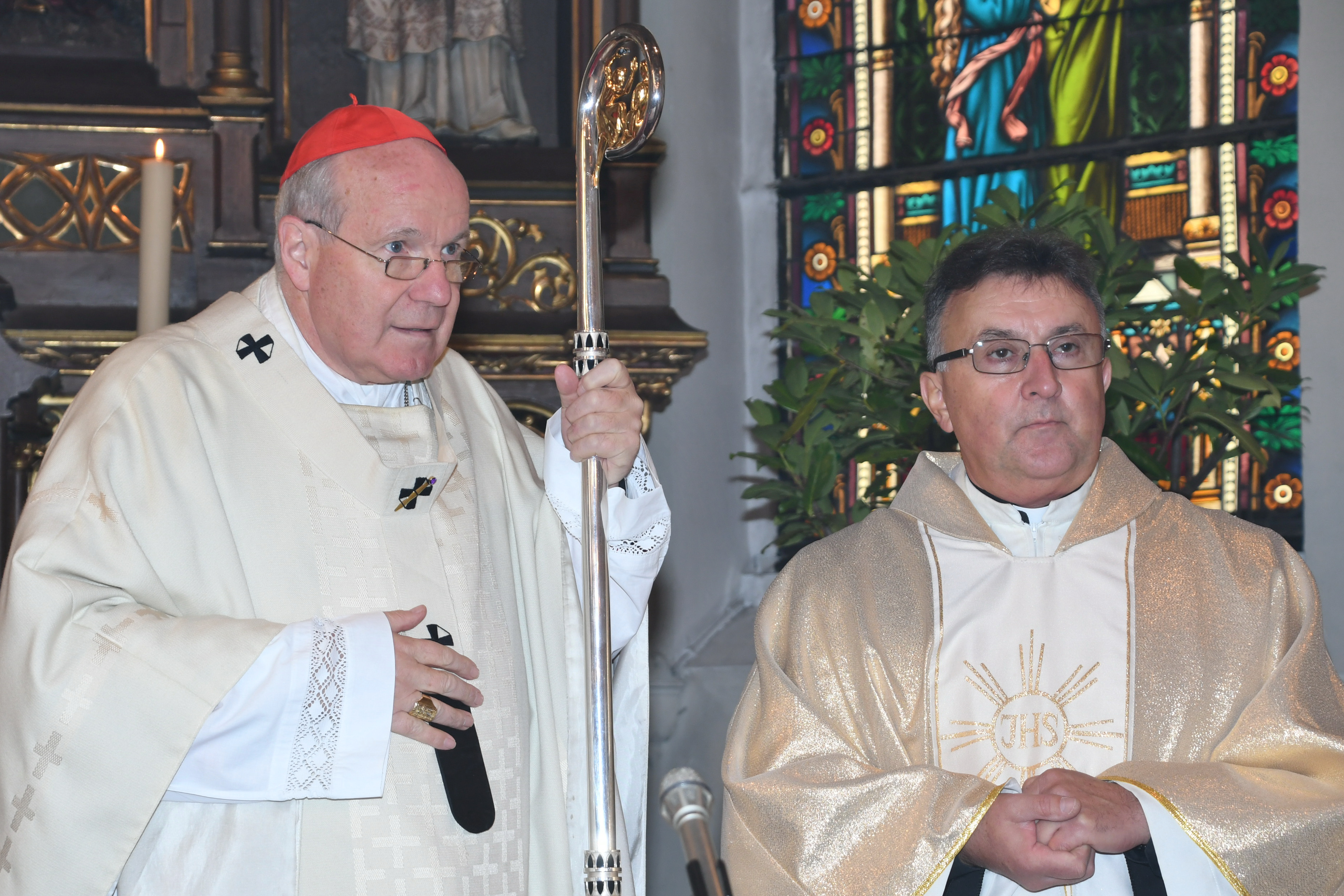 Nach dem Protokoll des Herrn Zeremoniär Diakon Wolfgang Moser begann pünktlich um 10.00 Uhr die Festmesse mit seiner Eminenz Kardinal Schönborn. Nach der feierlichen Begrüßung durch unseren Pfarrer Čubela fand die Weihe und der 1. Anschlag der neuen Glocke für die Aufbahrungshalle statt. Der Festmesse wohnte als Konzelebrant der ehemalige Hirtenberger Pfarrer Martin Paulhart und als Assistent Diakon Ing. Otmar Moritz bei. Musikalisch wurde der Festgottesdienst vom Singkreis Hirtenberg, der an diesem Tag sein 20jähriges Jubiläum feierte, vom Musikverein Hirtenberg sowie von den Kindergartenkindern, die für unseren Festgast ein Lied einstudiert hatten, gestaltet. In seiner volksnahen, authentischen Predigt, in der seine Eminenz vor allem die Jugend mit dem Thema „Zukunftsangst – Zukunftshoffnung“ ansprach, ließ er auch den Klimawandel der heutigen Zeit nicht unerwähnt. Im Anschluss an seine Predigt gratulierte der Kardinal unserem Pfarrer zu seinem 60. Geburtstag (s. Foto), den er im September feierte.
