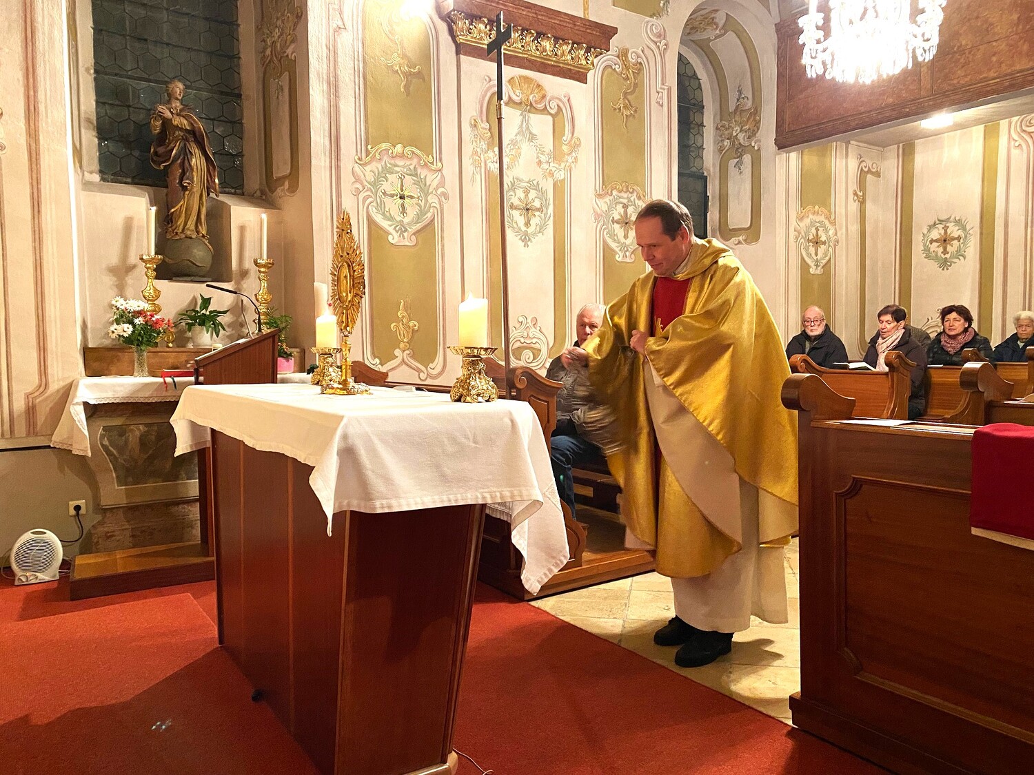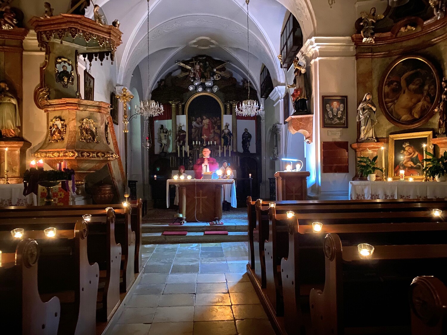 In der traditionsgemäß nur von Kerzenlicht erleuchteten Pfarrkirche feierten viele Gläubige die adventliche Abendmesse am Freitag, den 12. Dezember, mit Pfarrvikar Peter. Schöne Advent- und Marienlieder begleiteten die Liturgie. Vikar Peter berührte mit dem Gesang des „Rorate caeli desuper“ die Herzen der Anwesenden.