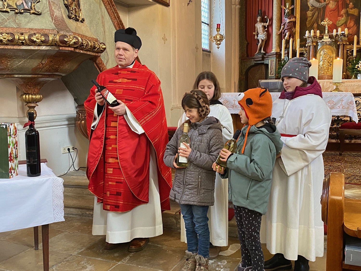 In unserer Pfarre ist es Brauch, den „Johanniswein“ am Stepahnietag zu segnen. Die Weinbauern, Familie Pober und Familie Supper, brachten ihren Wein zur Segnung durch Vikar Peter mit. Frau Ingeborg Pober bereicherte die Festmesse mit feierlicher Orgel- und Gitarrenmusik.