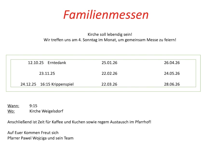 Wir treffen uns am 4. Sonntag im Monat, um gemeinsam Messe zu feiern!