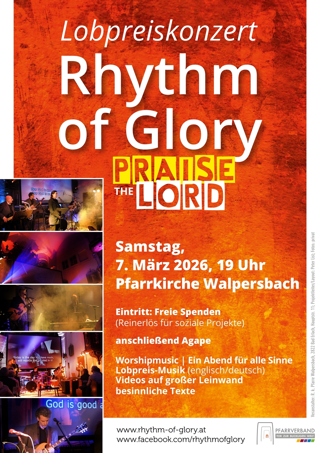 Wir laden Sie/Euch herzlich ein zu einer Neuauflage von Rhythm of Glory in der Pfarrkirche Walpersbach am Samstag, 7. März 2026, um 19:00 Uhr!