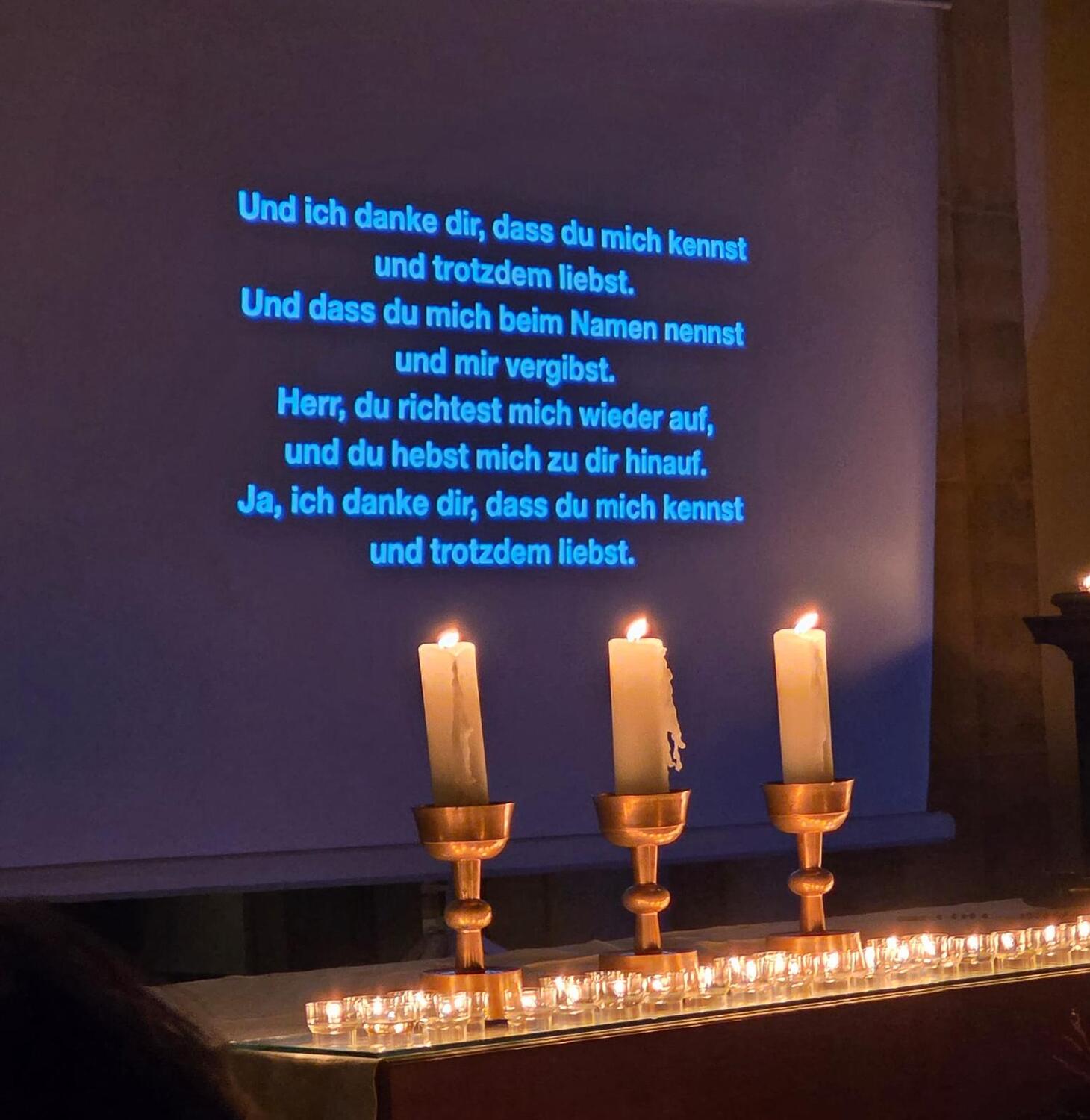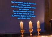Im Anschluss durften wir Lobpreislieder, gesungen von den wunderbaren Stimmen von Andrea und ihrer Freundin Bettina und begleitet von Michael lauschen; und wer wollte, konnte auch mitsingen, denn die Texte wurden im Altarraum an eine Leinwand