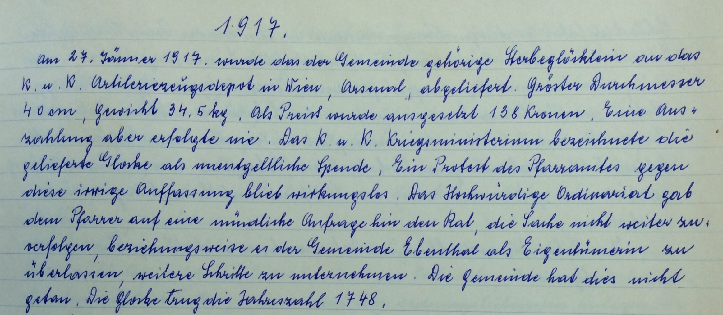 die originale Pfarrchronik (Requirierung der Sterbeglocke im 1. Weltkrieg)