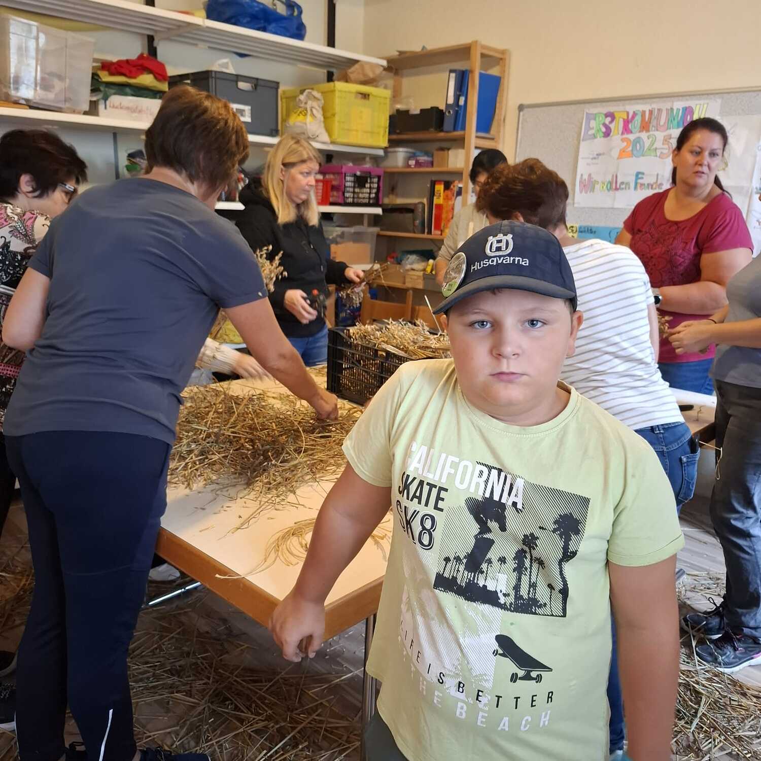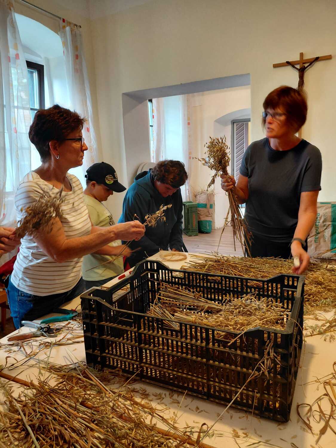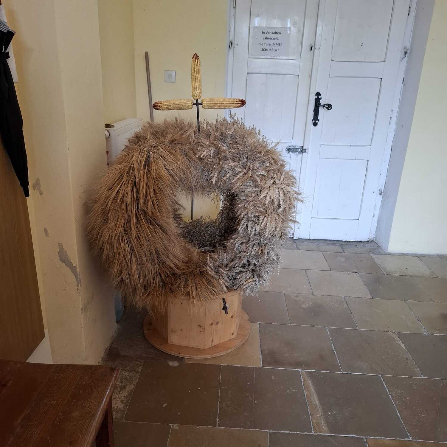 Auch heuer haben sich unsere Bäuerinnen und Bauern mit Unterstützung einiger unserer Jungscharkinder und engagierten Mütter getroffen, um für unser Erntedankfest eine wunderschöne Erntekrone zu flechten.