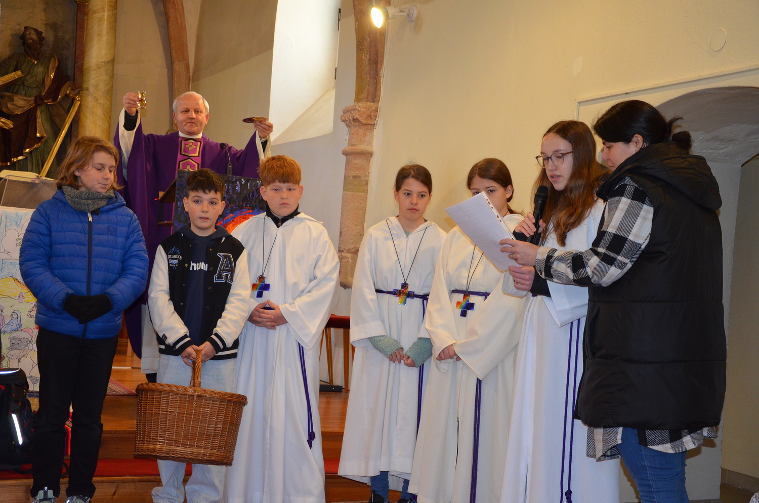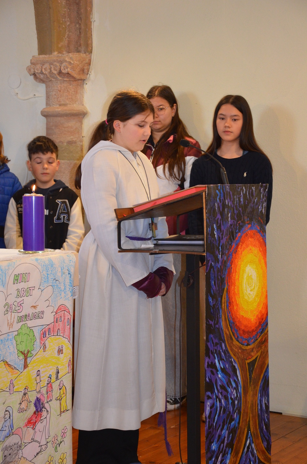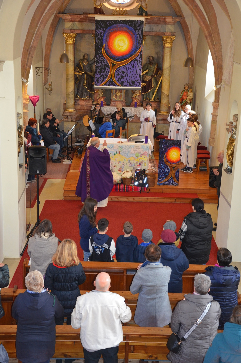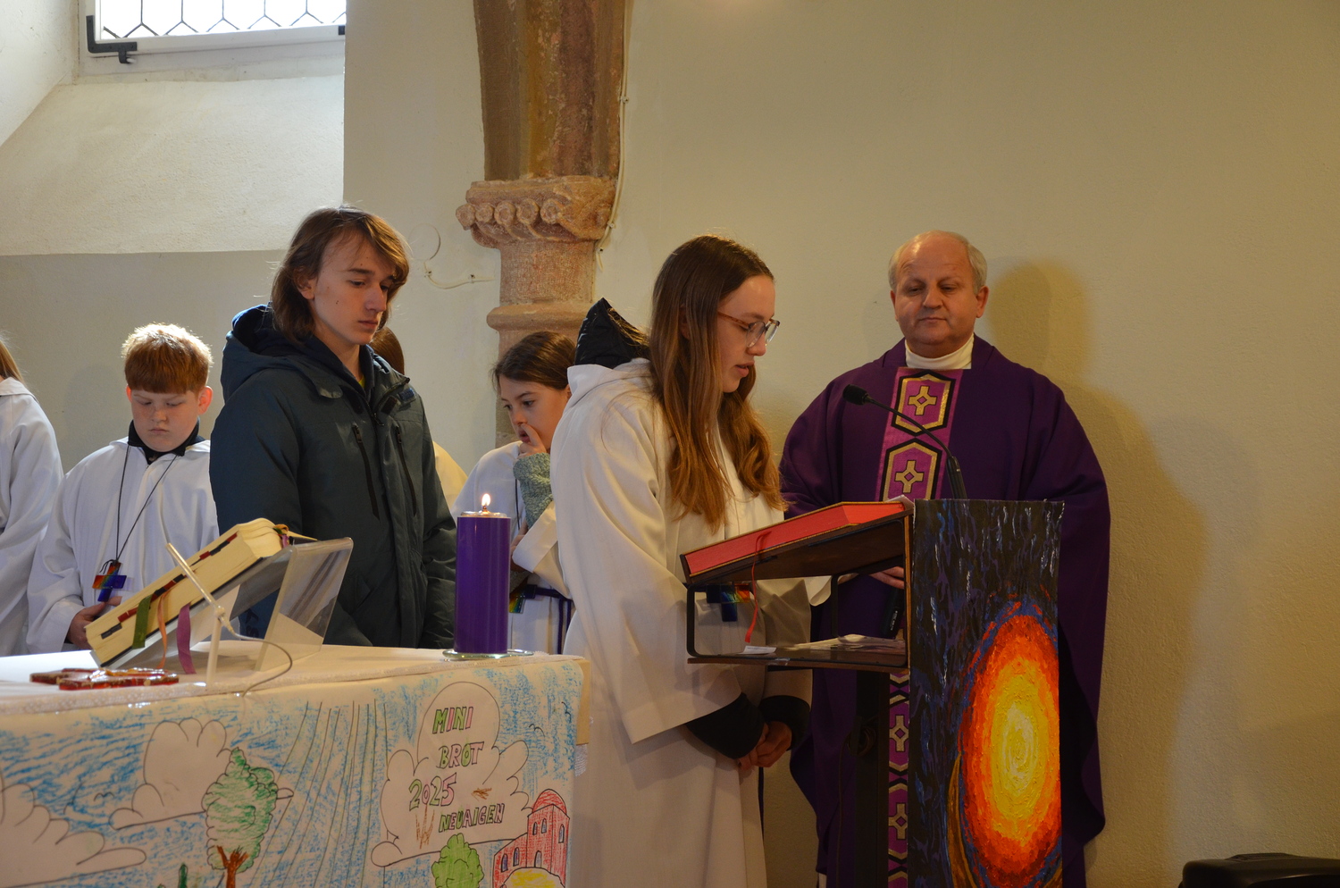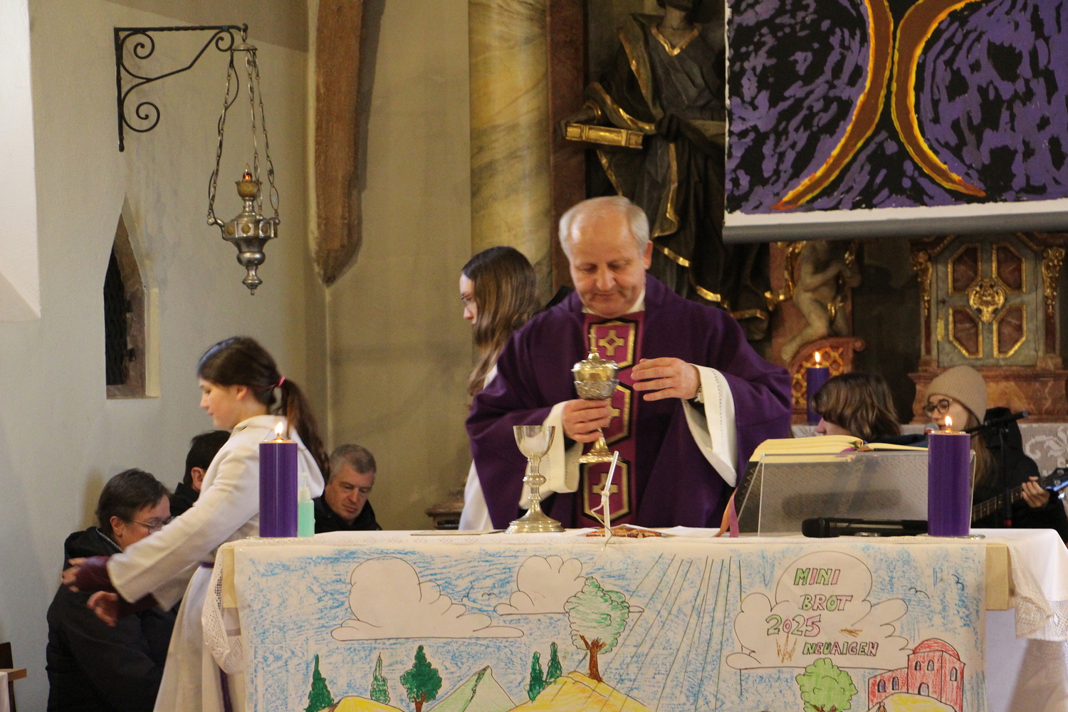 Am Sonntag stand der Gottesdienst unter dem Thema der Minibrotaktion „Brote statt Steine“. In dem von O_M_TSCHI musikalisch untermalten und von Jungscharkinder, Ministrant:innen und Lektorinnen gestalteten Gottesdienst zeigte sich die Lebendigkeit unserer Gemeinschaft in der Pfarre Neuaigen. Pfarrer Liviu Balascuti zelebrierte die Hl. Messe und bezog in seiner kindgerechten Predigt die Kinder und Jugendlichen mit ein. Im Anschluss an den Gottesdienst verteilten die Kinder die Minibrote und erreichten eine Spendensumme von € 293,--.