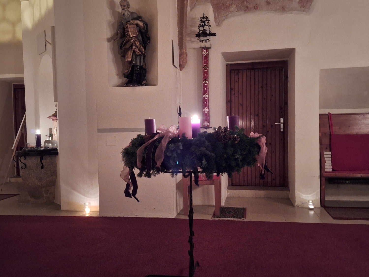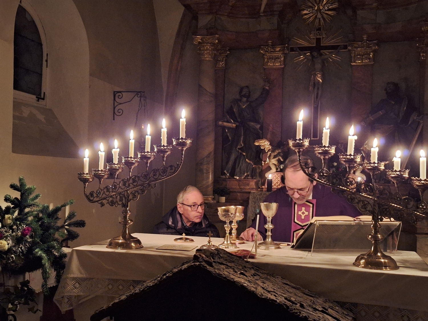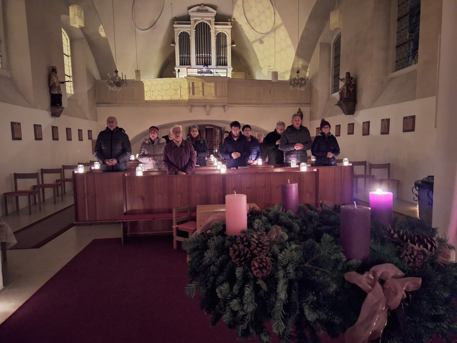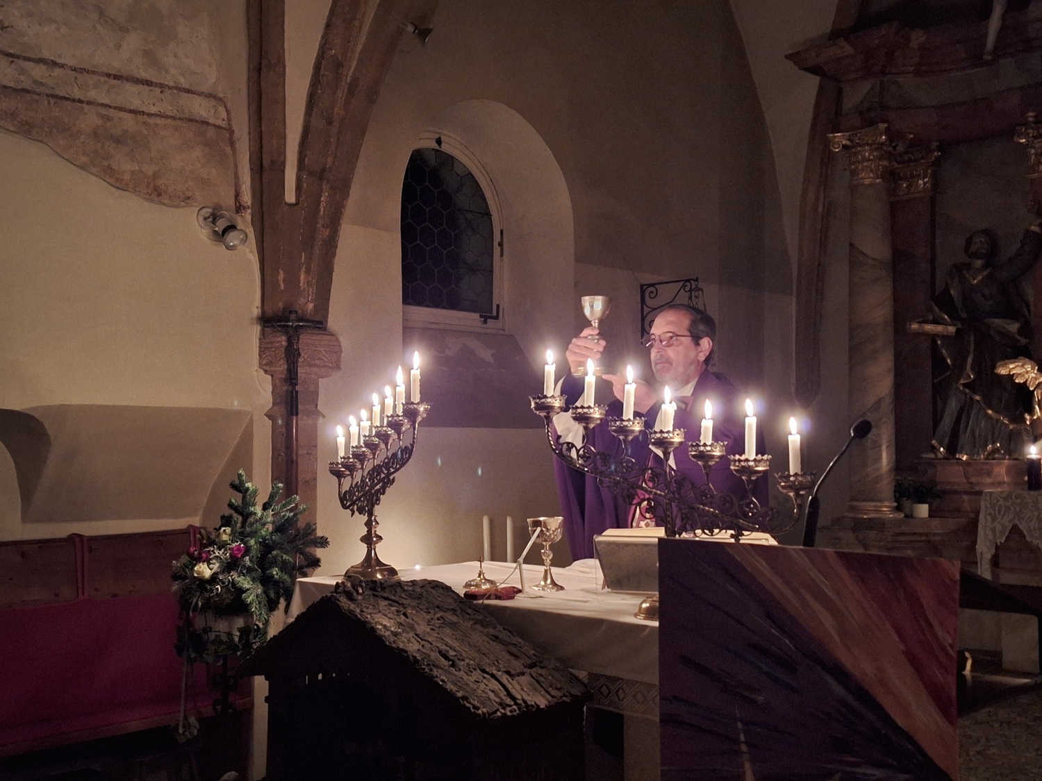 Frühaufsteher*innen wurden am 6. Dezember in der Pfarre Neuaigen mit einer stimmungsvollen Rorate belohnt. Markus Fallbacher brillierte nach längerer Abwesenheit wieder eindrucksvoll auf der Orgel in der von Marianne und Heinz Bader idyllisch illuminierten Kirche. Bei Kerzenschein zelebrierte Pater Adrian Boboruta diese Messe und erklärte uns in der Predigt den Bezug von Jesus und dem Licht der Kerzen in der Dunkelheit so wie sie in der Kirche gerade zu sehen waren.