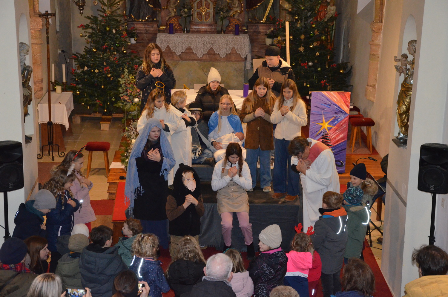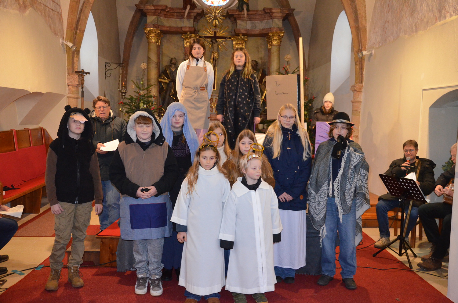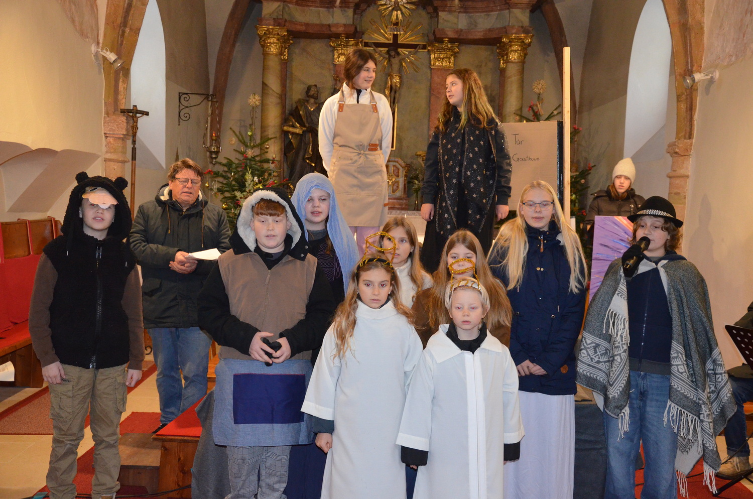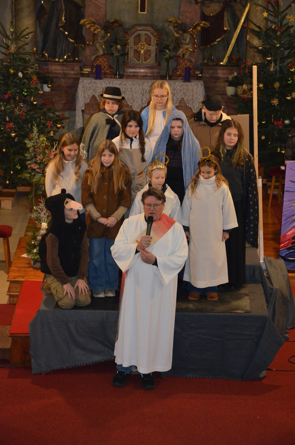 Die Weihnachtgeschichte wurde aus der Perspektive des Wirtes von Betlehem, der das Gasthaus zum Kamel betreibt erzählt. Besinnlich und humorvoll konnten sich die Besucher*innen viele junge Familien mit ihren Kindern auf das Weihnachtsfest einstimmen. Besonders gefreut hat uns, dass unsere Kirche wieder einmal bis zum letzten Platz gefüllt war. Mitgeholfen haben damit alles funktionierte Rene und Vali Taumberger, Sigrid und Wolfgang Stach und Diakon Hans Wachter.