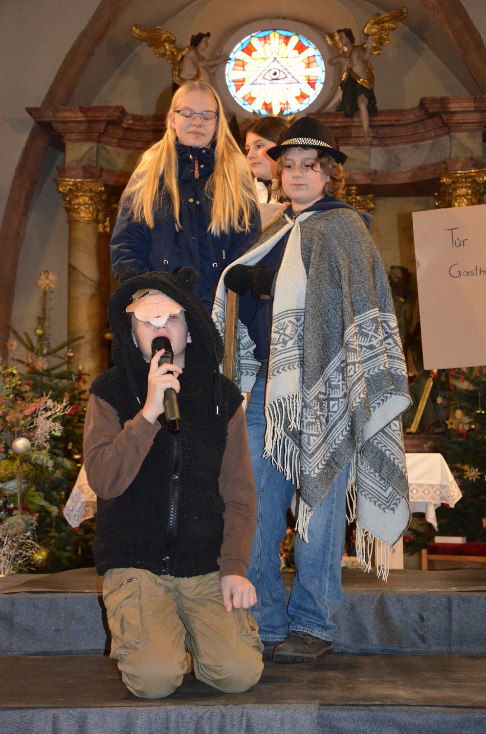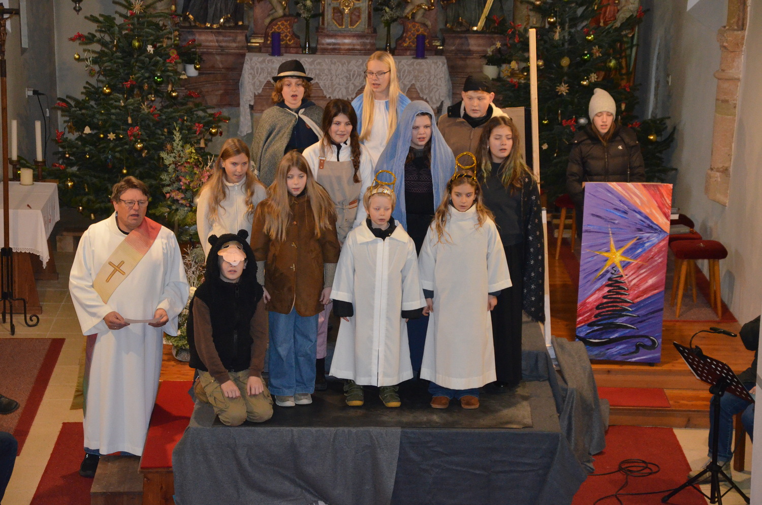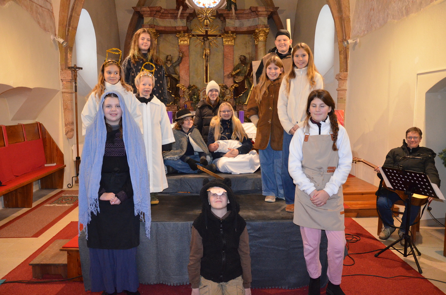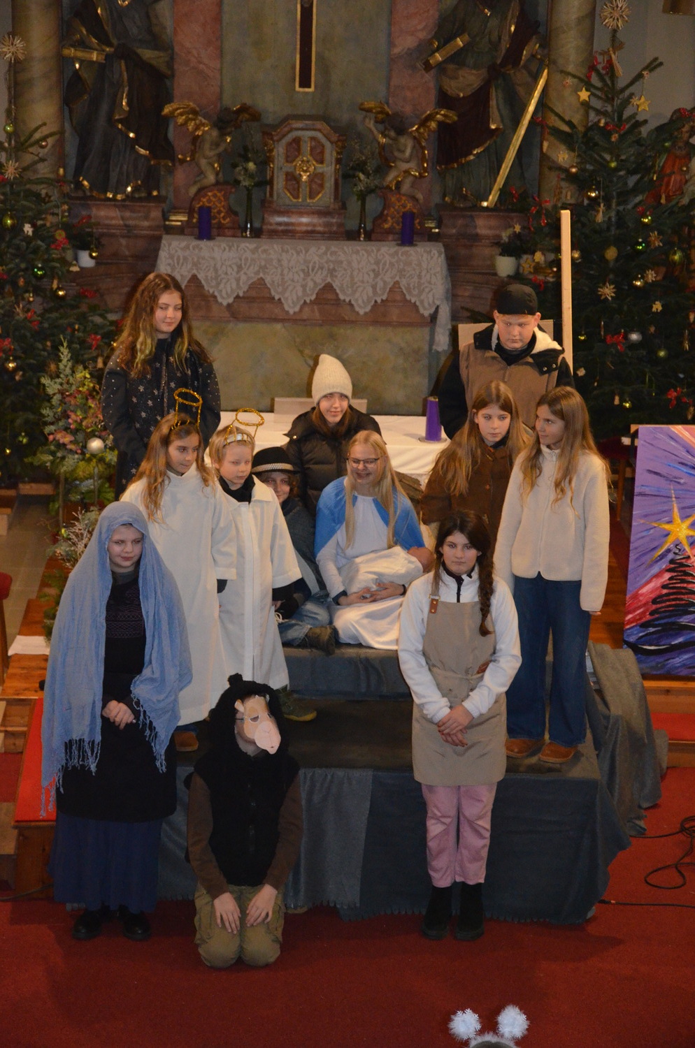 Die Weihnachtgeschichte wurde aus der Perspektive des Wirtes von Betlehem, der das Gasthaus zum Kamel betreibt erzählt. Besinnlich und humorvoll konnten sich die Besucher*innen viele junge Familien mit ihren Kindern auf das Weihnachtsfest einstimmen. Besonders gefreut hat uns, dass unsere Kirche wieder einmal bis zum letzten Platz gefüllt war. Mitgeholfen haben damit alles funktionierte Rene und Vali Taumberger, Sigrid und Wolfgang Stach und Diakon Hans Wachter.