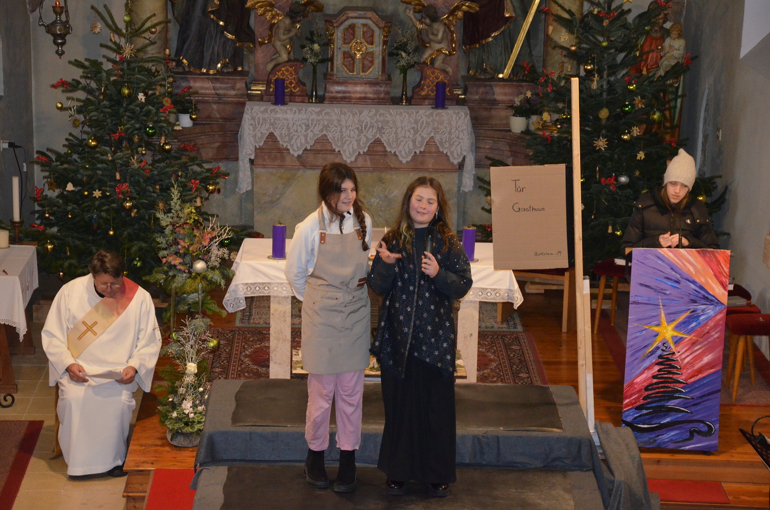 Die Personen, Darstellerinnen und Darsteller waren: Elias, der Wirt Selina Heigl, Maria Lara Berthold, Josef Noah Grubmüller, Jonathan, Eliass Diener Lukas Berthold, Tabea, eine Nachbarin Fabienne Pfaffel, Ruth, Eliass Tochter Emelie Hirsch, Hirte Ezechiel Rosalie Fischer, Hirte Aron Luna Taumberger, Engel Gloria Amelie Fischer, Engel Halleluja Elias Taumberger, Kamel Robin Hirsch, Erzählerin Maja Domanovich.