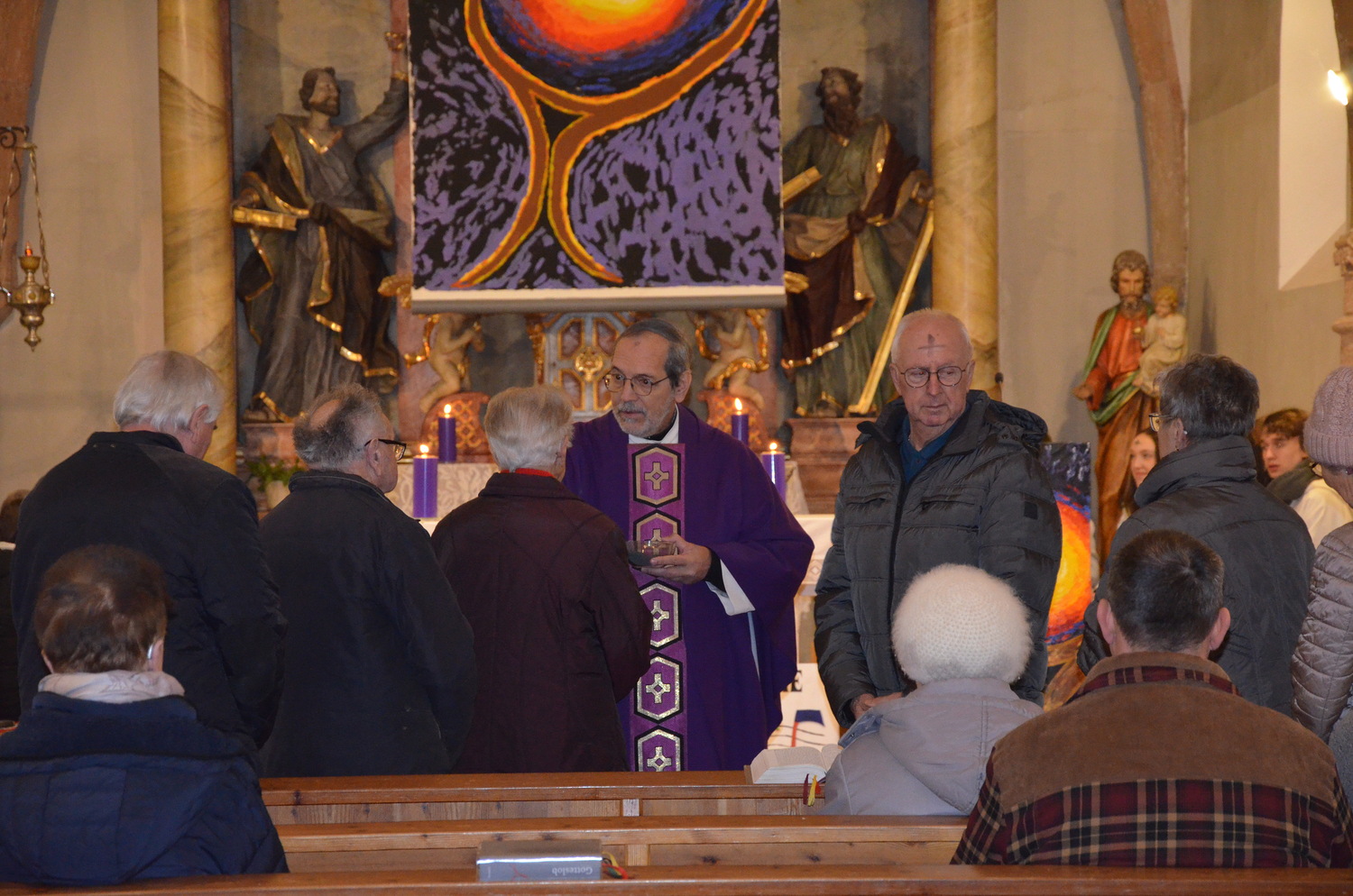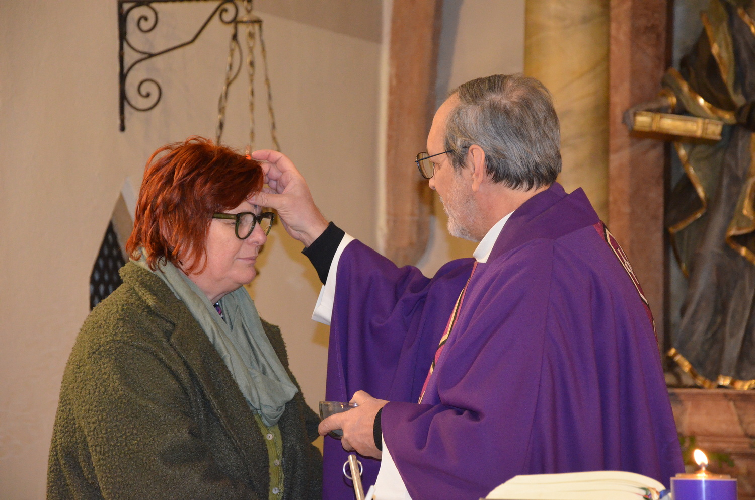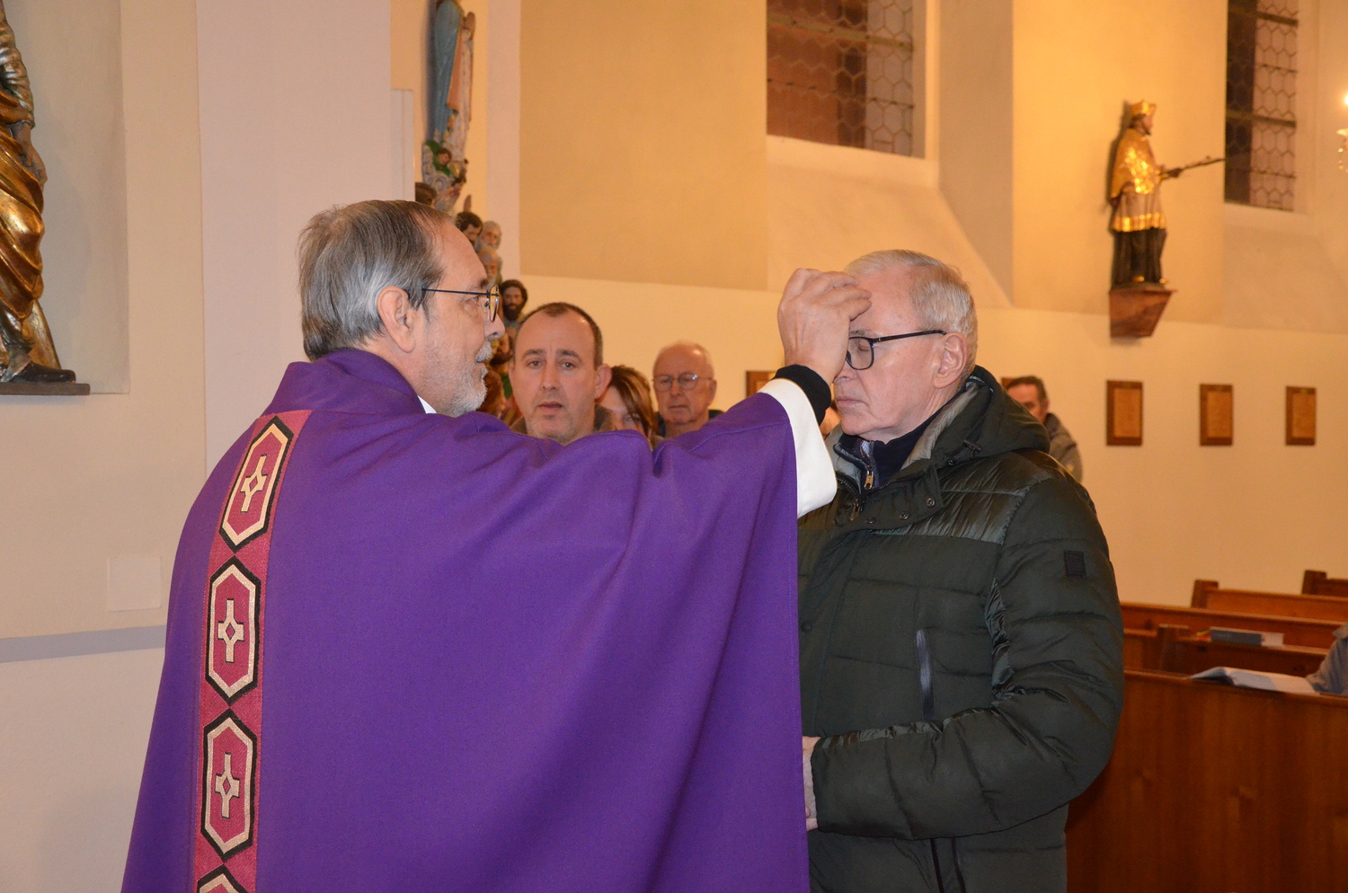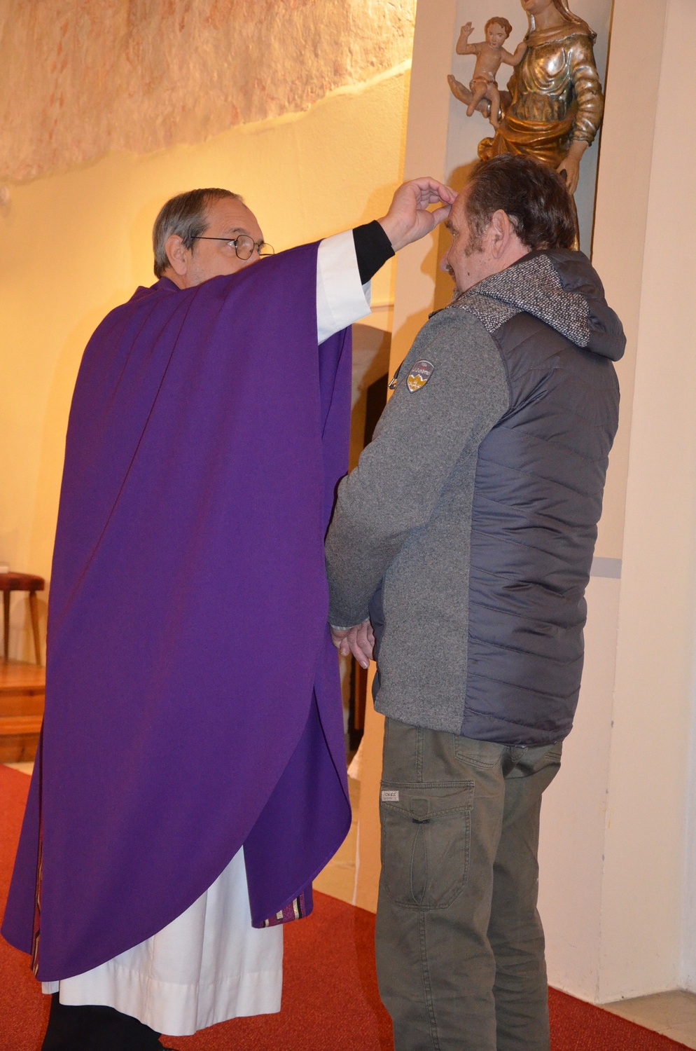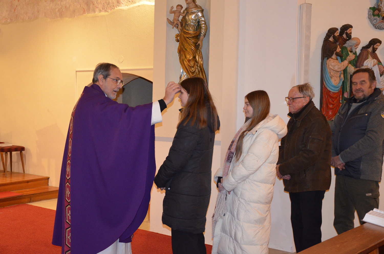 In diesem Jahr feierte Kaplan Adrian Boboruta mit uns die hl. Messe. In der Mitte des Gottesdienstes segnete er die Asche und spendete das Aschenkreuz mit den Worten „Kehre um und glaube an das Evangelium“. Ein schönes Zeichen der Gemeinschaft war es, als er selbst das Aschenkreuz von unserer ehemaligen Pastoralassistentin Helma Wachter empfing.