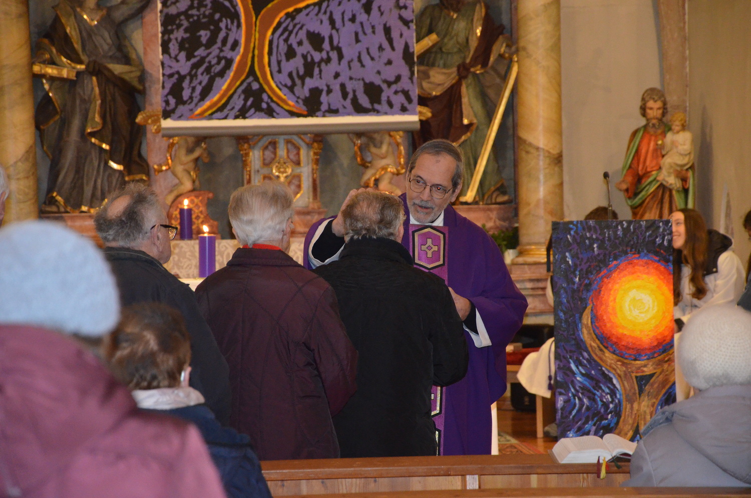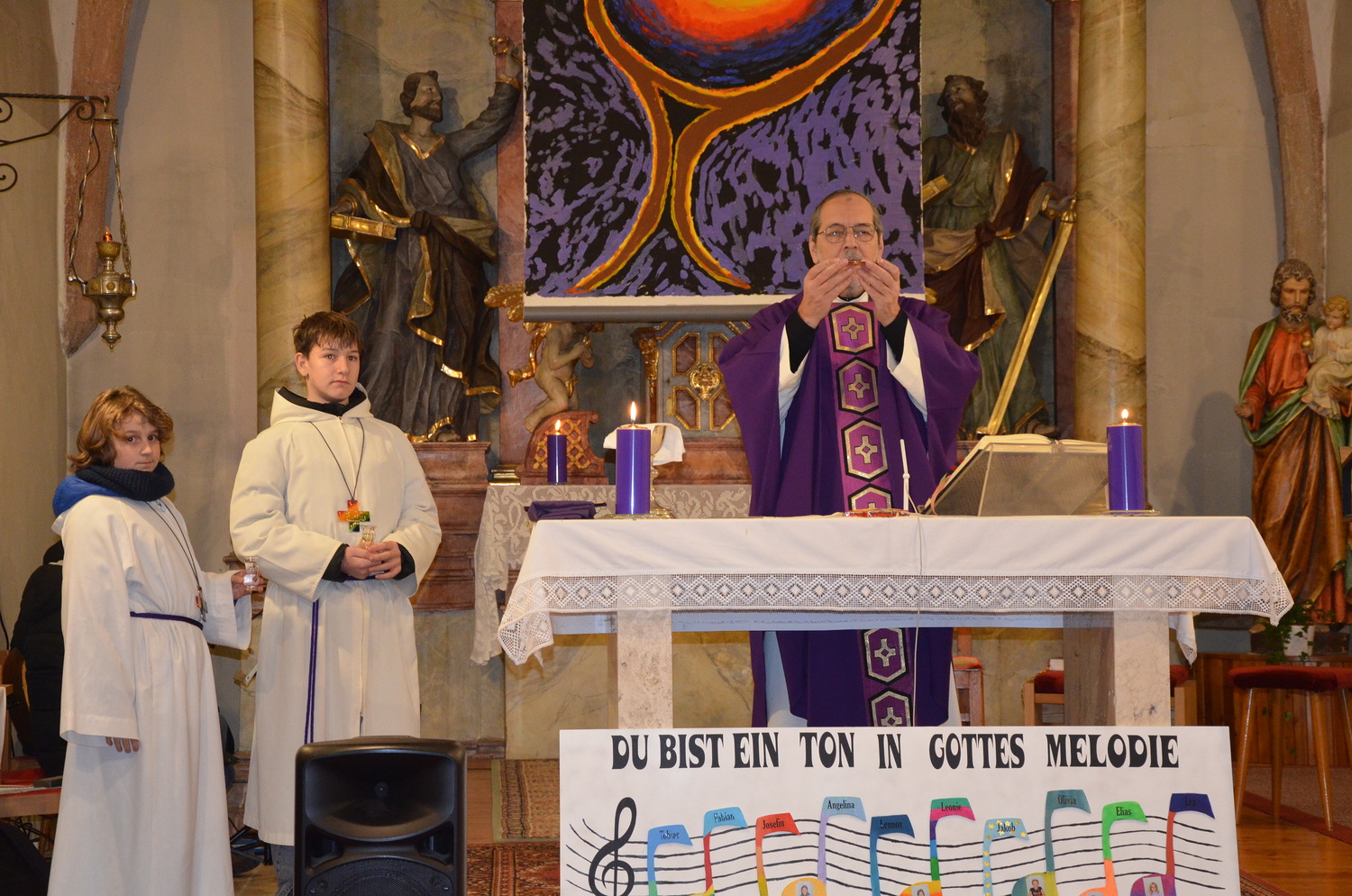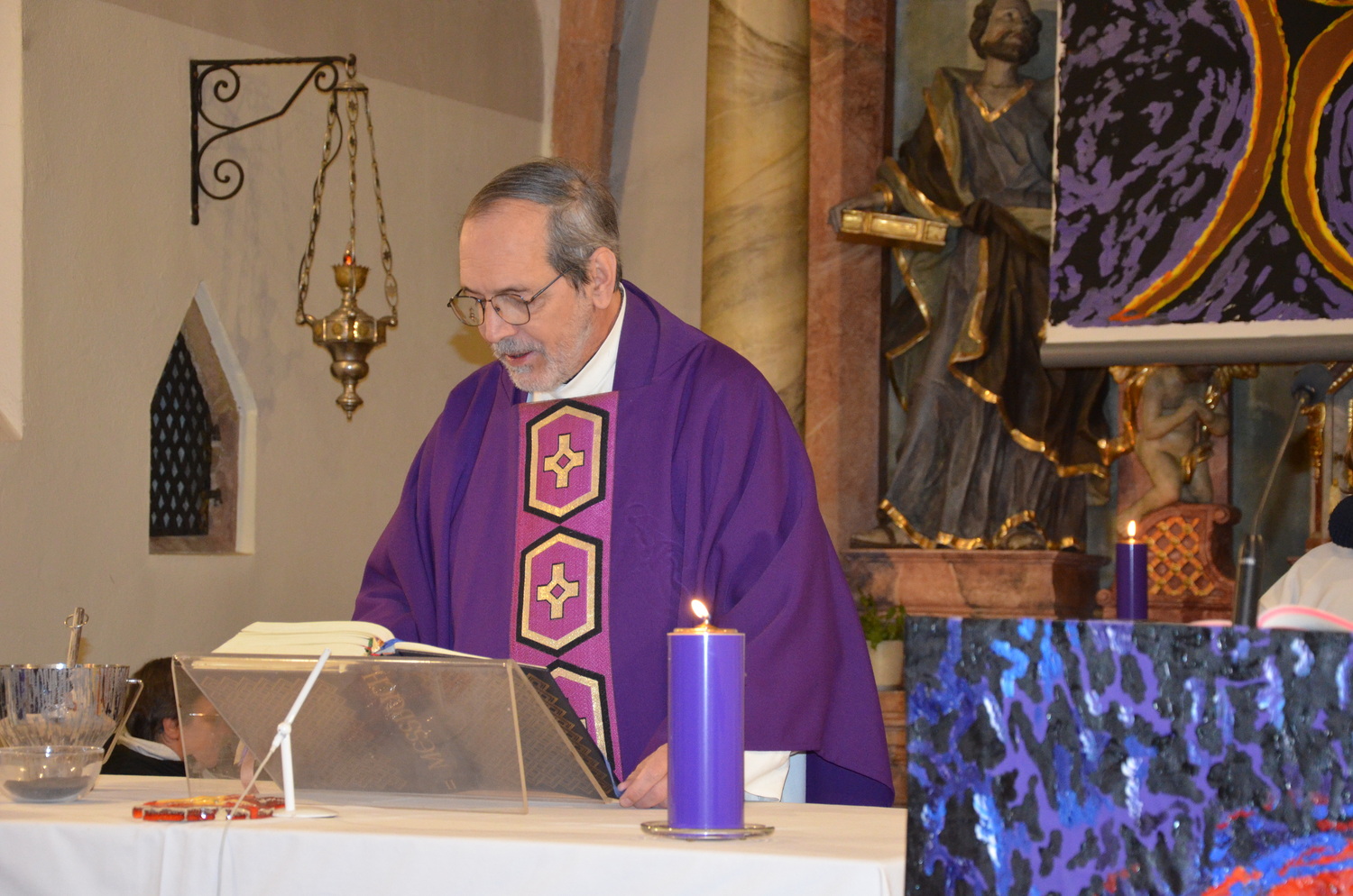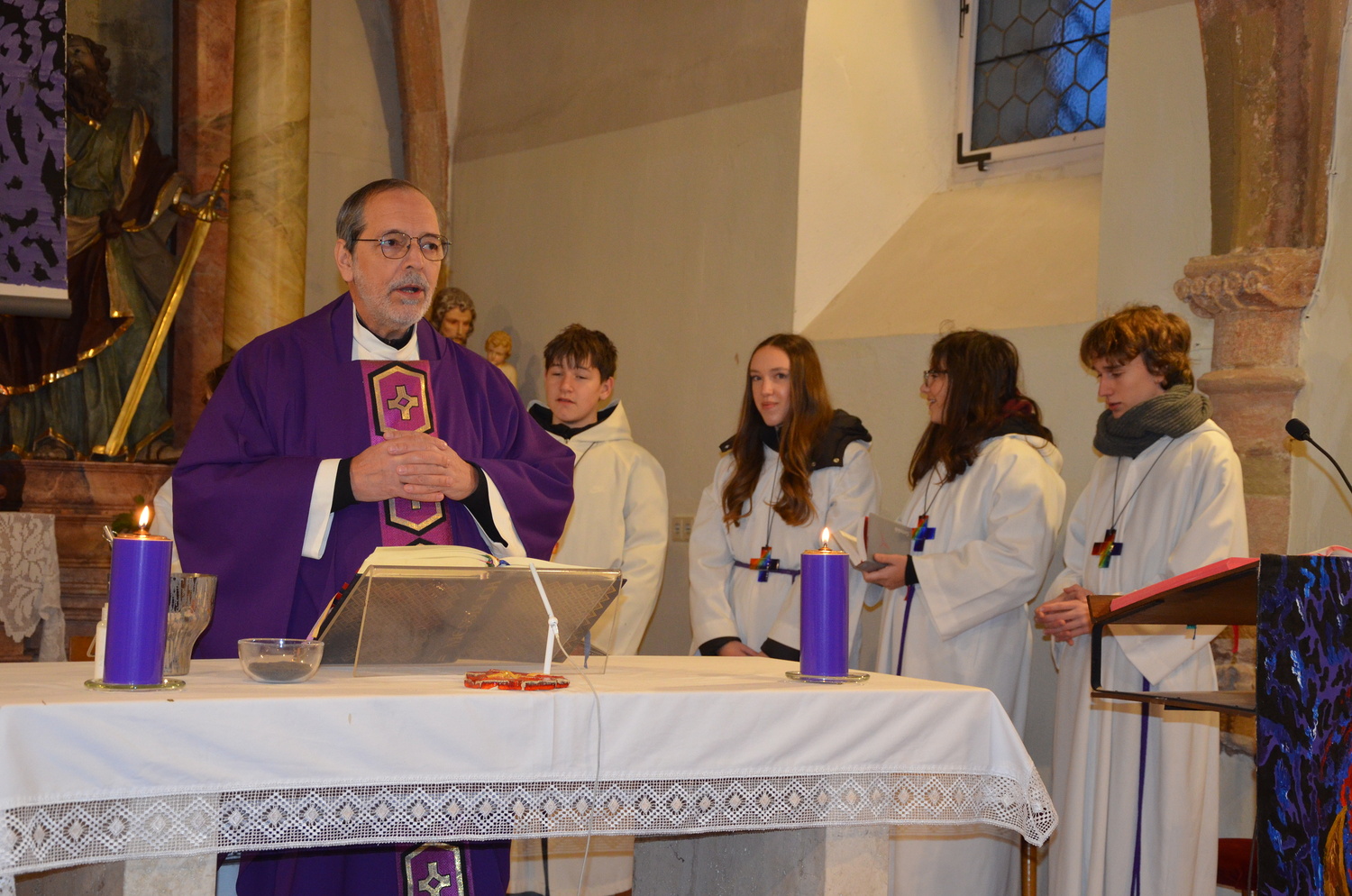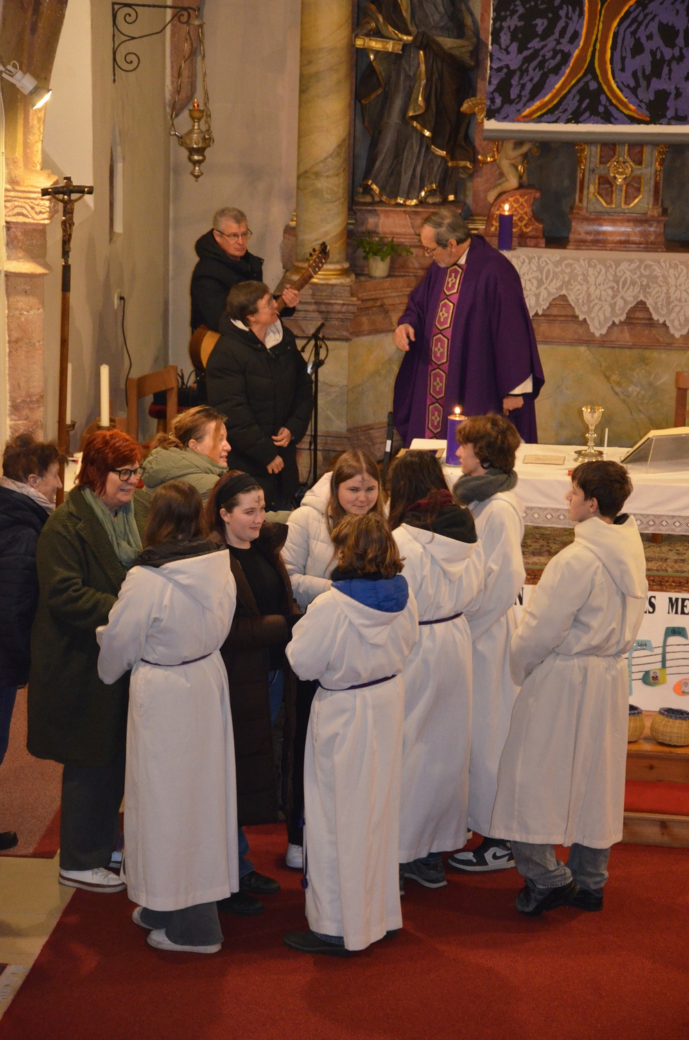 In diesem Jahr feierte Kaplan Adrian Boboruta mit uns die hl. Messe. In der Mitte des Gottesdienstes segnete er die Asche und spendete das Aschenkreuz mit den Worten „Kehre um und glaube an das Evangelium“. Ein schönes Zeichen der Gemeinschaft war es, als er selbst das Aschenkreuz von unserer ehemaligen Pastoralassistentin Helma Wachter empfing.