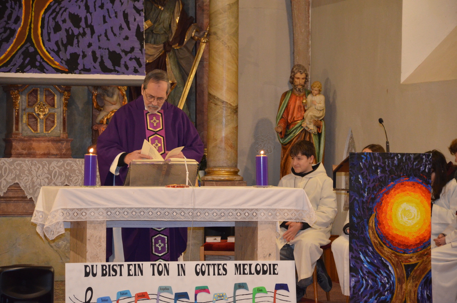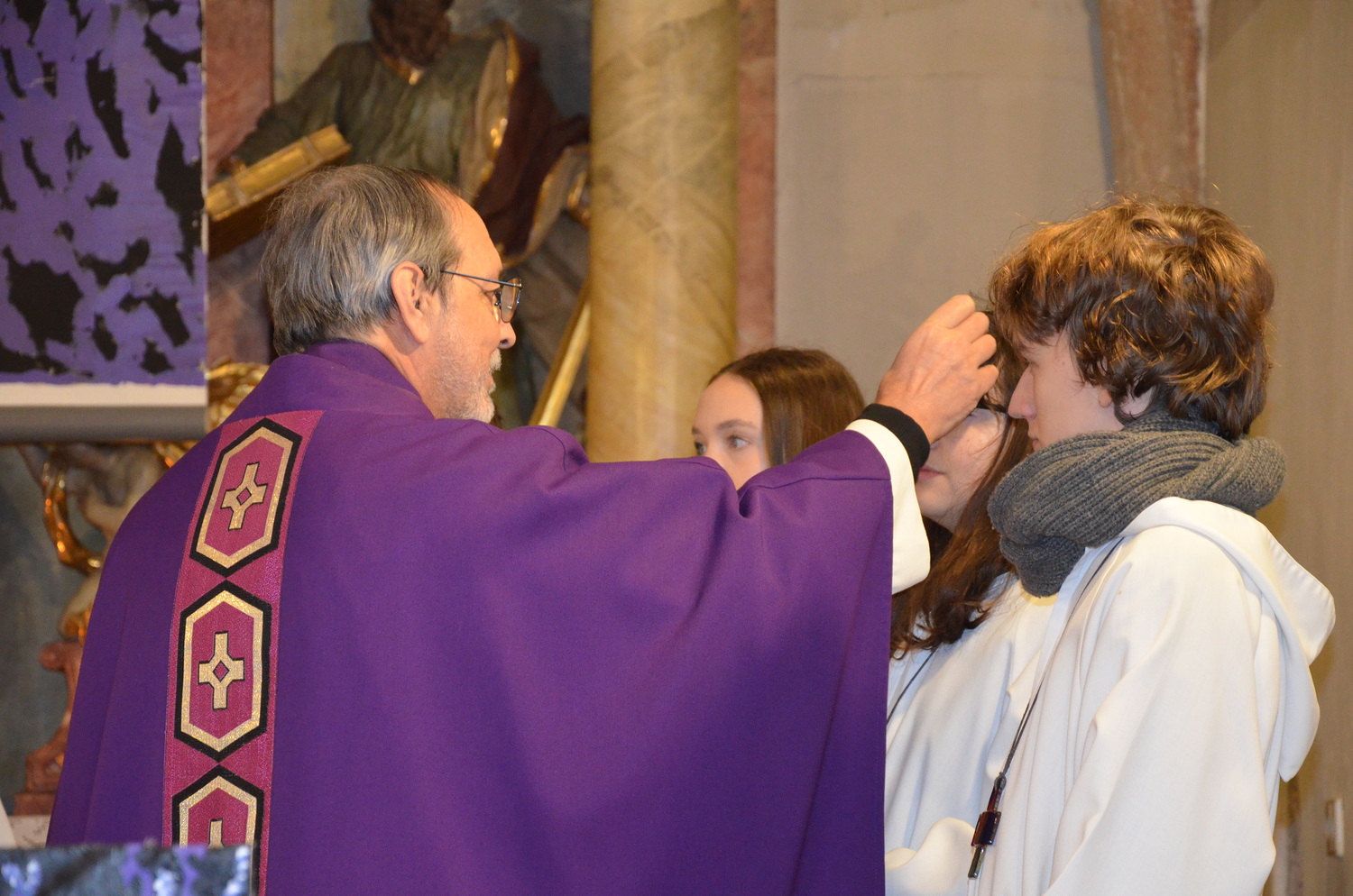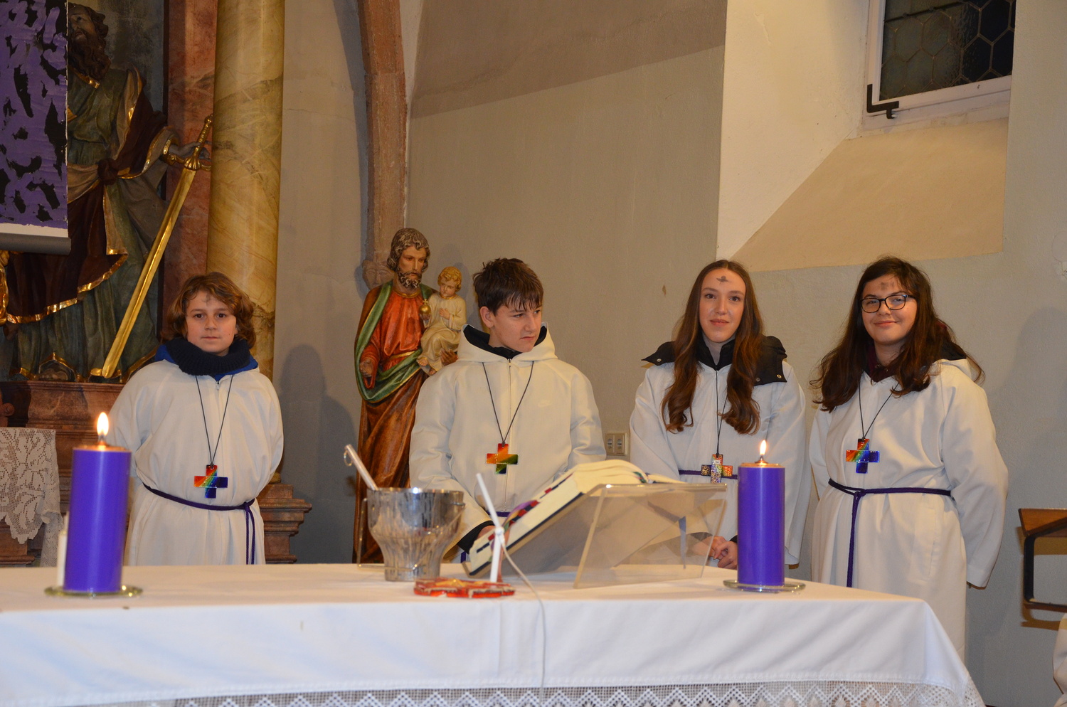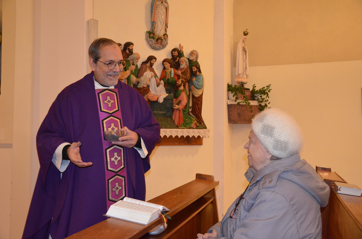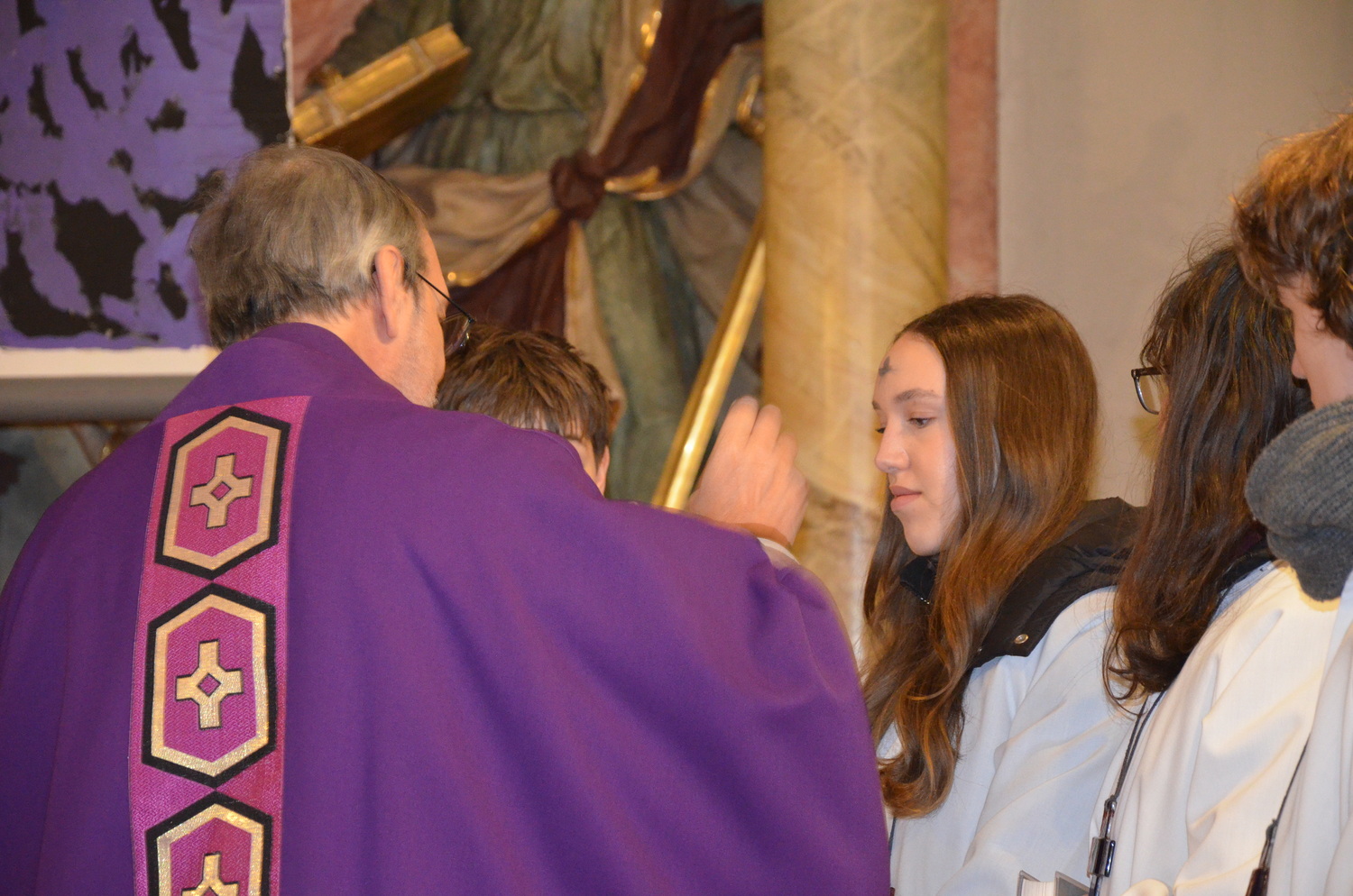 In diesem Jahr feierte Kaplan Adrian Boboruta mit uns die hl. Messe. In der Mitte des Gottesdienstes segnete er die Asche und spendete das Aschenkreuz mit den Worten „Kehre um und glaube an das Evangelium“. Ein schönes Zeichen der Gemeinschaft war es, als er selbst das Aschenkreuz von unserer ehemaligen Pastoralassistentin Helma Wachter empfing.