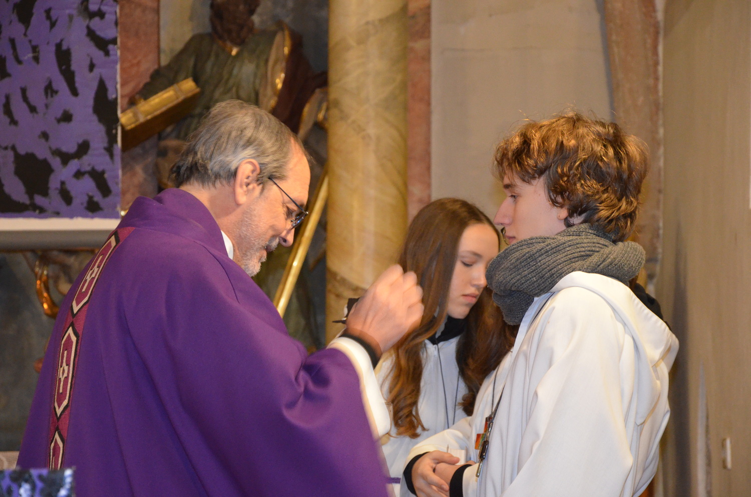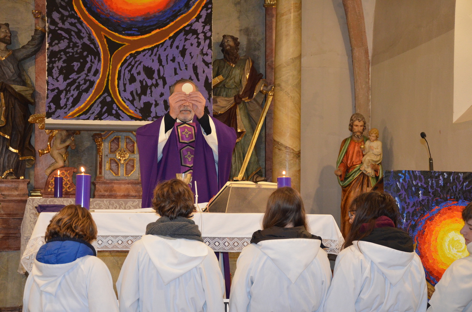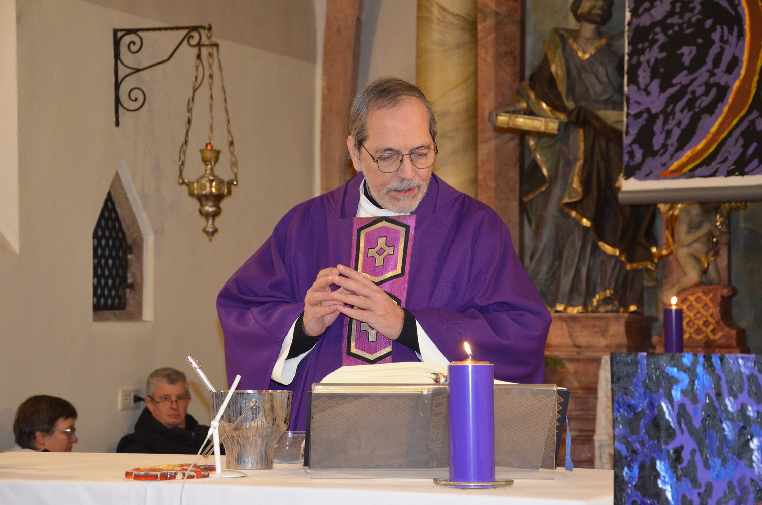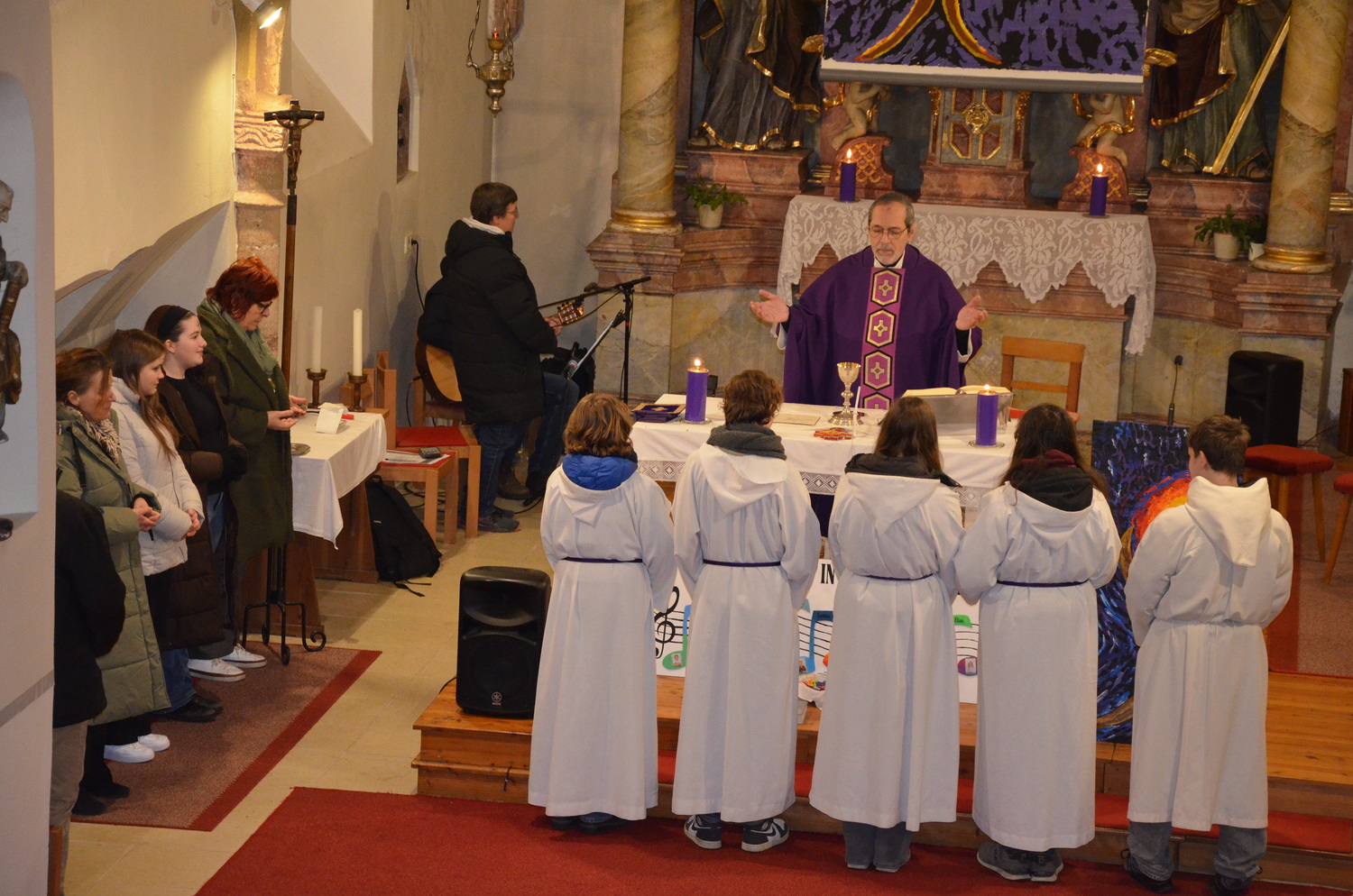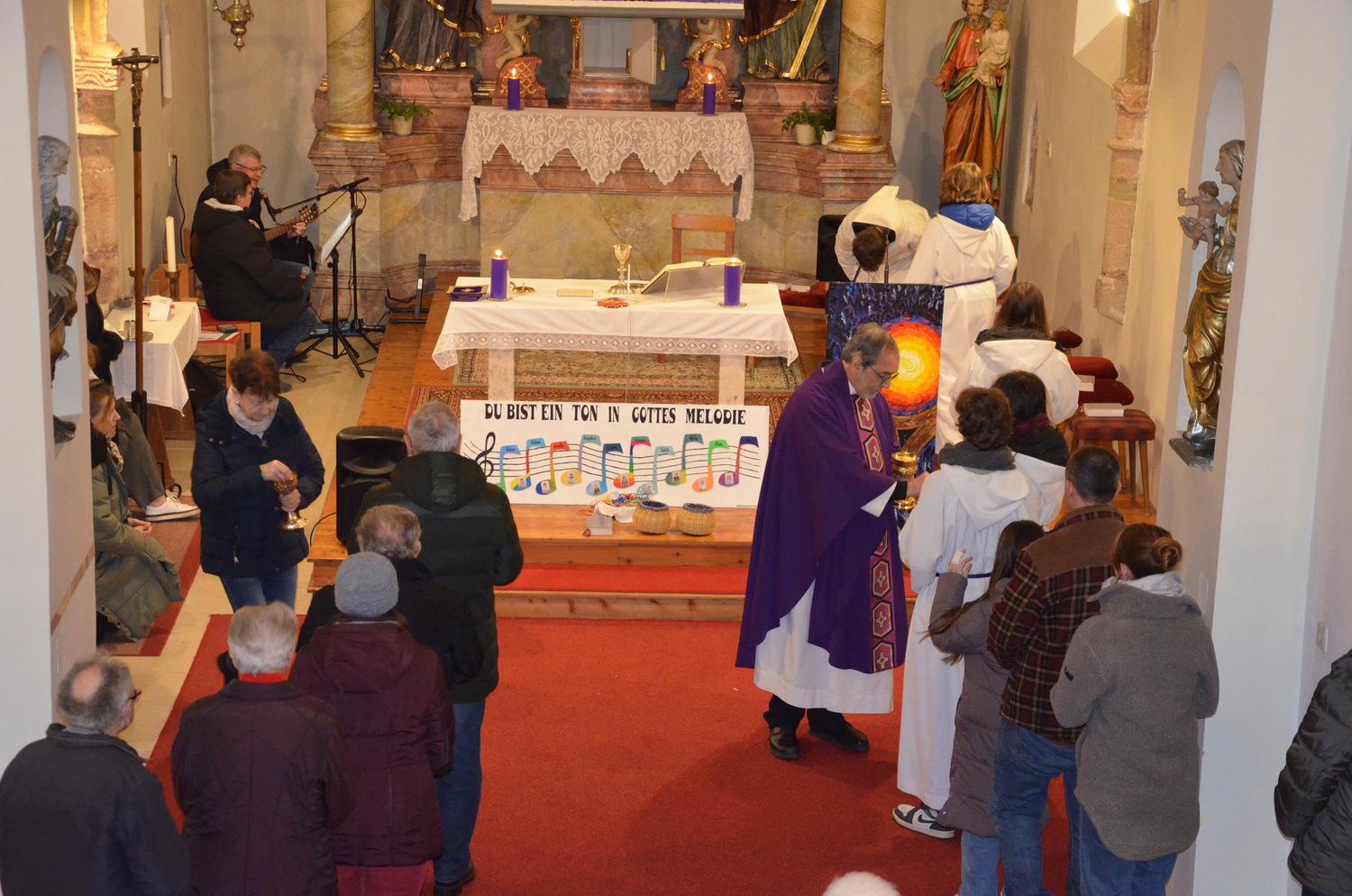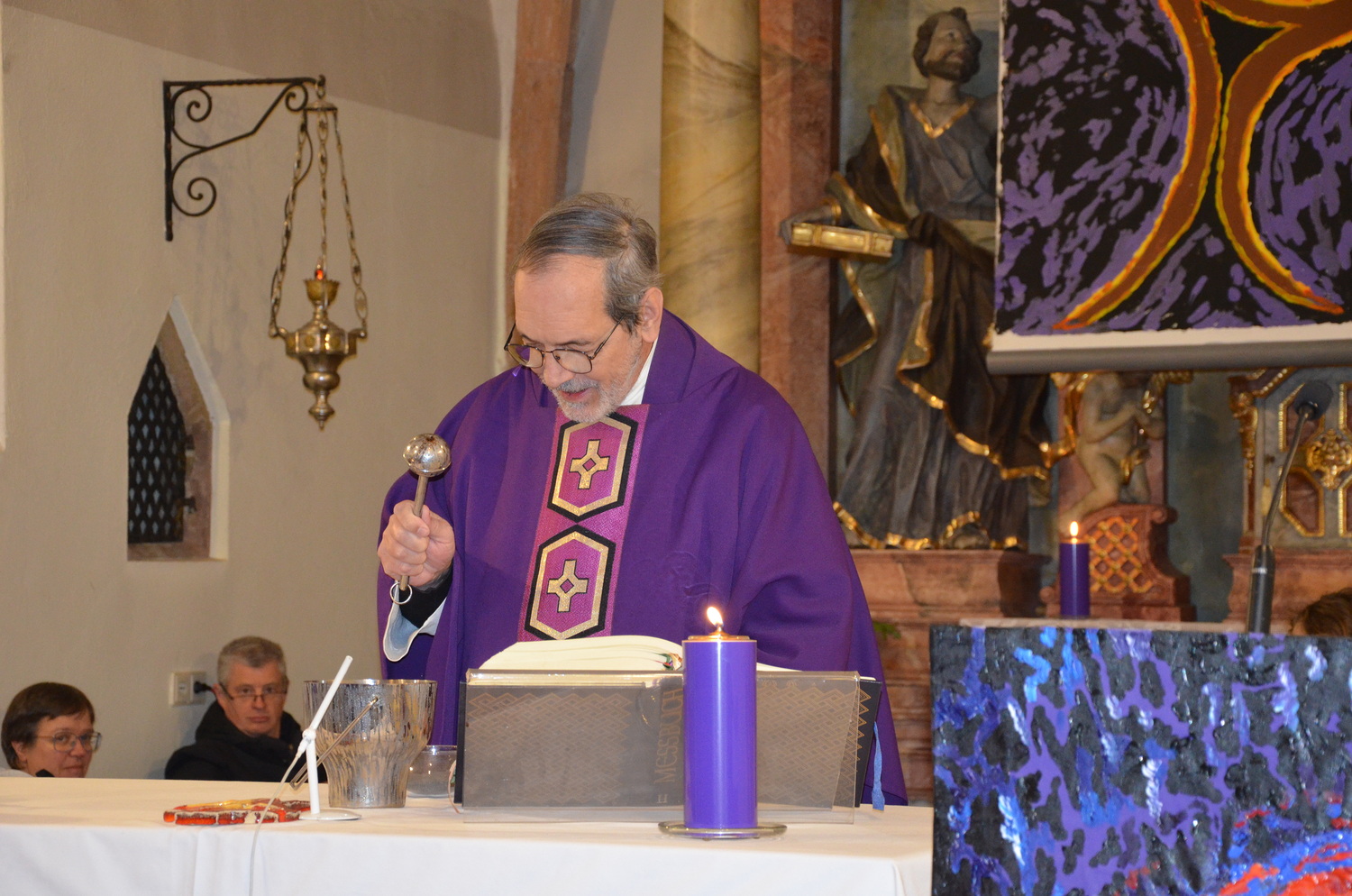 In diesem Jahr feierte Kaplan Adrian Boboruta mit uns die hl. Messe. In der Mitte des Gottesdienstes segnete er die Asche und spendete das Aschenkreuz mit den Worten „Kehre um und glaube an das Evangelium“. Ein schönes Zeichen der Gemeinschaft war es, als er selbst das Aschenkreuz von unserer ehemaligen Pastoralassistentin Helma Wachter empfing.