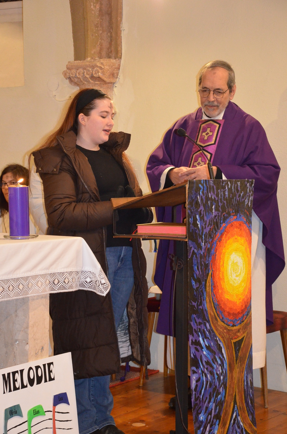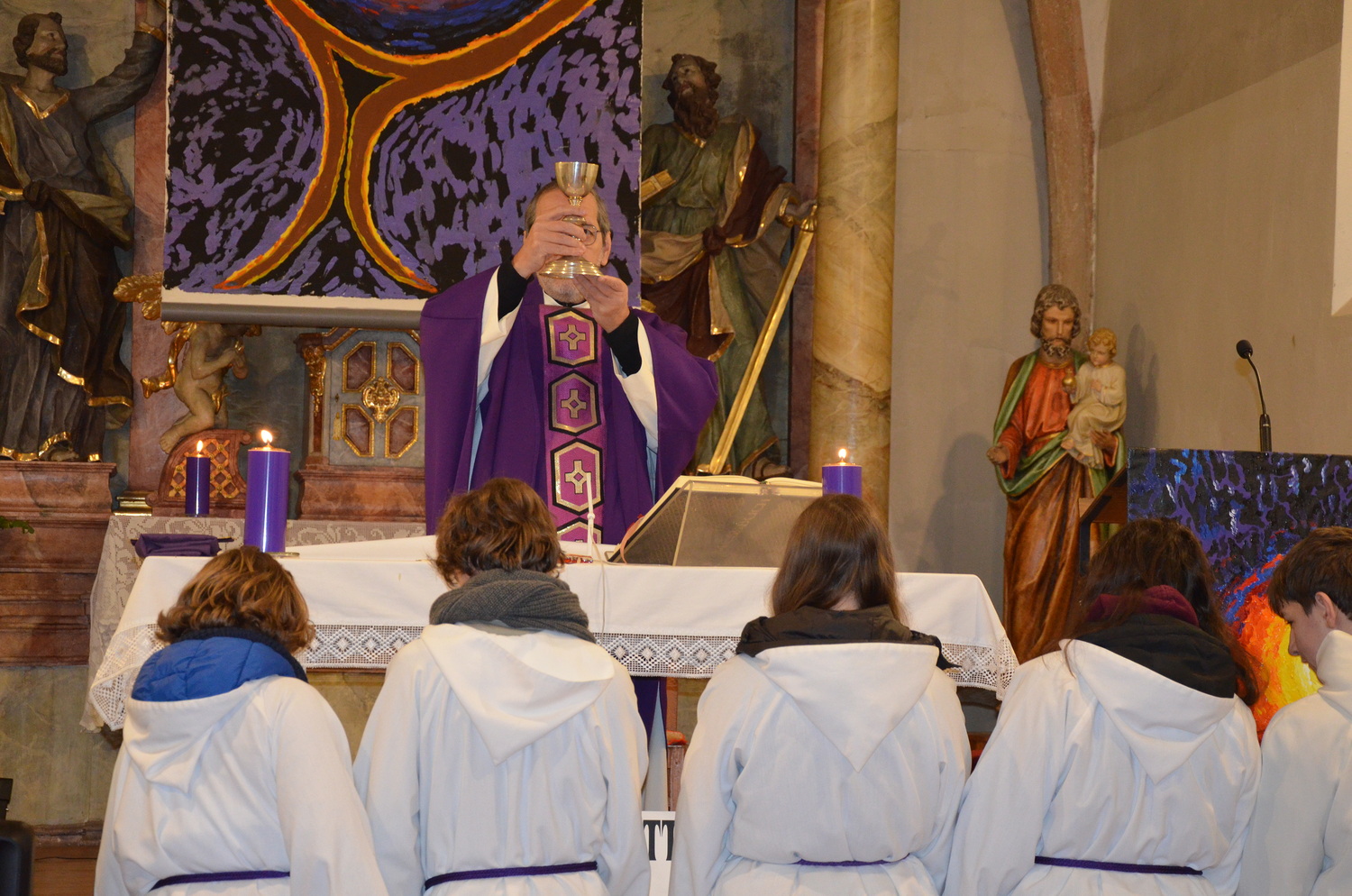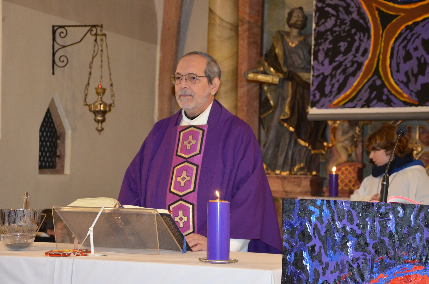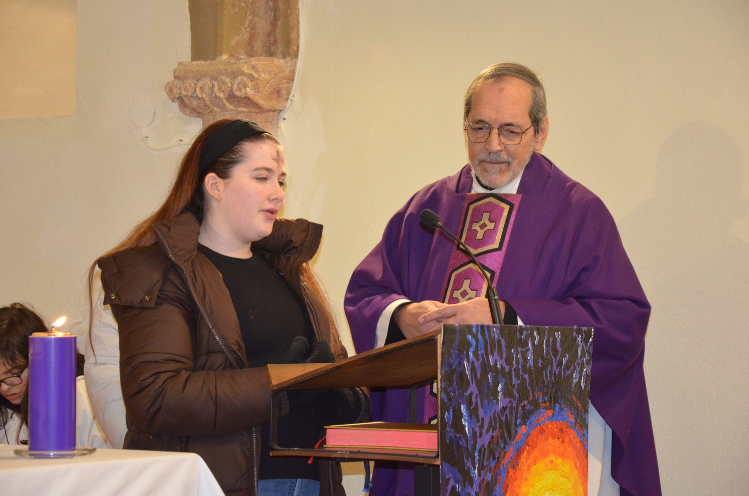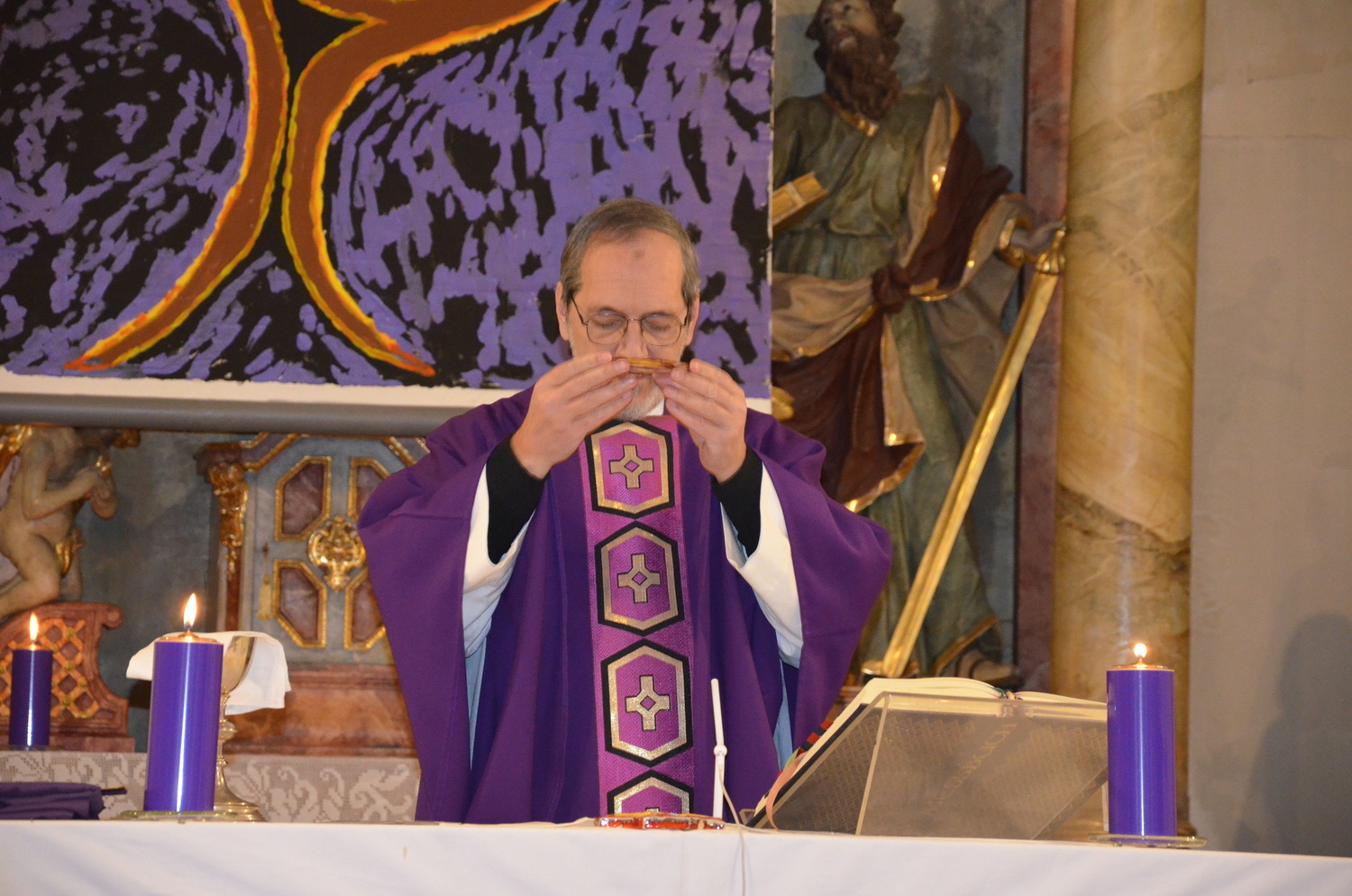 In diesem Jahr feierte Kaplan Adrian Boboruta mit uns die hl. Messe. In der Mitte des Gottesdienstes segnete er die Asche und spendete das Aschenkreuz mit den Worten „Kehre um und glaube an das Evangelium“. Ein schönes Zeichen der Gemeinschaft war es, als er selbst das Aschenkreuz von unserer ehemaligen Pastoralassistentin Helma Wachter empfing.