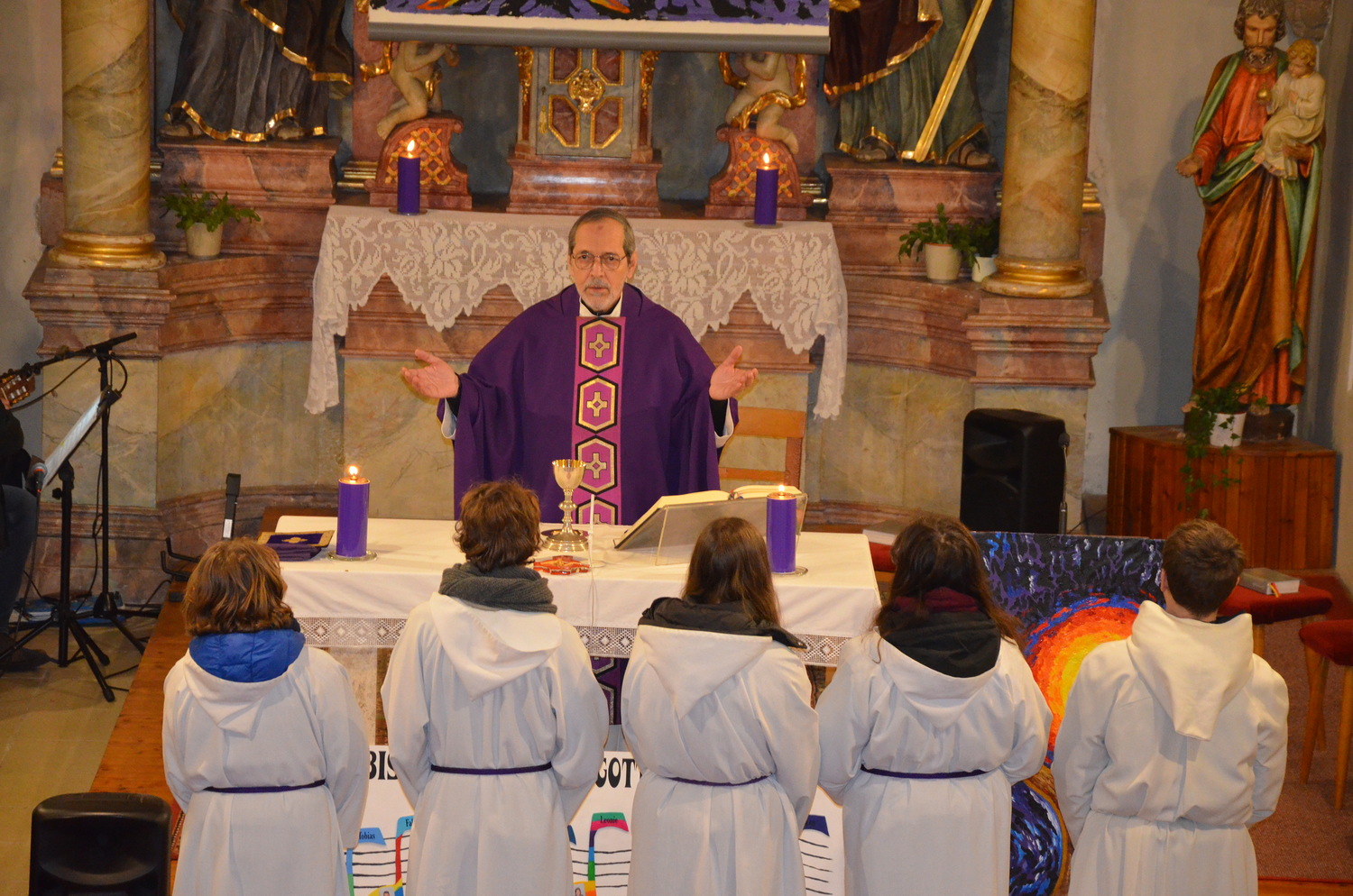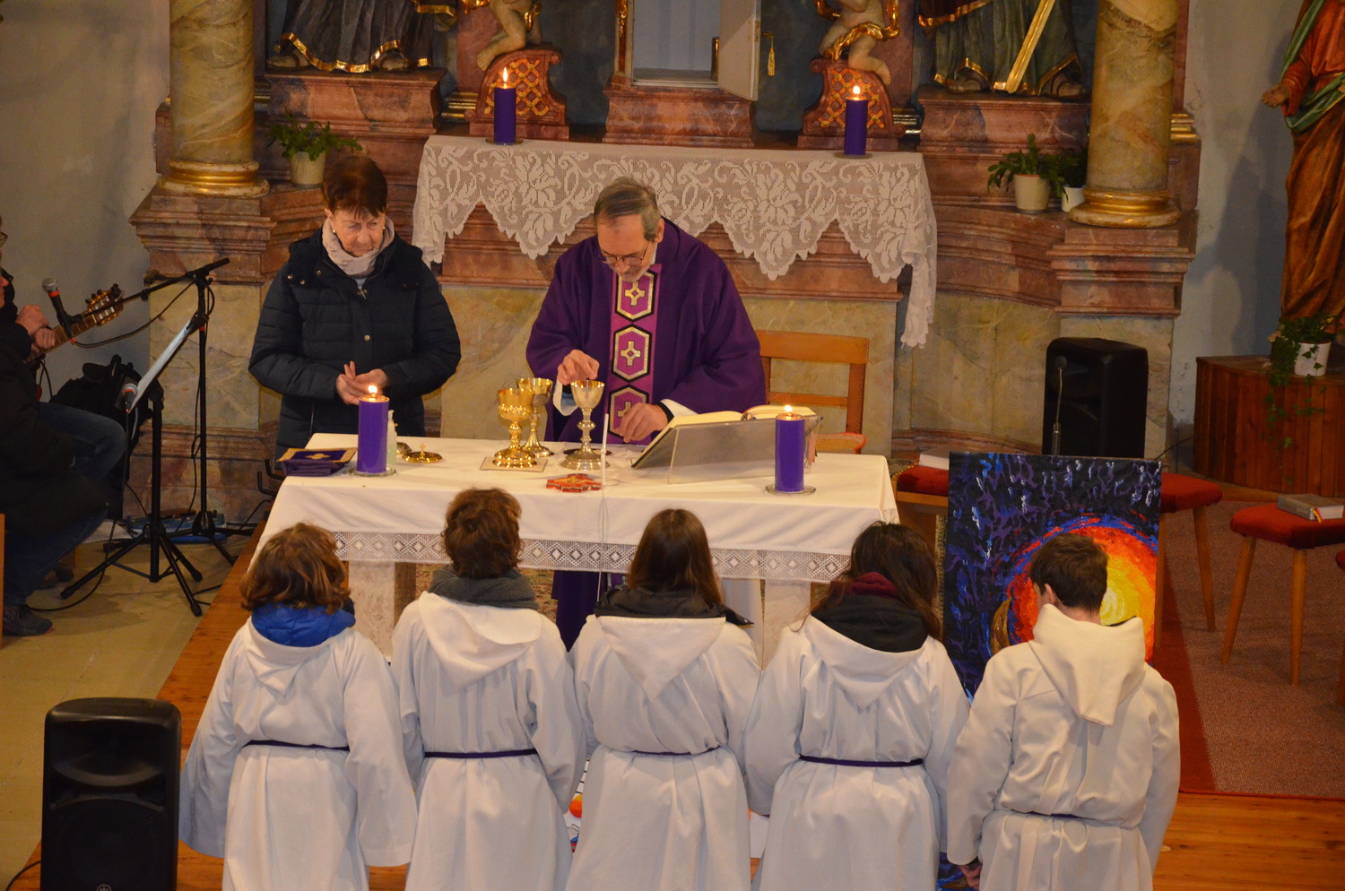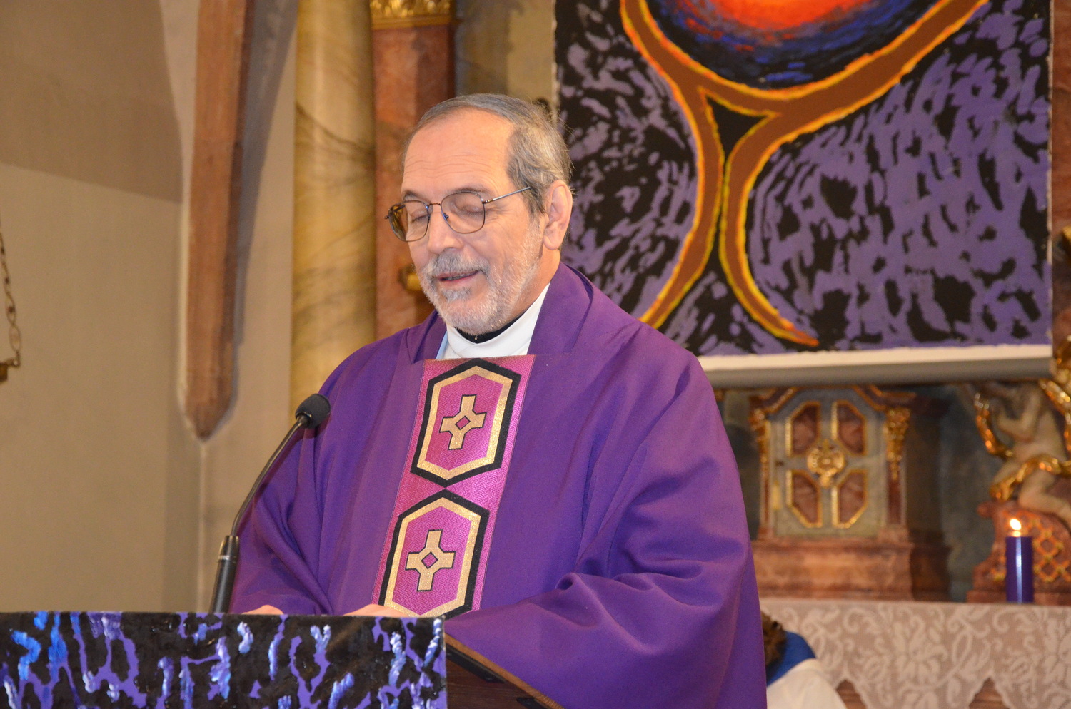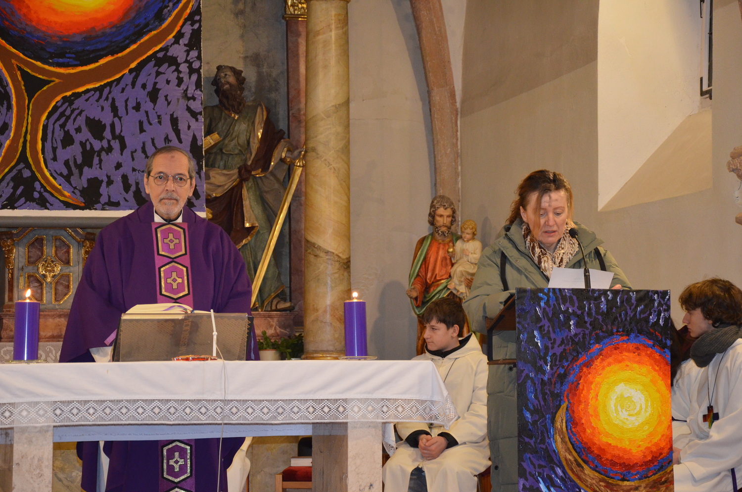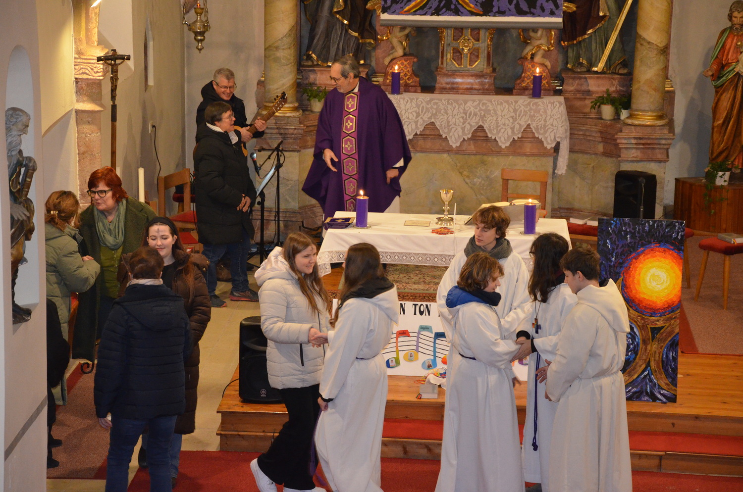 In diesem Jahr feierte Kaplan Adrian Boboruta mit uns die hl. Messe. In der Mitte des Gottesdienstes segnete er die Asche und spendete das Aschenkreuz mit den Worten „Kehre um und glaube an das Evangelium“. Ein schönes Zeichen der Gemeinschaft war es, als er selbst das Aschenkreuz von unserer ehemaligen Pastoralassistentin Helma Wachter empfing.