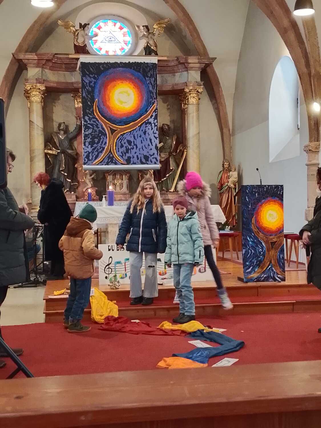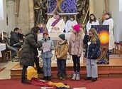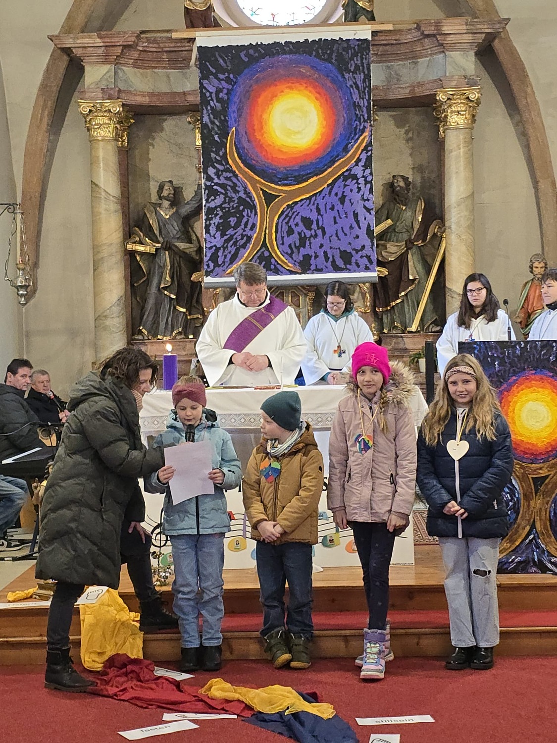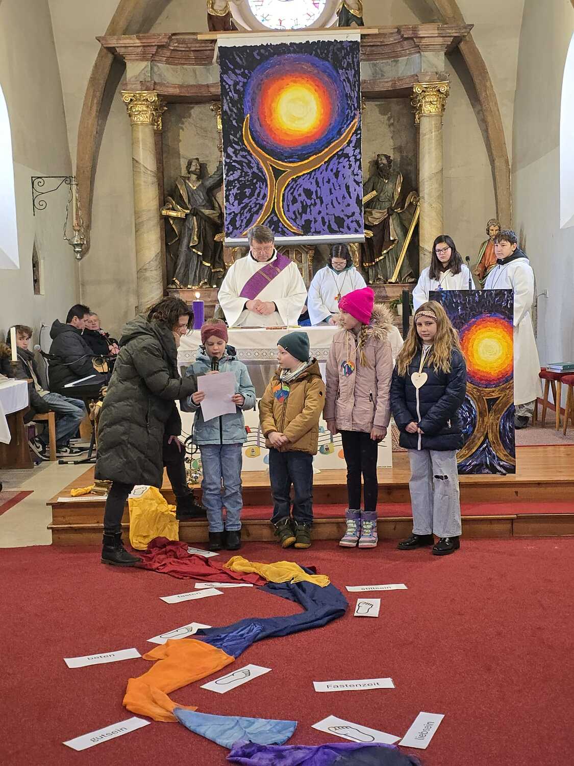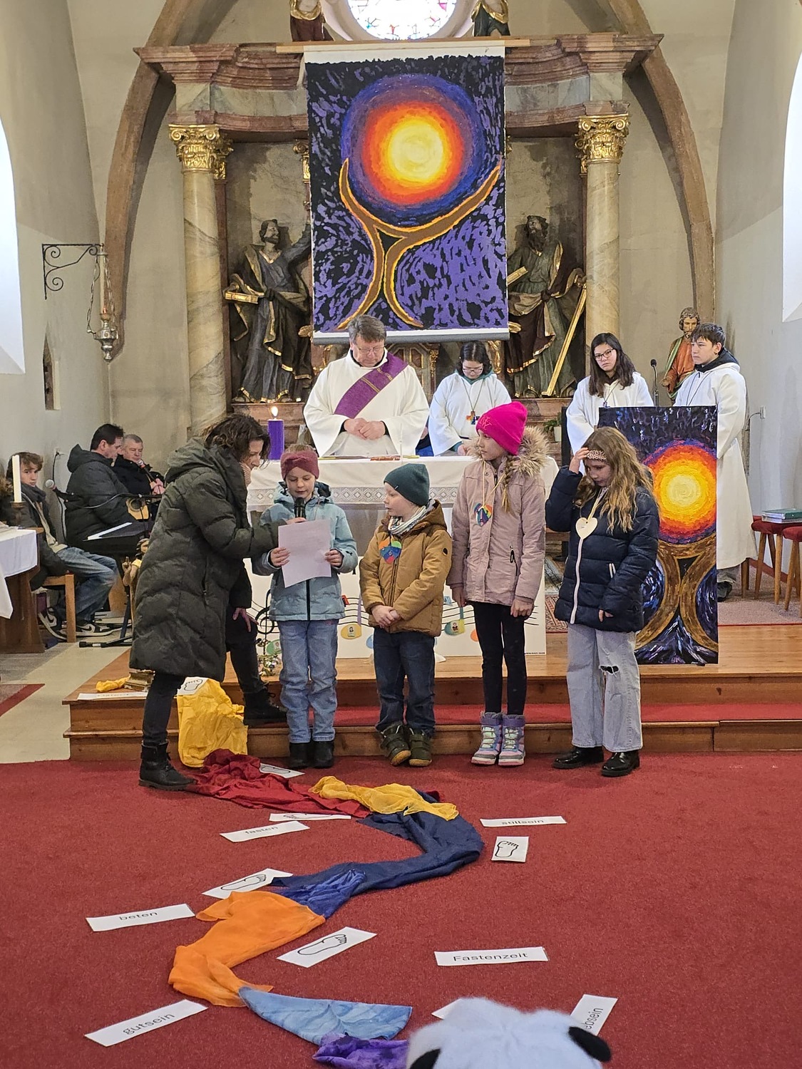 Wie man auf den Fotos sehen kann waren vor allem auch einige Erstkommunionkinder da, um unseren Diakon Hans beim Gottesdienst zu helfen und mitzugestalten. Es war die Fastenzeit durch einen bunten Weg mit Seidentüchern sichtbar gemacht – von Aschermittwoch bis Ostern.