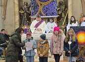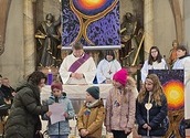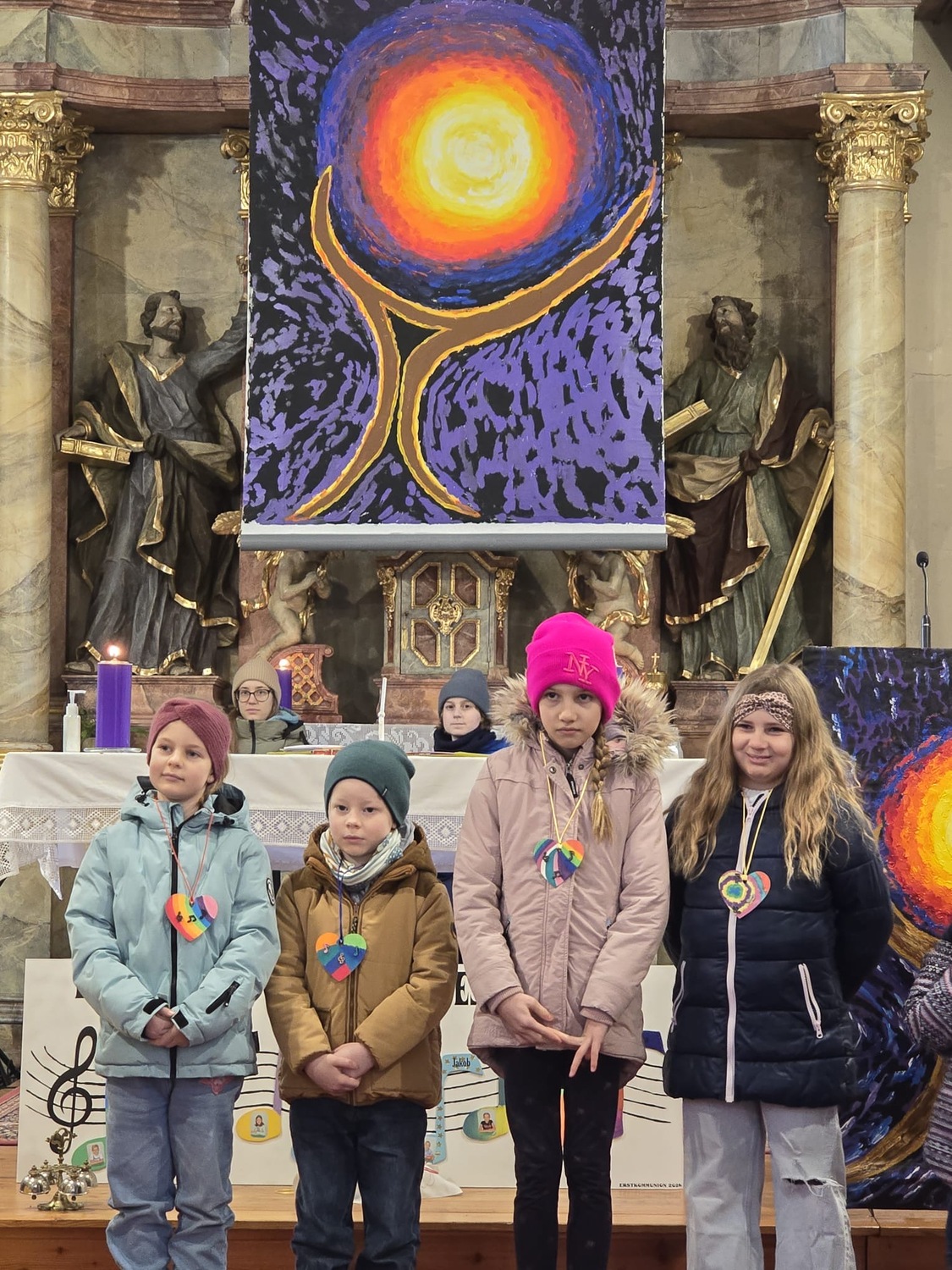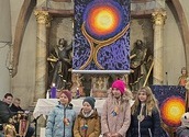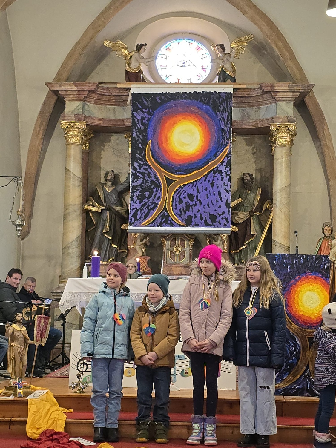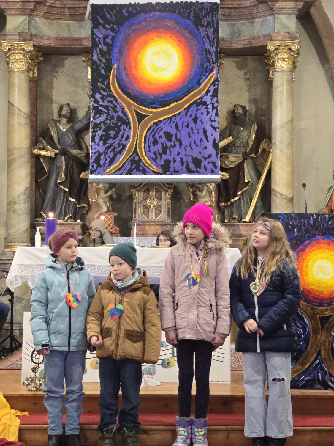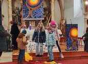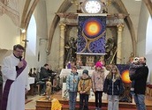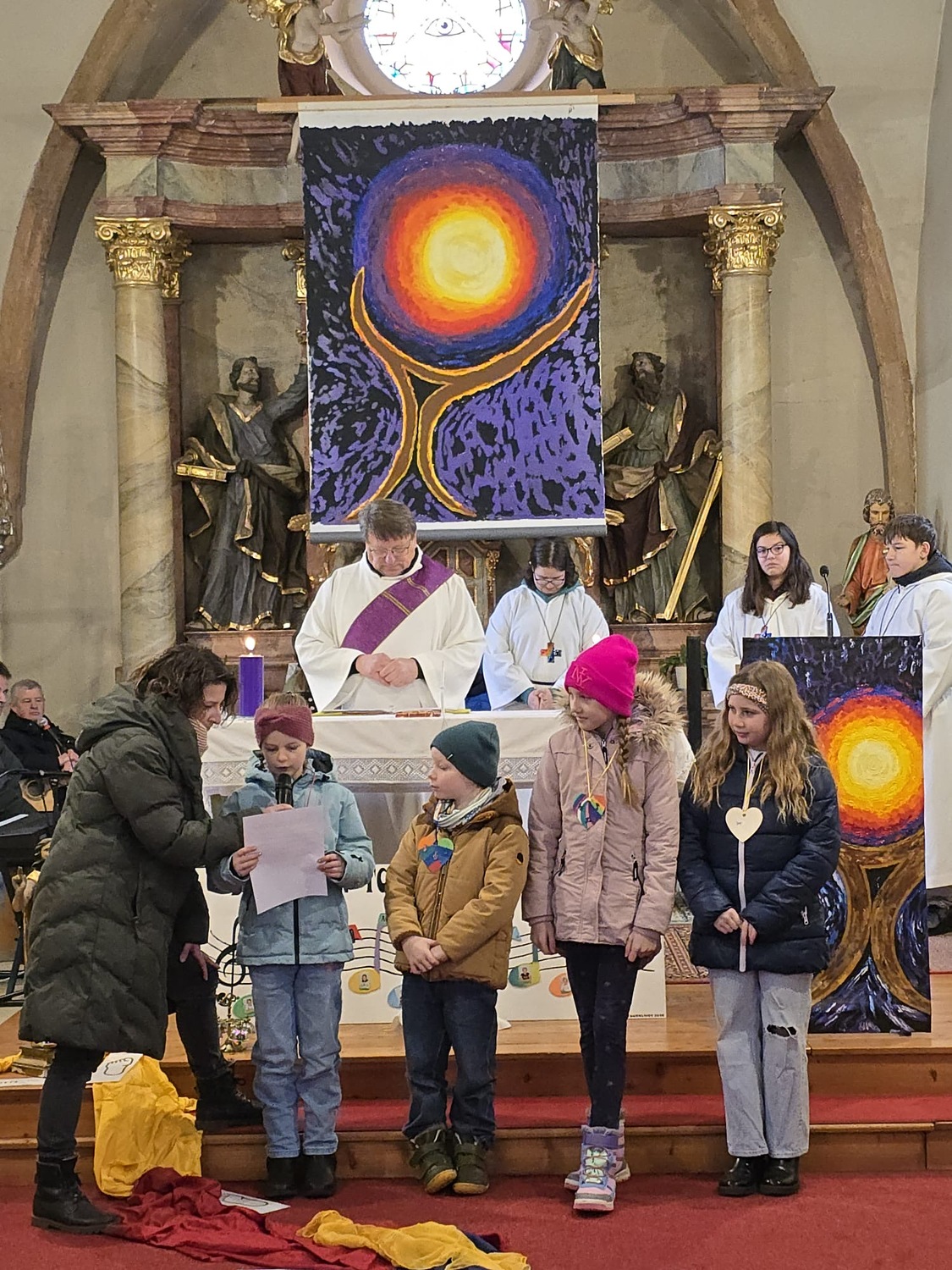 Wie man auf den Fotos sehen kann waren vor allem auch einige Erstkommunionkinder da, um unseren Diakon Hans beim Gottesdienst zu helfen und mitzugestalten. Es war die Fastenzeit durch einen bunten Weg mit Seidentüchern sichtbar gemacht – von Aschermittwoch bis Ostern.