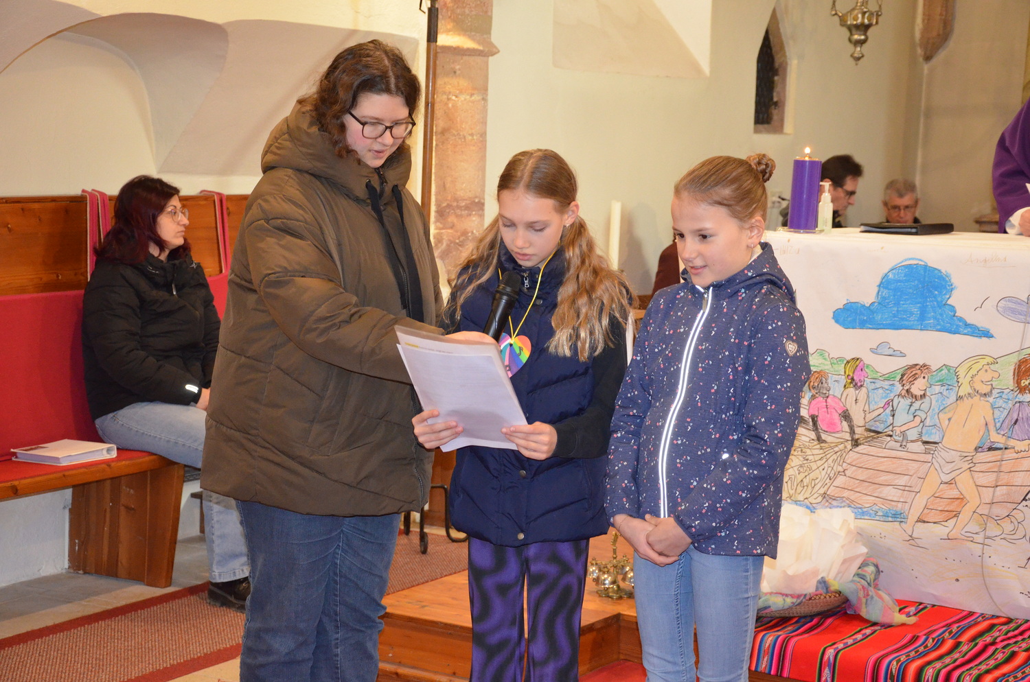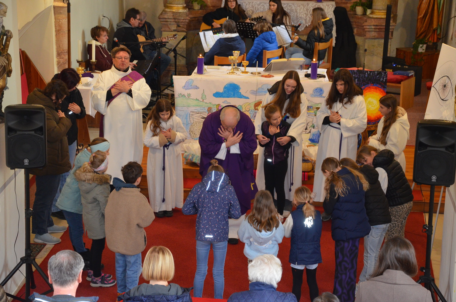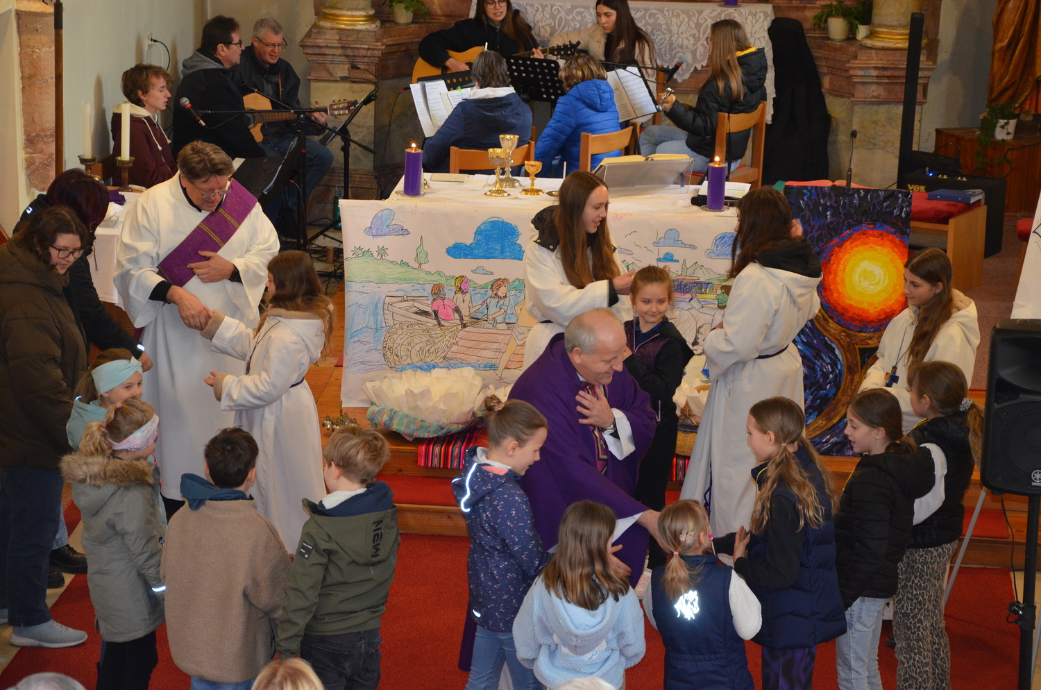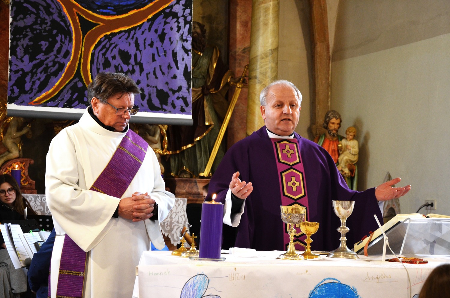 Am Sonntag zelebrierten Pfarrer Liviu Balascuti und Diakon Hans Wachter den „Minibrot“-Gottesdienst. Die jungen Brotbäckerinnen und Caroline Stach lasen Texte und Fürbitten und tanzten im musikalisch von O_M_TSCHI gestalteten Gottesdienst.