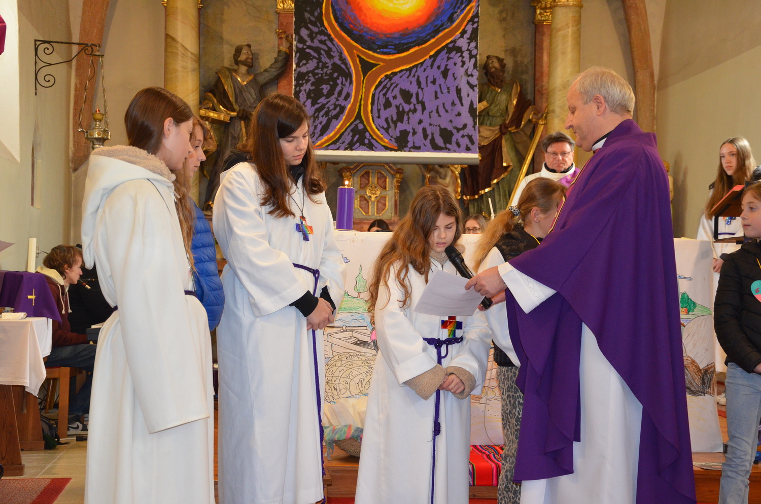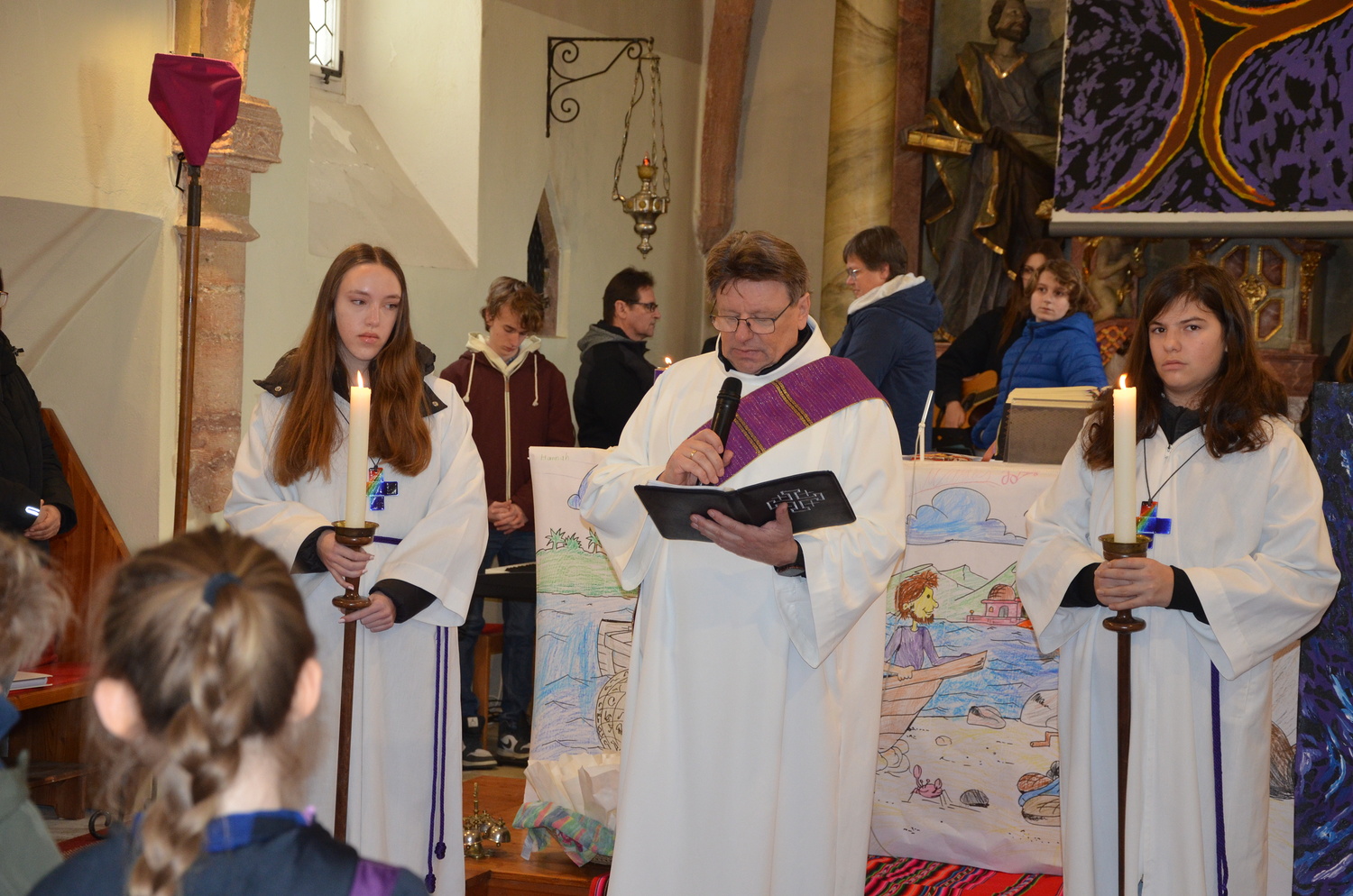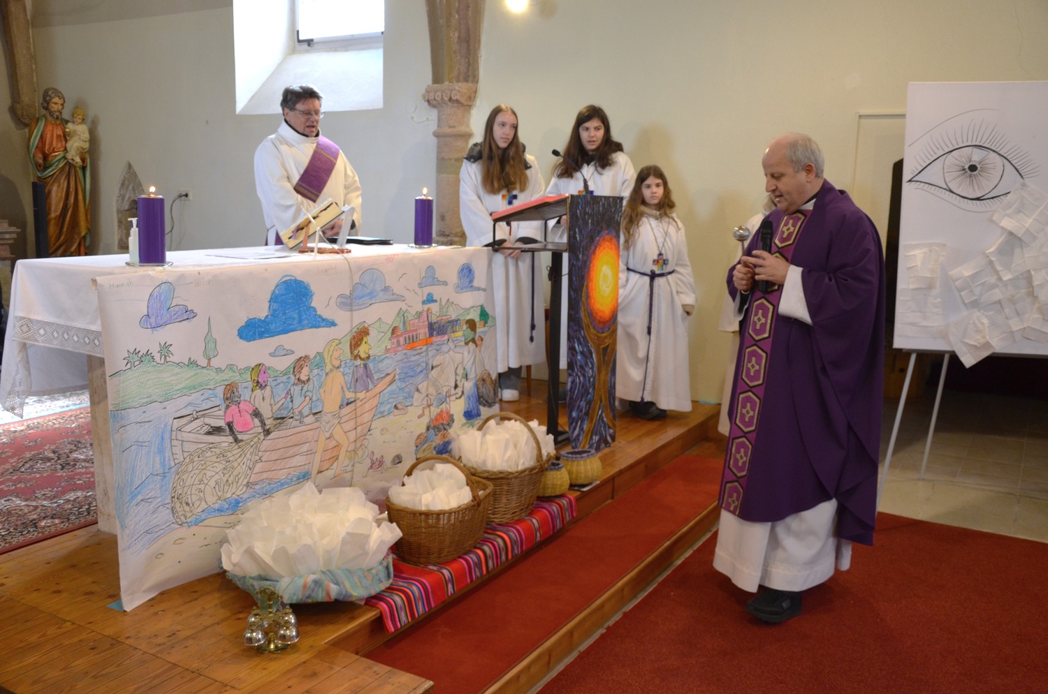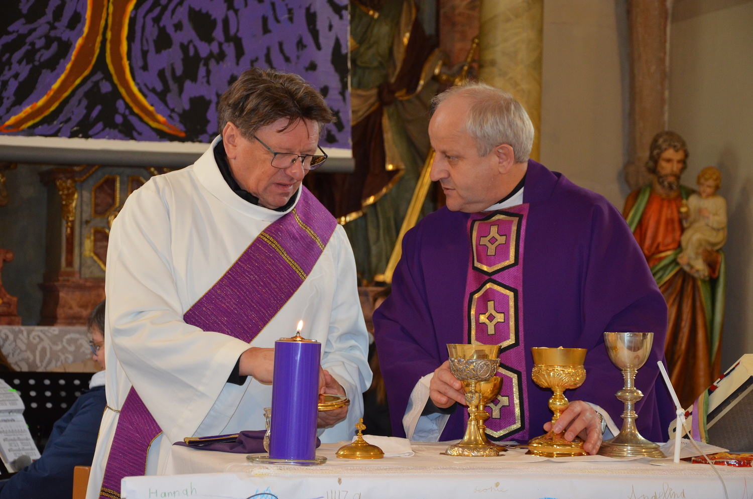 Am Sonntag zelebrierten Pfarrer Liviu Balascuti und Diakon Hans Wachter den „Minibrot“-Gottesdienst. Die jungen Brotbäckerinnen und Caroline Stach lasen Texte und Fürbitten und tanzten im musikalisch von O_M_TSCHI gestalteten Gottesdienst.