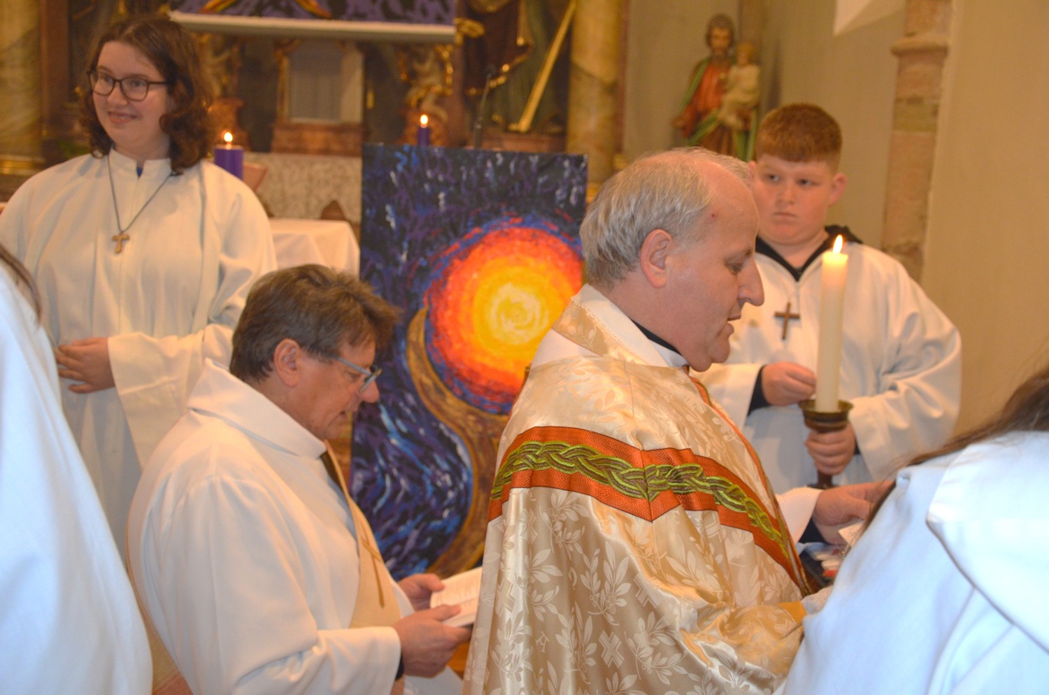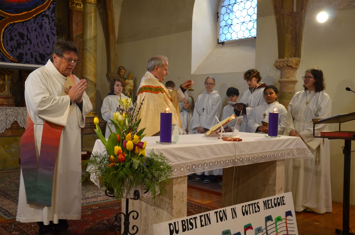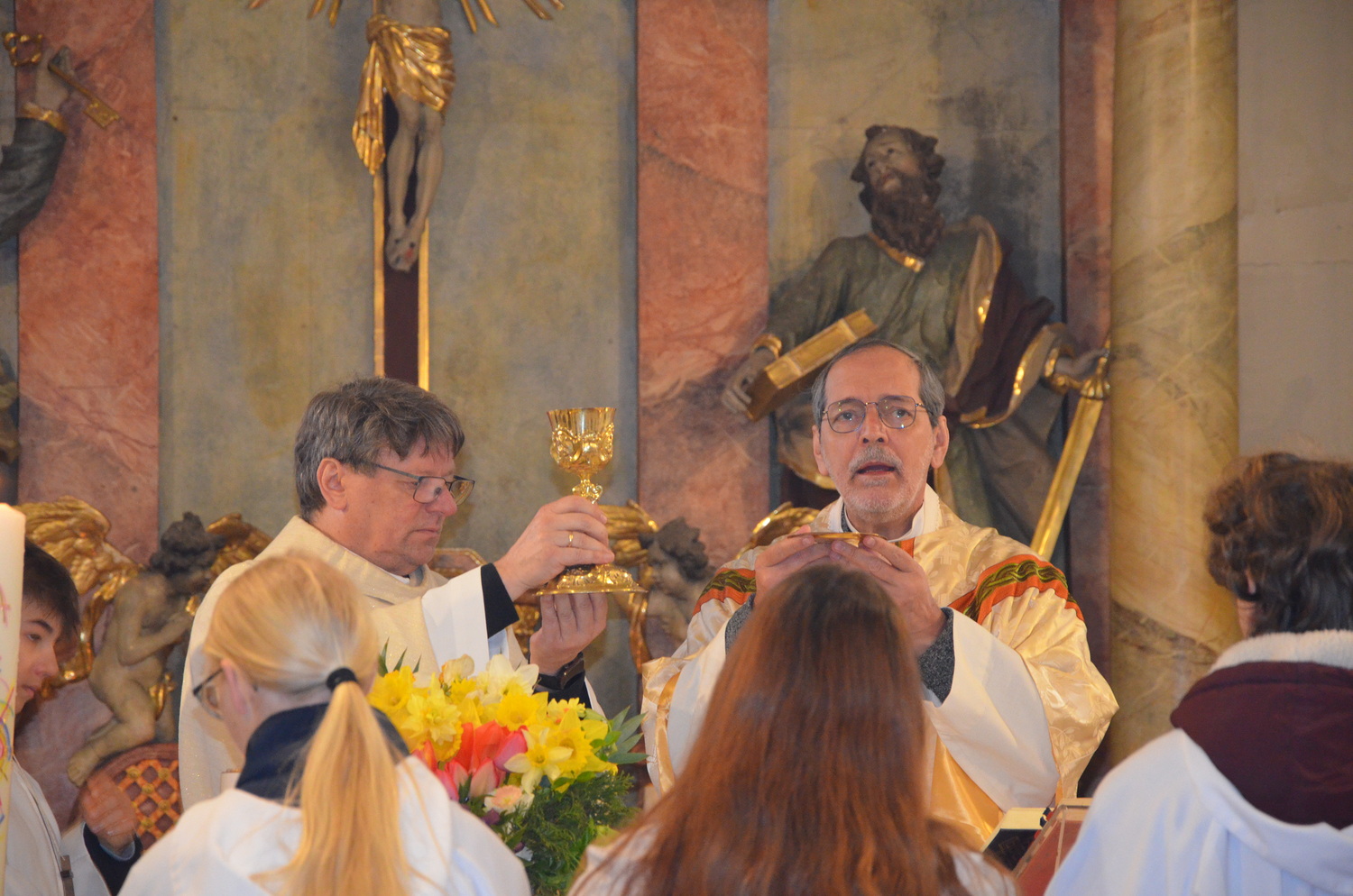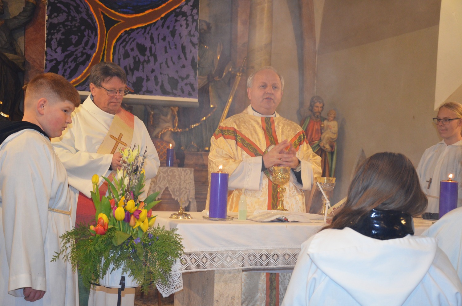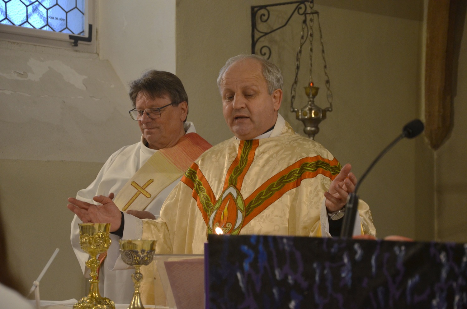 Den Gründonnerstaggottesdienst – die Feier des letzten Abendmahls Jesu mit seinen Jüngern - zelebrierte Pfarrer Liviu Balascuti mit Diakon Hans Wachter. Die Glocken und die Orgel verstummten nach dem Goria und die Ratschen übernahmen die nächsten Tage die Arbeit der Klingeln und Glocken.