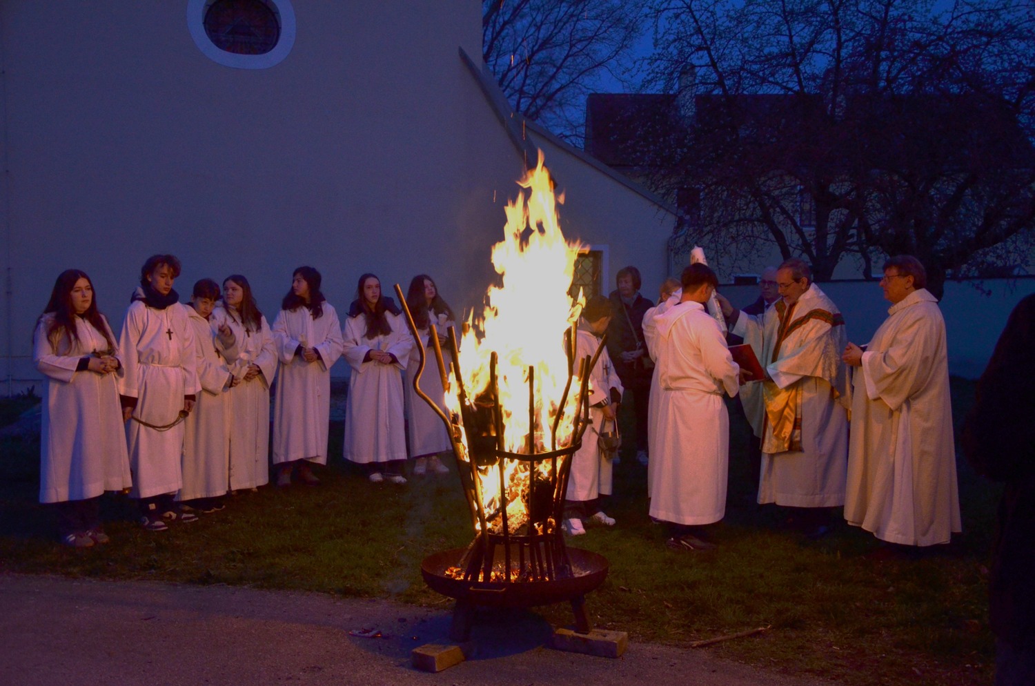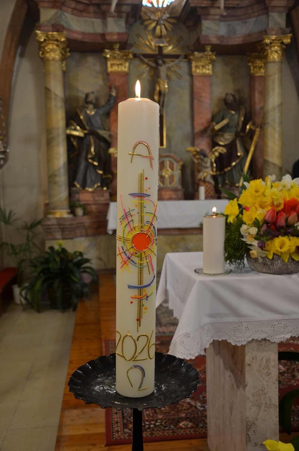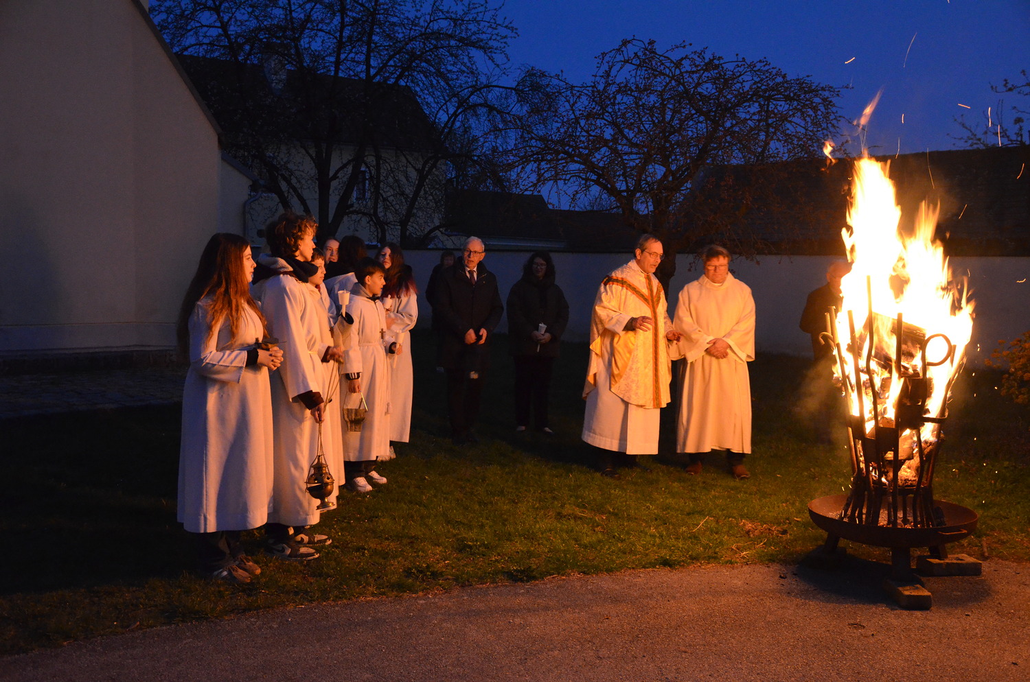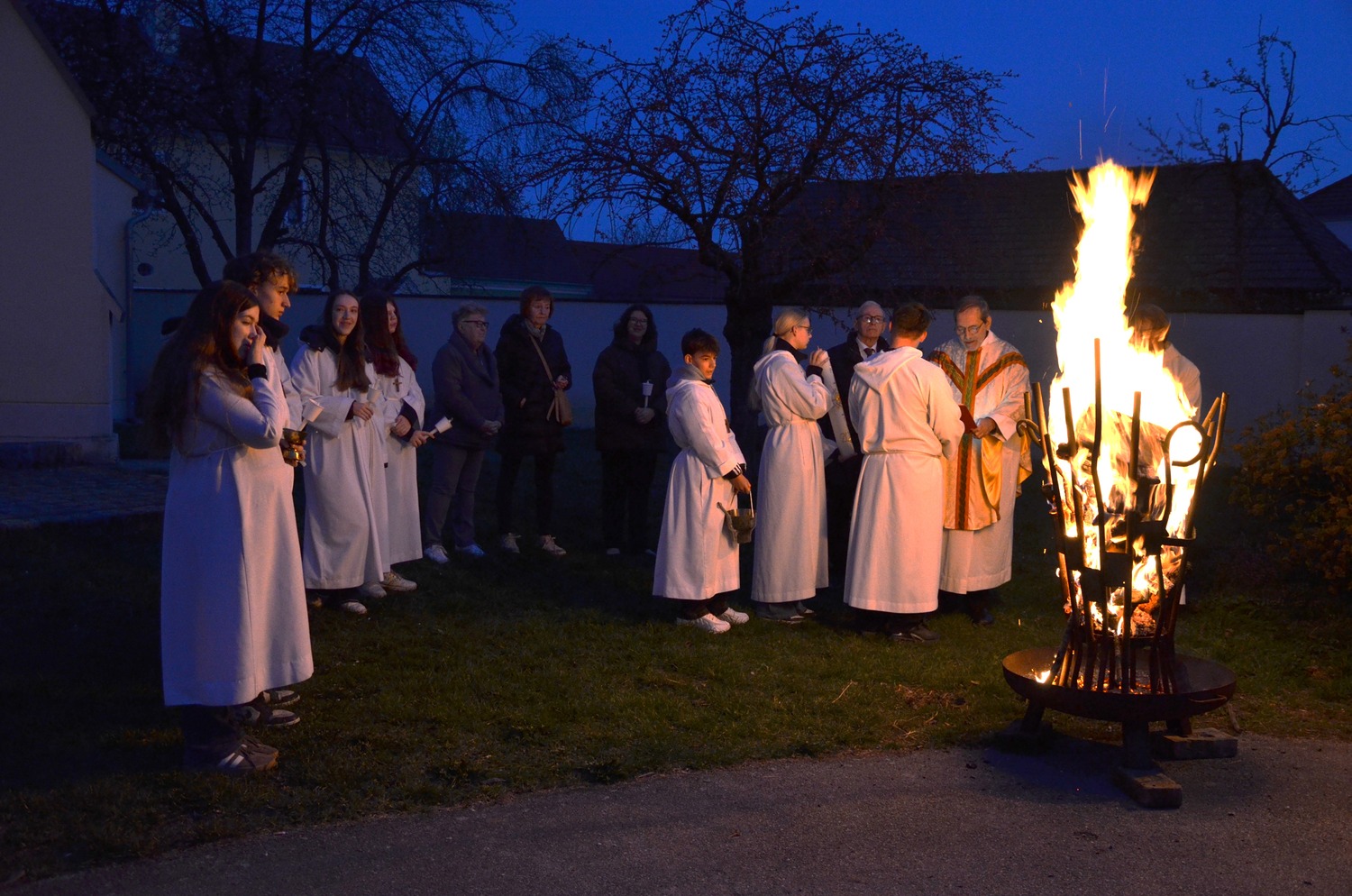 Der Ostersonntag – die Auferstehungsmesse – begann um 6 Uhr Früh mit einem Osterfeuer hinter der Kirche. Die entzündete wunderschöne Osterkerze, gestaltet von den Firmkandidatinnen in der Kreativgruppe, wurde in die Kirche getragen und dort die feierliche Auferstehung von Jesus Christus in der Kirche gefeiert.