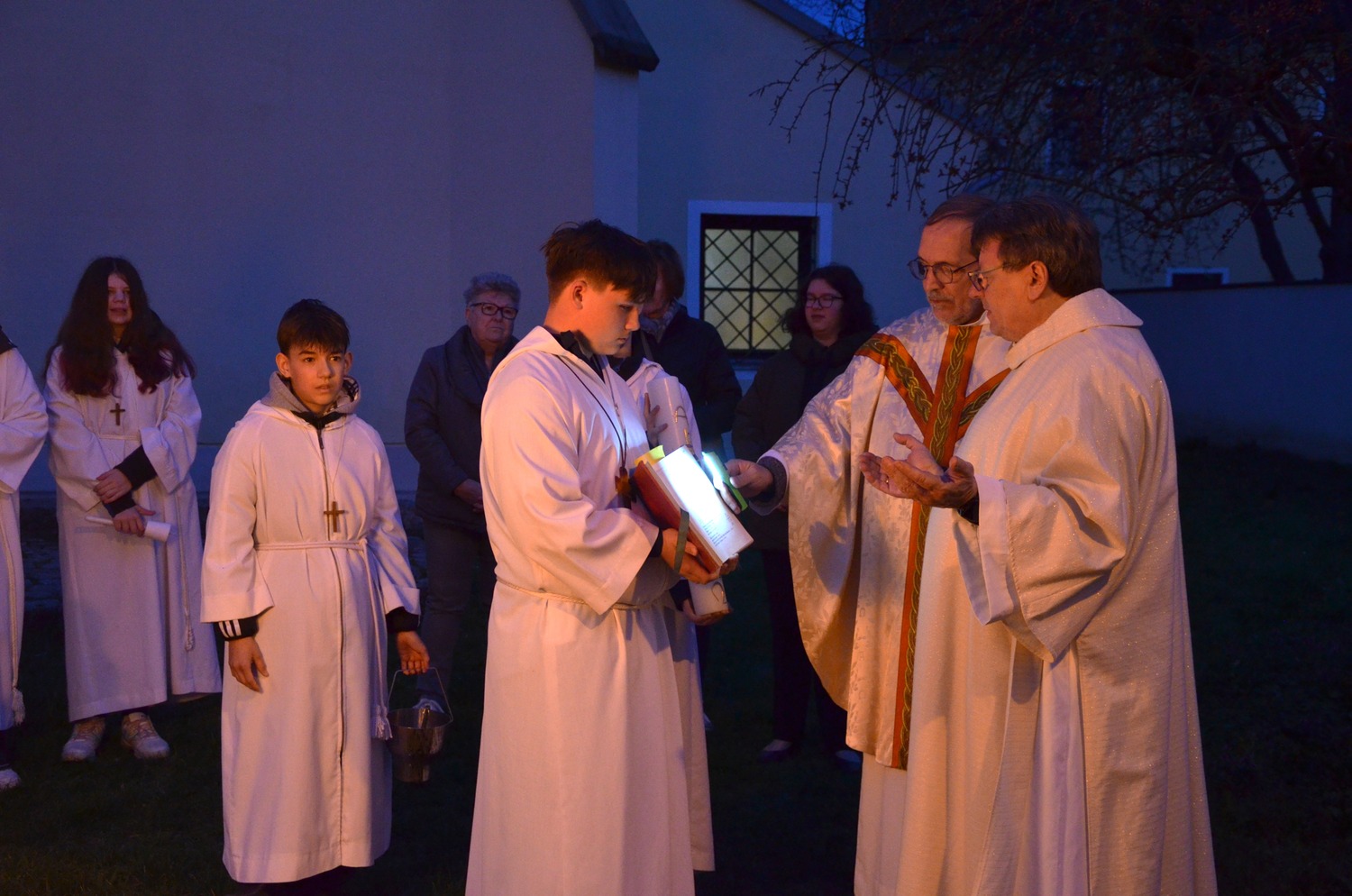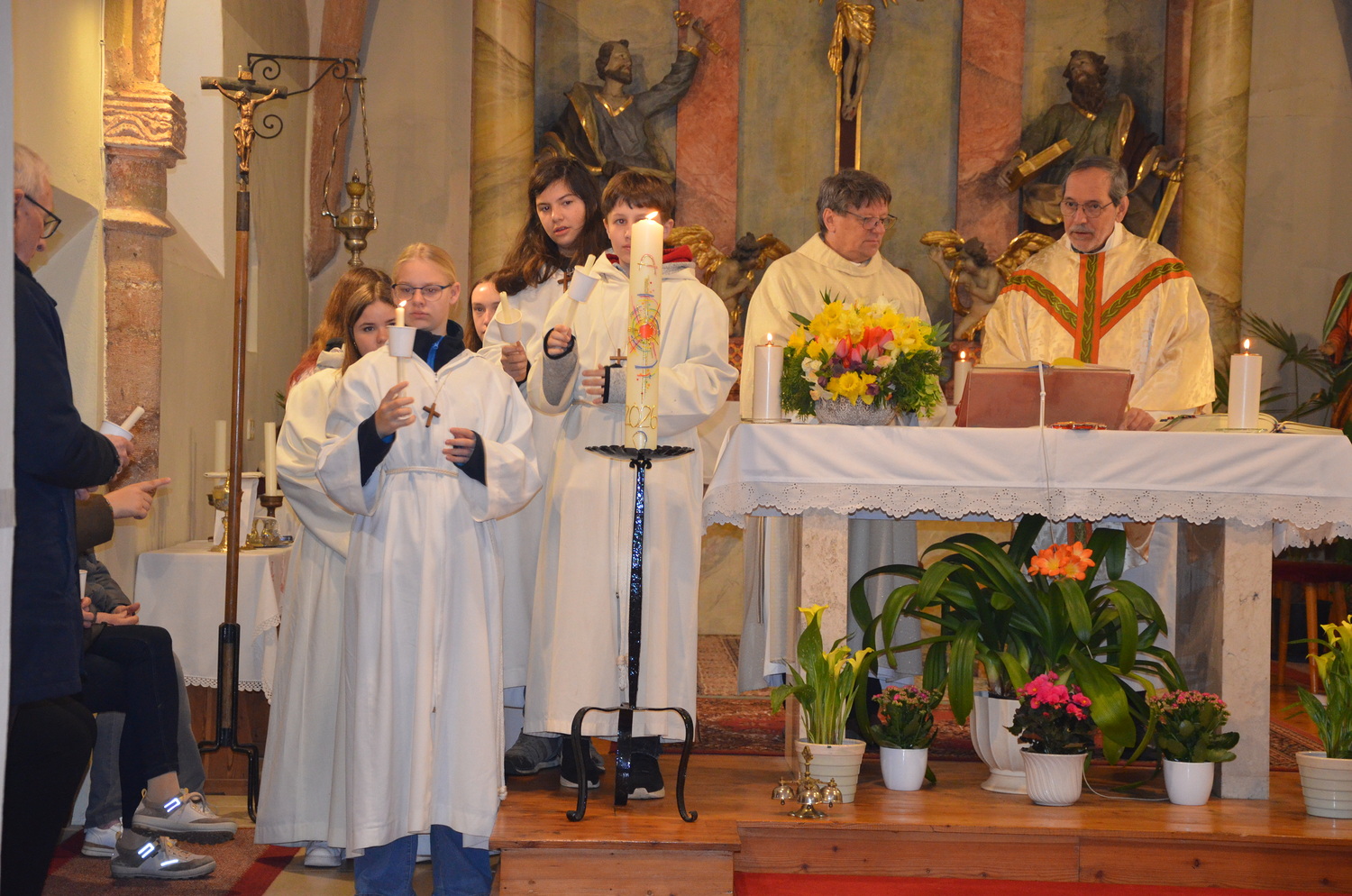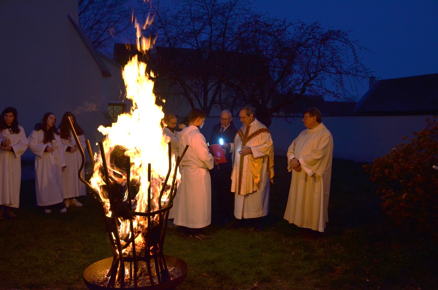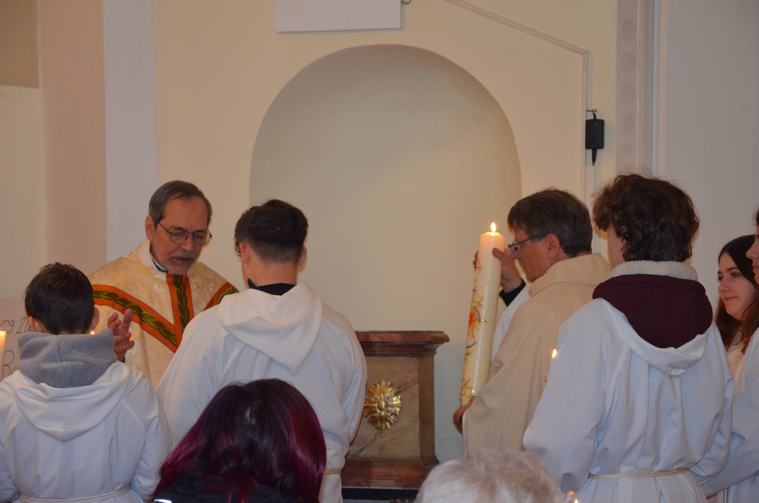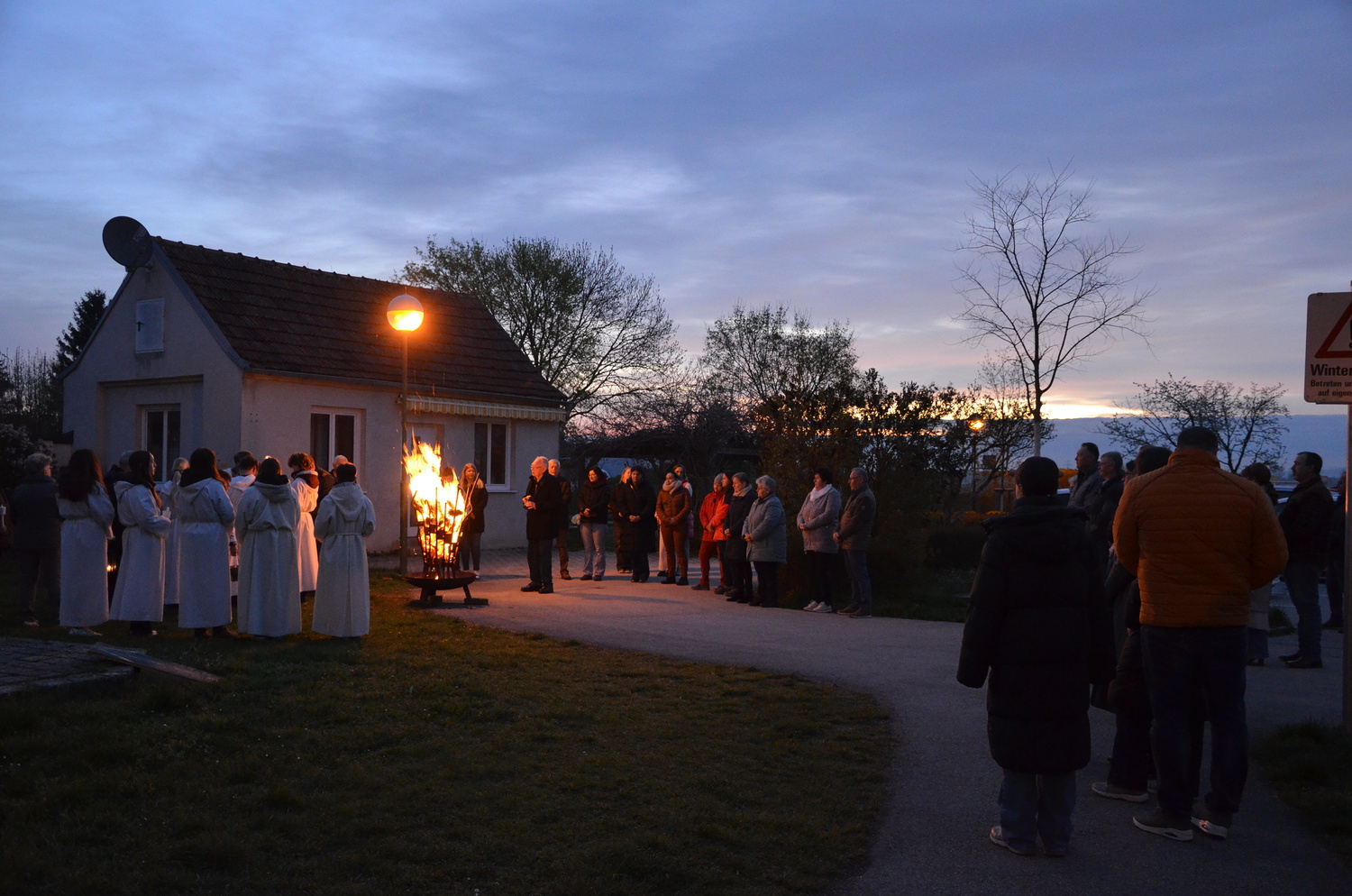 Der Ostersonntag – die Auferstehungsmesse – begann um 6 Uhr Früh mit einem Osterfeuer hinter der Kirche. Die entzündete wunderschöne Osterkerze, gestaltet von den Firmkandidatinnen in der Kreativgruppe, wurde in die Kirche getragen und dort die feierliche Auferstehung von Jesus Christus in der Kirche gefeiert.