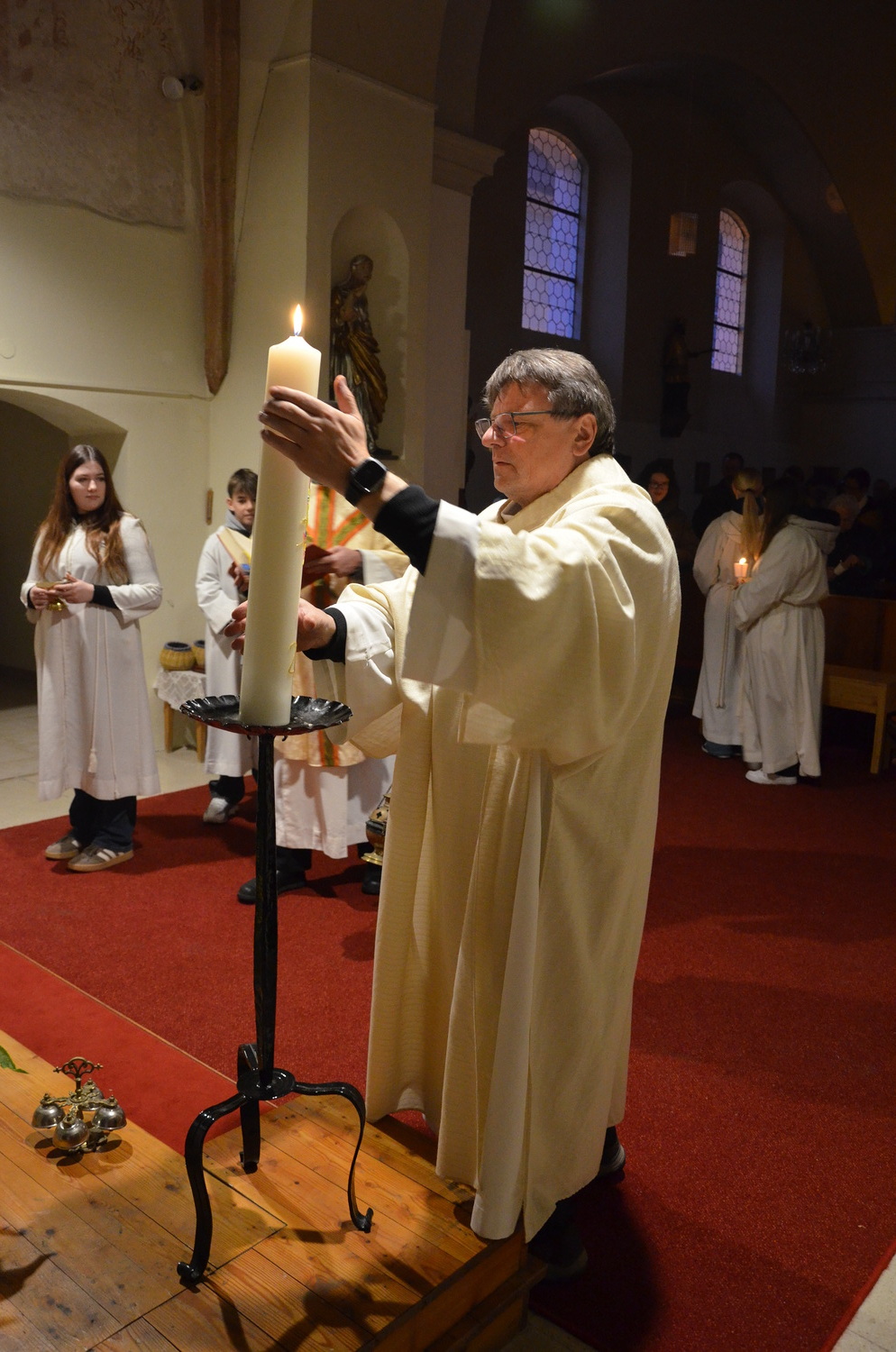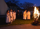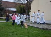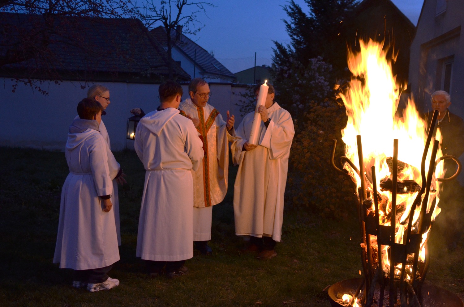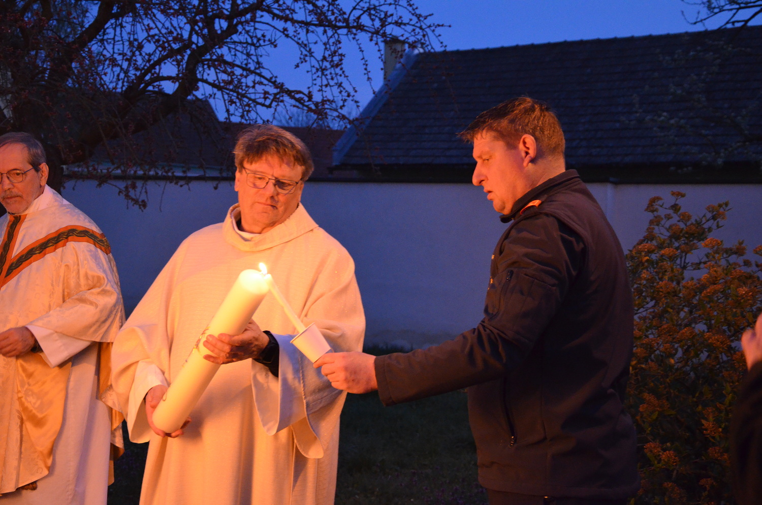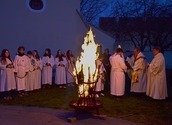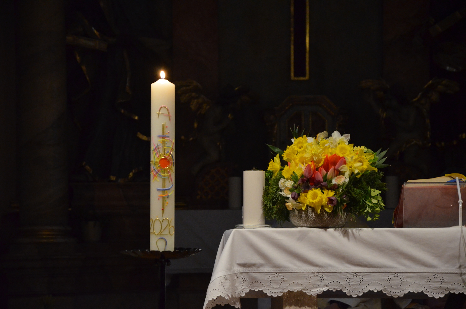 Der Ostersonntag – die Auferstehungsmesse – begann um 6 Uhr Früh mit einem Osterfeuer hinter der Kirche. Die entzündete wunderschöne Osterkerze, gestaltet von den Firmkandidatinnen in der Kreativgruppe, wurde in die Kirche getragen und dort die feierliche Auferstehung von Jesus Christus in der Kirche gefeiert.