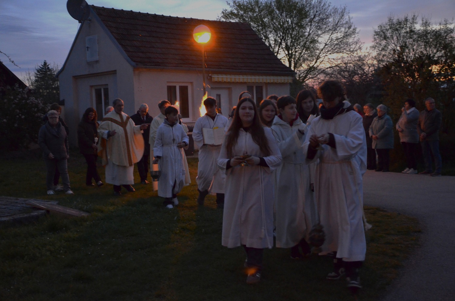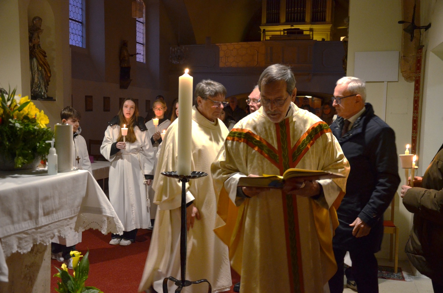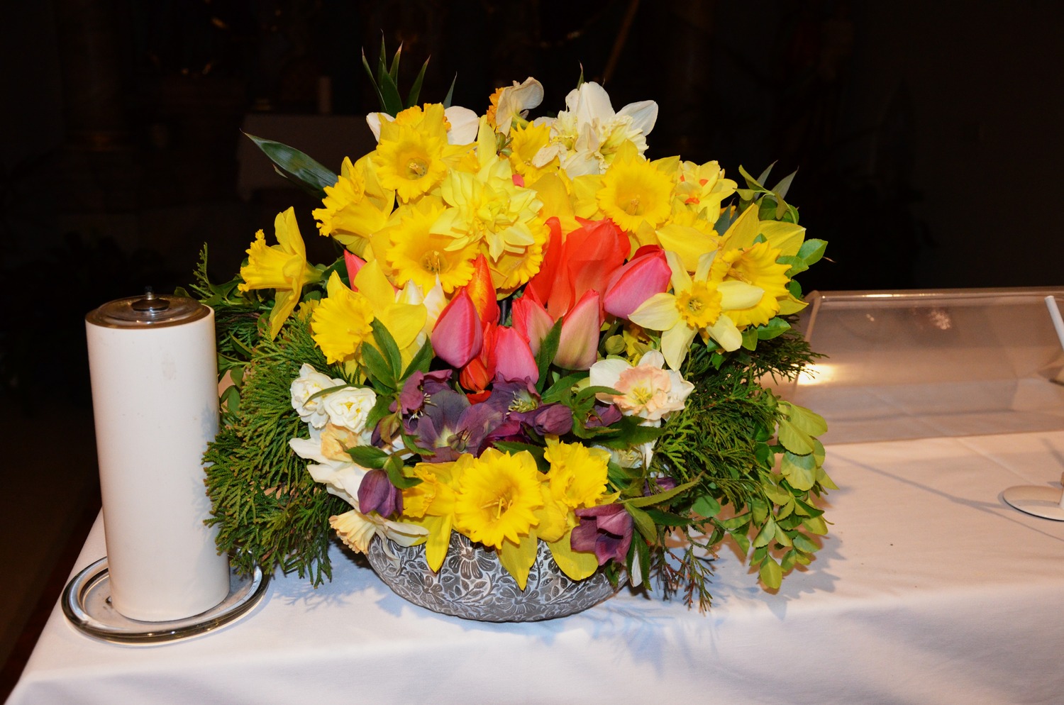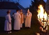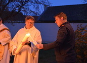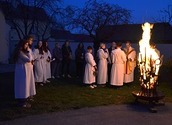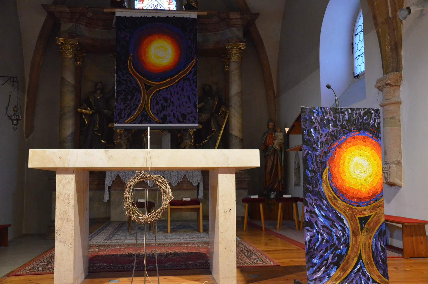 Der Ostersonntag – die Auferstehungsmesse – begann um 6 Uhr Früh mit einem Osterfeuer hinter der Kirche. Die entzündete wunderschöne Osterkerze, gestaltet von den Firmkandidatinnen in der Kreativgruppe, wurde in die Kirche getragen und dort die feierliche Auferstehung von Jesus Christus in der Kirche gefeiert.
