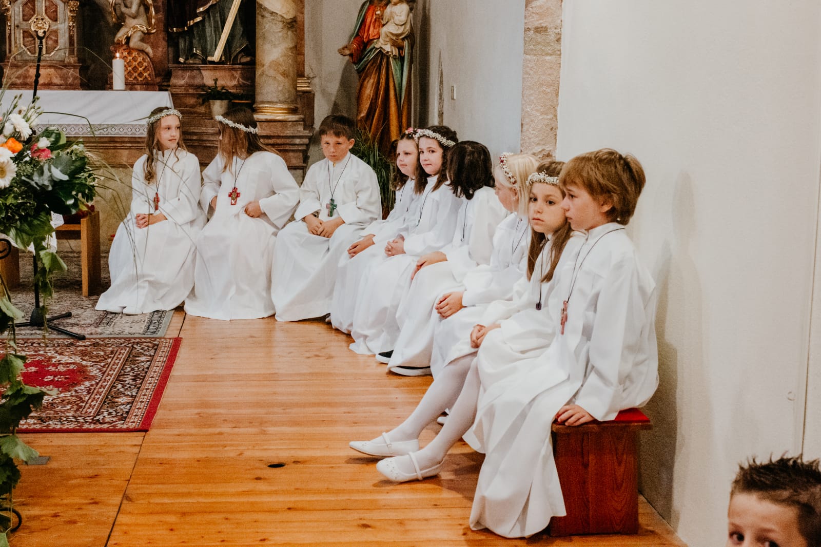Die Kirche erinnert mit der Eucharistie an das Wort Christi: "Wer mein Fleisch isst und mein Blut trinkt, der bleibt in mir und ich bleibe in ihm." (Joh 6,56) Die Eucharistie ist die sammelnde Mitte der Kirche, Quelle und Gipfel all ihres Tuns. Bei der Erstkommunion empfangen die Getaufen zum ersten Mal das Sakrament der Eucharistie, sie empfangen zum ersten Mal den "Leib Christi" in der Gestalt des Brotes. Damit sind sie Teil der "Communio", der Tischgemeinschaft. Die Eucharistie gehört - zusammen mit Taufe und Firmung - zu den Sakramenten der Aufnahme in die Kirche. Im Herbst werden die Eltern mit Kindern in der 2. Klasse Volksschule zu einem Informationsabend für die Erstkommunion eingeladen. Die Vorbereitungsstunden mit den Erstkommunionkindern beginnen dann anschließend und dauern bis zur Erstkommunion. Hauptverantwortlich für die Vorbereitung zur Erstkommunion ist Frau Angelika Eberand (0660/356 44 07), die von Tischmüttern und Tischvätern unterstützt wird.