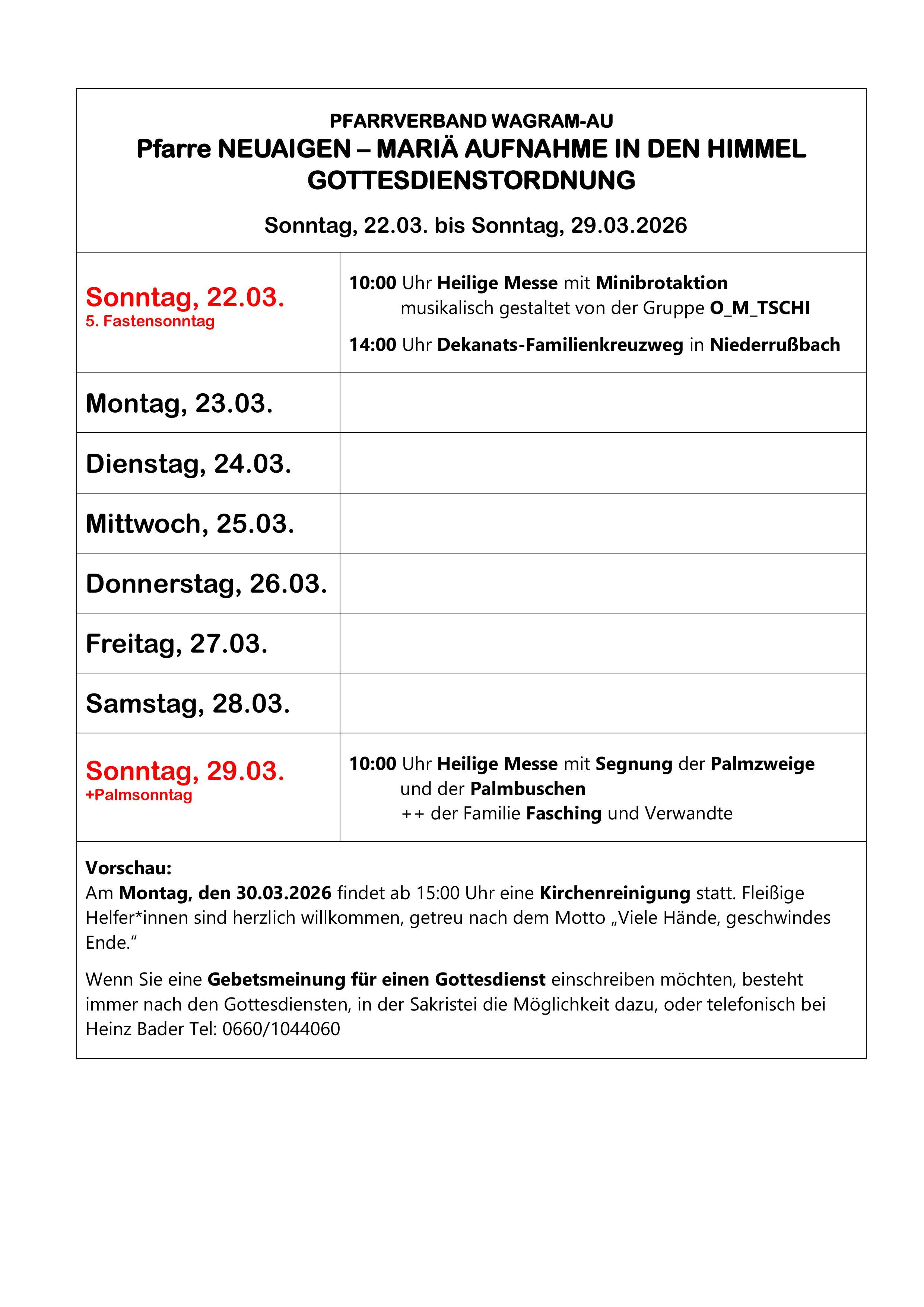 Sollten Sie Einladungen oder Informationen zu den Pfarraktivitäten per WhatsApp wünschen, melden Sie sich bitte beim Homepageteam (Fam. Wachter, Fam. Stach).