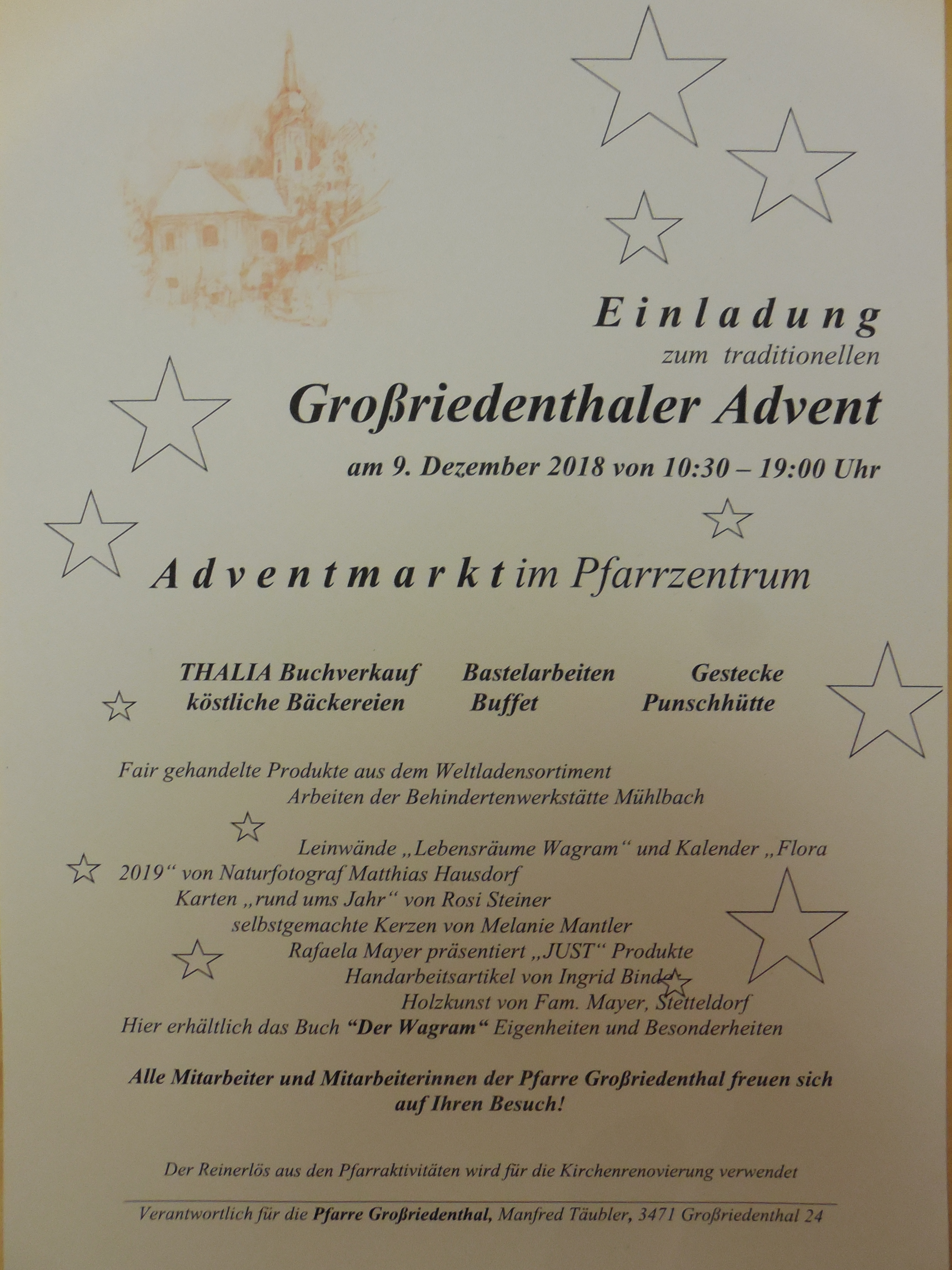Am Sonntag, den 9. Dezember 2018 veranstaltet die Pfarre Großriedenthal von 10:30 Uhr bis 19 Uhr wieder einen Adventmarkt im Pfarrzentrum. Im Angebot sind Bücher, Bastelarbeiten, Gestecke, Bäckereien, Buffet und Punschhütte.